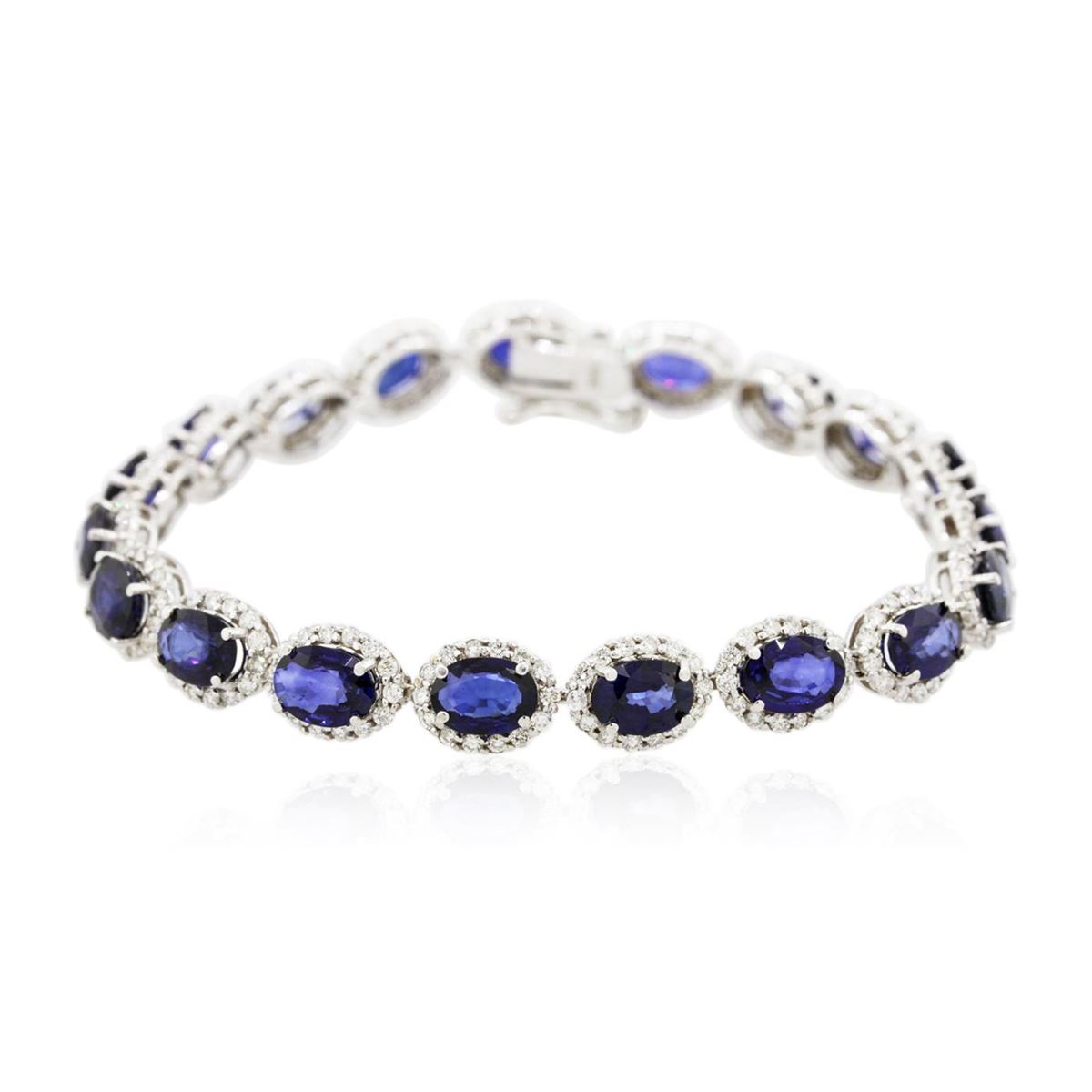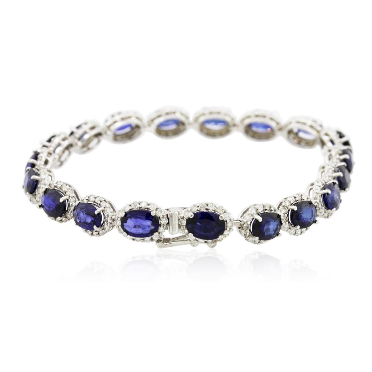 One electronically tested 14KT white gold ladies combination cast & assembled bracelet with a hidden box clasp with a bright polish finish. Measurements: 7.25" in length. Identified with markings of "14K". Condition is new. Containing: Nineteen prong set oval modified brilliant cut natural blue sapphires, measuring 7.08 x 5.13 x 2.38mm, approximate total weight of 13.49ct., clarity is slightly included, type II, medium, moderately strong, blue color, (GIA B 5/4), cut is good. Two Hundred Sixty-Six prong set round brilliant cut diamonds, measuring 1.20 - 1.20 x 0.72mm (depth est.) approximate total weight of 266 Stones = 1.68ct. Clarity: SI-2 to I-1. Color: I - J, Cut is Good. Colored gemstones are presumed to have been subjected to commonly used enhancement processes. All diamonds and colored gemstones are graded in the mounting, unless otherwise stated. Total Weight of Colored Stones 13.49ct. Total Weight of Diamonds 1.68ct. Total Weight of Bracelet 16.10 grams. GGL Appraised at $14,330.00.