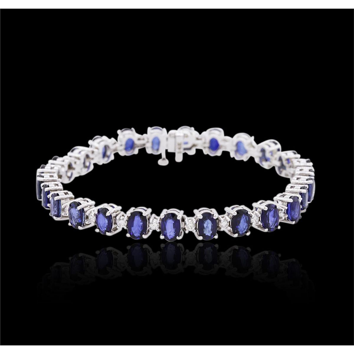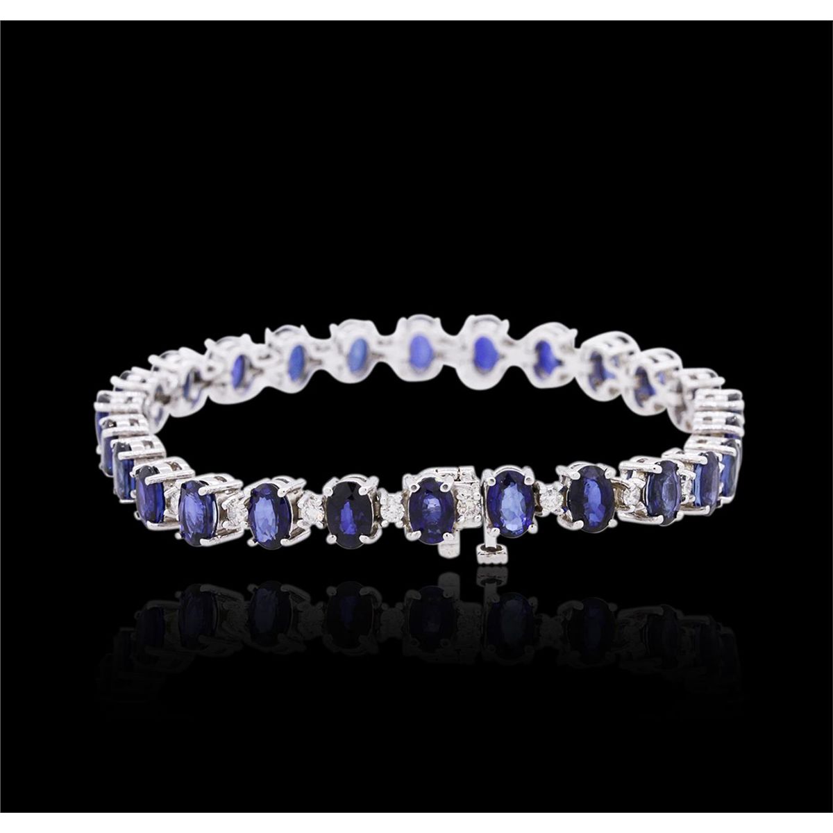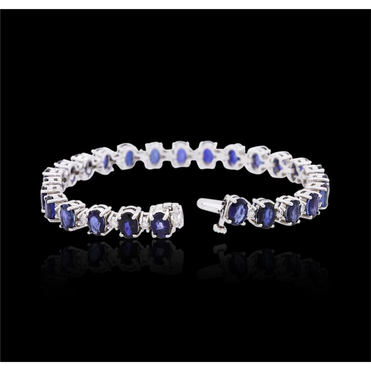 One electronically tested 14KT white gold ladies combination cast & assembled sapphire and diamond bracelet with a hidden box clasp with a bright polish finish. The bracelet measures 7" long. Identified with markings of "14K". Condition is new. Containing: Twenty-six prong set oval modified brilliant cut natural blue sapphires, measuring 6.00 x 4.00 x 2.60mm, approximate total weight of 13.52ct., clarity is eye clean, type II, medium, moderately strong, blue color, (GIA B 5/4), cut is good. Twenty-Six prong set round brilliant cut diamonds, measuring 1.90 - 1.90 x 1.14mm (depth est.) approximate total weight of 26 Stones = 0.65ct. Clarity: SI-2 to I-1. Color: J - K, Cut is Good. All diamonds and colored gemstones are graded in the mounting, unless otherwise stated, Colored gemstones are presumed to have been subjected to commonly used enhancement processes. Total Weight of Colored Stones 13.52ct. Total Weight of Diamonds 0.65ct. Total Weight of Bracelet 18.60 grams. GGL Appraised at $9,545.00.