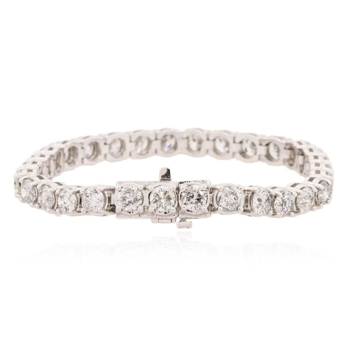 One electronically tested 14KT white gold ladies cast & assembled diamond tennis bracelet with a bright polish finish. Seven inch length bracelet composed of a flexible ribbon of diamonds, terminating in a concealed clasp with safety bar. Identified with markings of "14K". Condition is new, good workmanship. Tennis bracelets & necklaces got their unusual name from an incident involving the U.S. professional tennis player Chris Evert during a tennis match in the 1980's. Evert had been wearing an expensive diamond bracelet, an inline string of individually-set diamonds. Previously these bracelets were known as eternity bracelets. When the clasp snapped during play, she asked the officials to stop the tennis match until the bracelet could be found. Since that day, bracelets and necklaces featuring an inline string of diamonds have been called tennis bracelets and tennis necklaces. Containing: Eight prong set round brilliant cut diamonds, measuring 5.30 - 5.10 x 3.20mm (depth est.) approximate total weight of 8 Stones = 4.32ct. Graded in the setting. Clarity: I-1 to I-2. Color: H - J. Twenty-Two prong set round brilliant cut diamonds, measuring 4.90 - 4.70 x 2.95mm (depth est.) approximate total weight of 22 Stones = 9.22ct. Graded in the setting. Clarity: I-1 to I-2. Color: H - J. Total Weight of Diamonds 13.54ct. Total Weight of Tennis Bracelet 23.28 grams. AIG Appraised at $45,675.00.