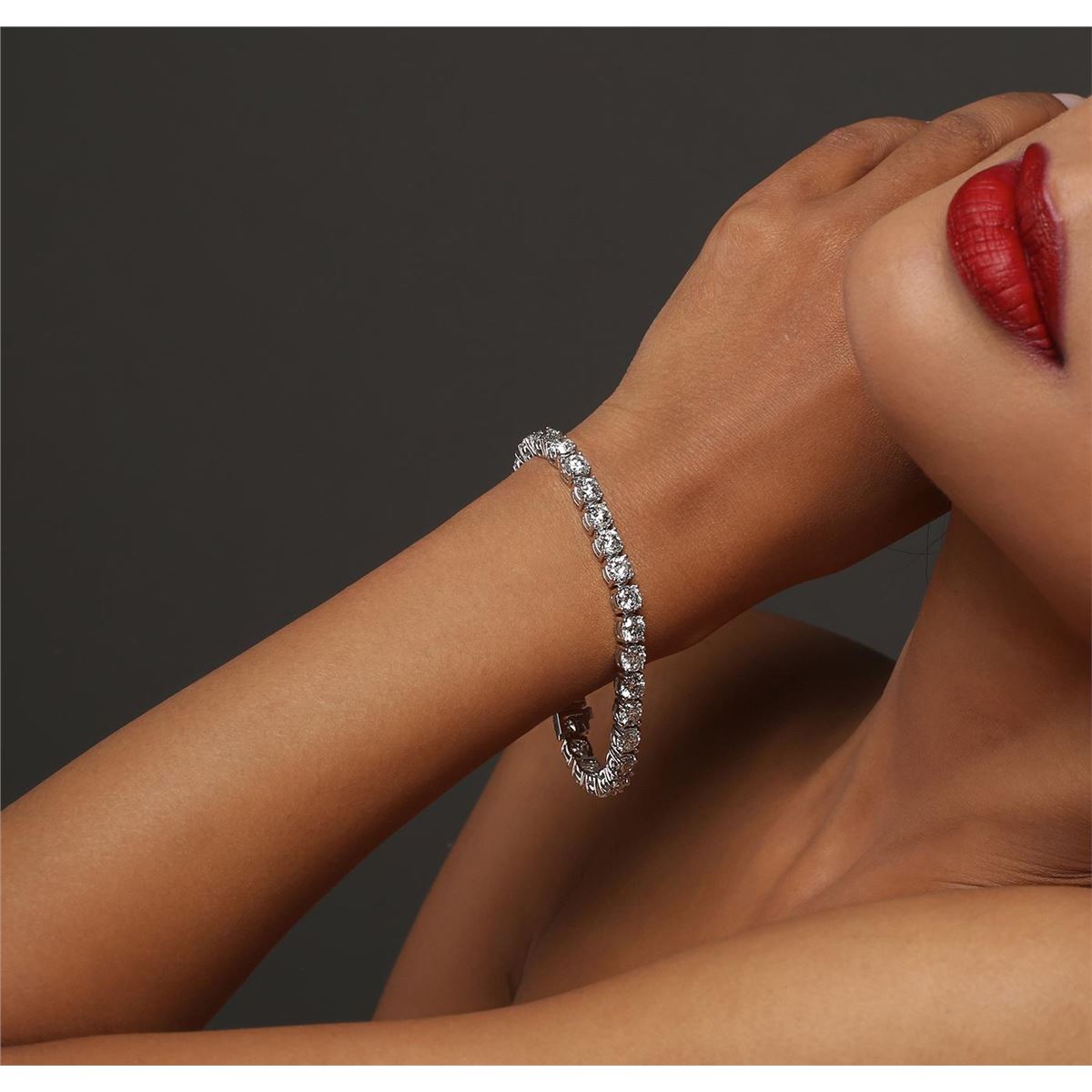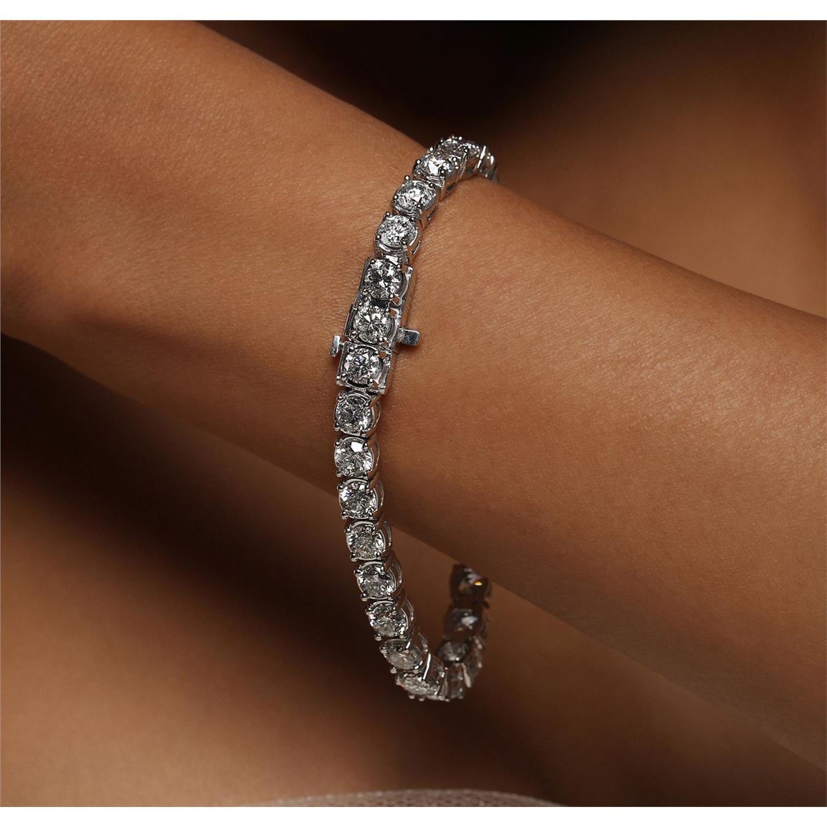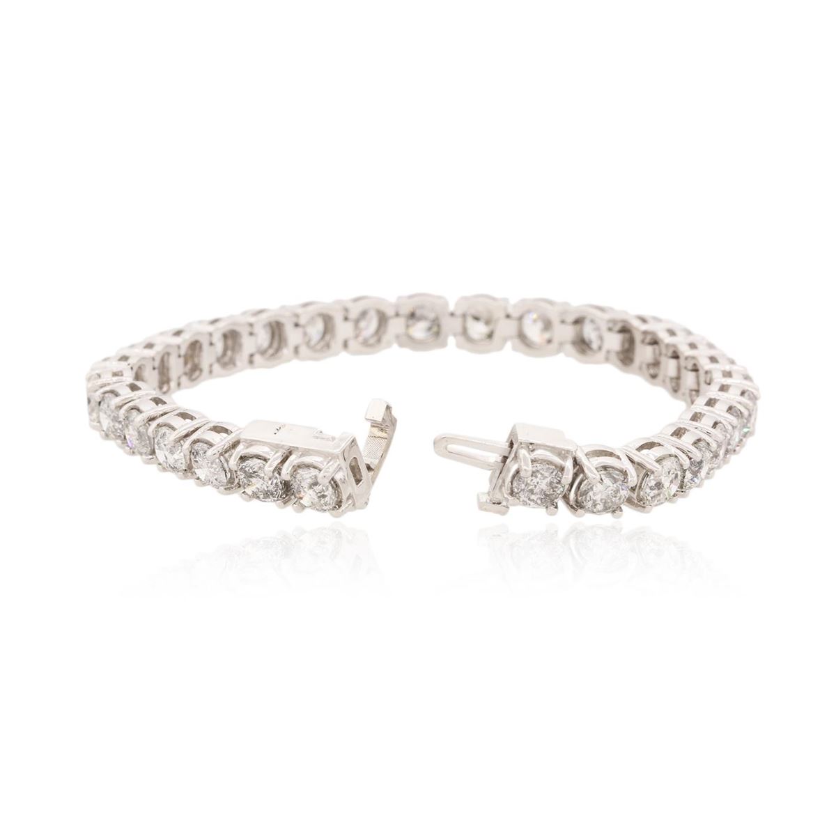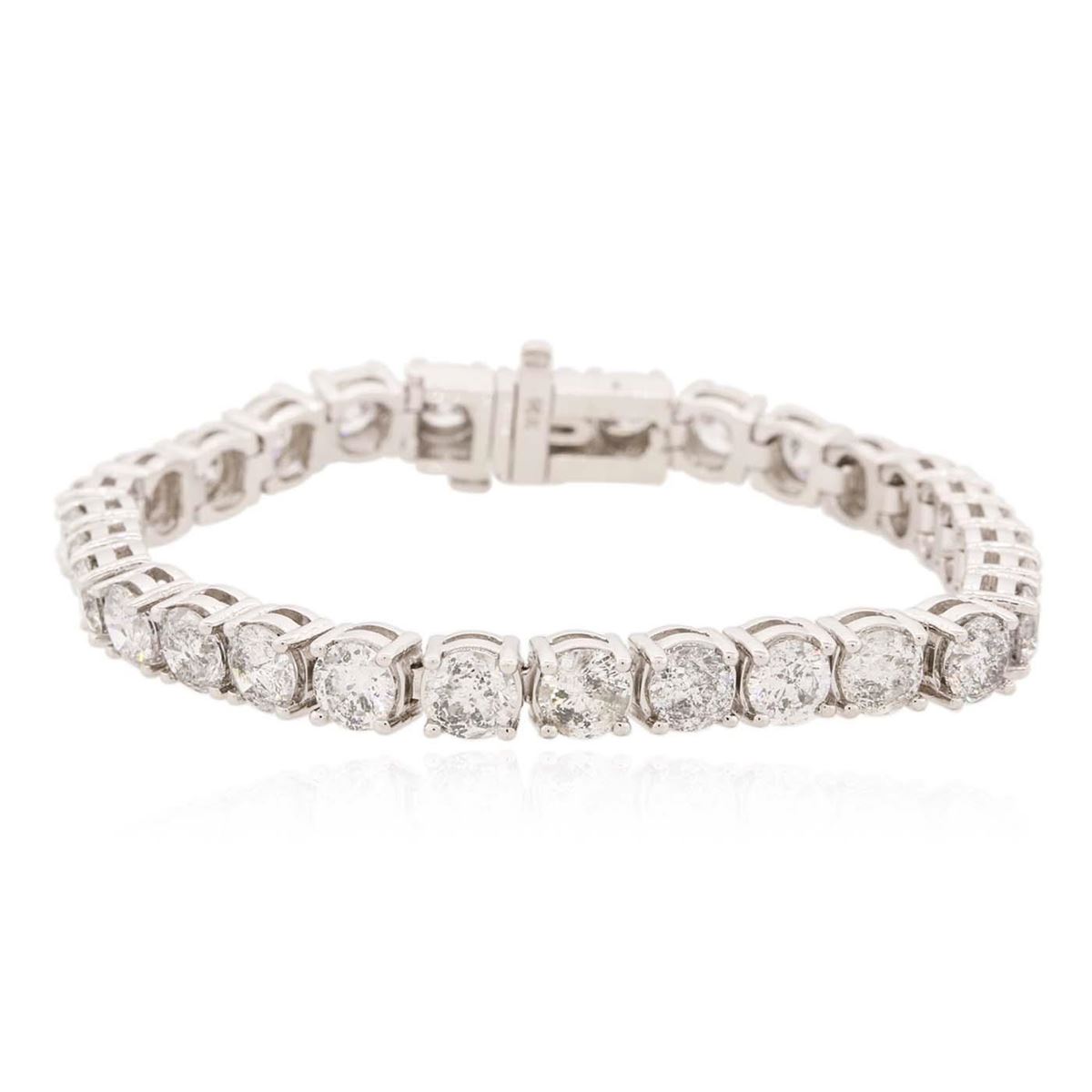 One electronically tested 14KT white gold ladies cast & assembled diamond tennis bracelet with a bright polish finish. Seven inch length bracelet composed of a flexible ribbon of diamonds, terminating in a concealed clasp with safety bar. Identified with markings of "14K". Condition is new, good workmanship. Tennis bracelets & necklaces got their unusual name from an incident involving the U.S. professional tennis player Chris Evert during a tennis match in the 1980's. Evert had been wearing an expensive diamond bracelet, an inline string of individually-set diamonds. Previously these bracelets were known as eternity bracelets. When the clasp snapped during play, she asked the officials to stop the tennis match until the bracelet could be found. Since that day, bracelets and necklaces featuring an inline string of diamonds have been called tennis bracelets and tennis necklaces. Containing: Eight prong set round brilliant cut diamonds, measuring 5.30 - 5.10 x 3.20mm (depth est.) approximate total weight of 8 Stones = 4.32ct. Graded in the setting. Clarity: I-1 to I-2. Color: H - J. Twenty-Two prong set round brilliant cut diamonds, measuring 4.90 - 4.70 x 2.95mm (depth est.) approximate total weight of 22 Stones = 9.22ct. Graded in the setting. Clarity: I-1 to I-2. Color: H - J. Total Weight of Diamonds 13.54ct. Total Weight of Tennis Bracelet 23.28 grams. AIG Appraised at $45,675.00.