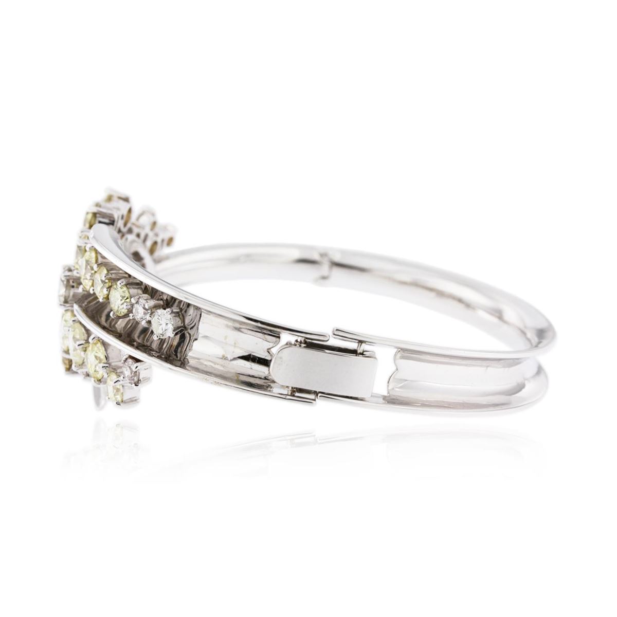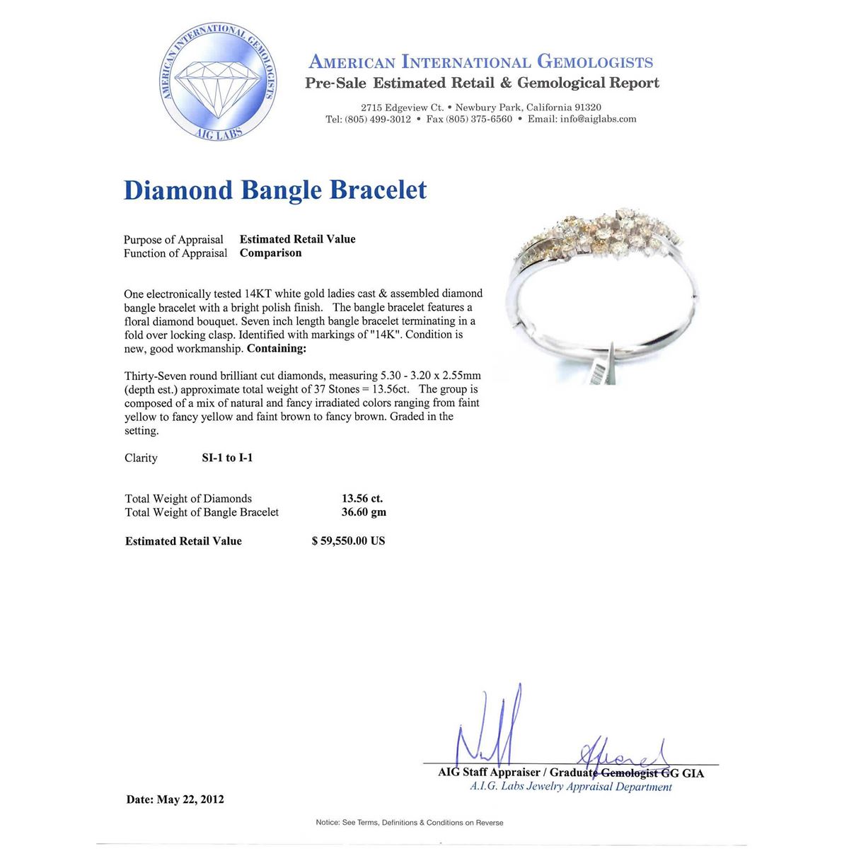 One electronically tested 14KT white gold ladies cast & assembled diamond bangle bracelet with a bright polish finish. The bangle bracelet features a floral diamond bouquet. Seven inch length bangle bracelet terminating in a fold over locking clasp. Identified with markings of "14K". Condition is new, good workmanship. Total weight of diamonds is 13.56ct. Total weight of bracelet is 36.60gm. AIG Appraised at $59,550.00.