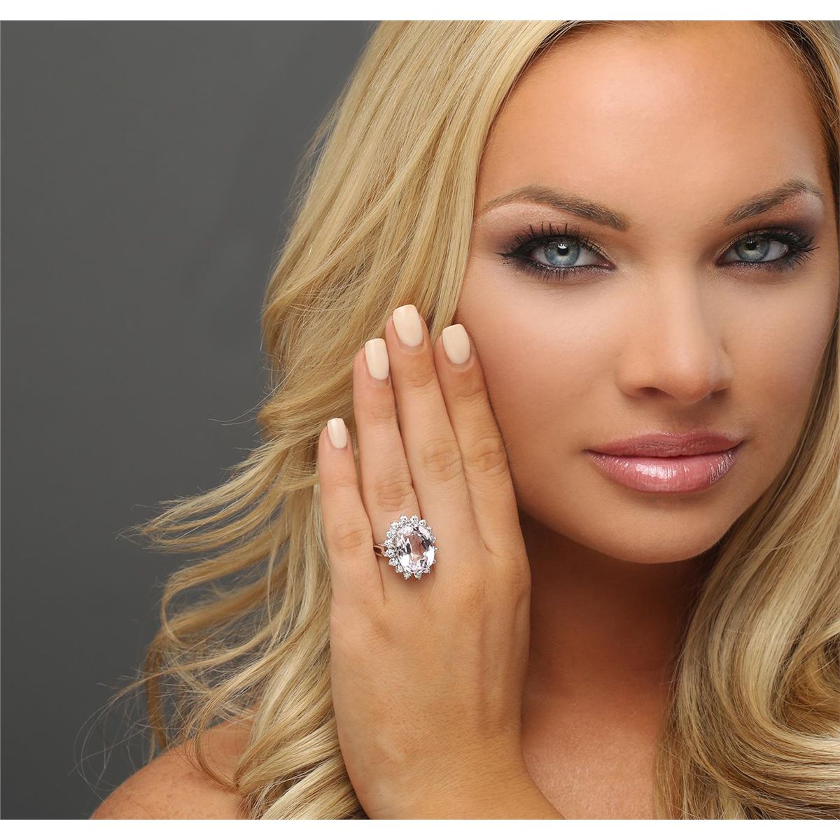 One electronically tested 14KT white gold ladies combination cast & assembled kunzite and diamond ring with a bright polish finish. Identified with markings of "14K". Condition is new. Containing: One prong set oval modified brilliant cut natural kunzite, measuring 16.87 x 12.68 x 9.84mm, approximate weight of 13.66ct., clarity is eye clean, type I, very light, slightly grayish, purple color, (GIA P 2/2), cut is good. Sixteen prong set round brilliant cut diamonds, measuring 2.50 - 2.50 x 1.50mm (depth est.) approximate total weight of 16 Stones = 0.91ct. Clarity: SI-1. Color: I - J, Cut is Good. Colored gemstones are presumed to have been subjected to commonly used enhancement processes. All diamonds and colored gemstones are graded in the mounting, unless otherwise stated. Total Weight of Colored Stones 13.66ct. Total Weight of Diamonds 0.91ct. Total Weight of Ring 9.50 grams. GGL Appraised at $4,810.00.