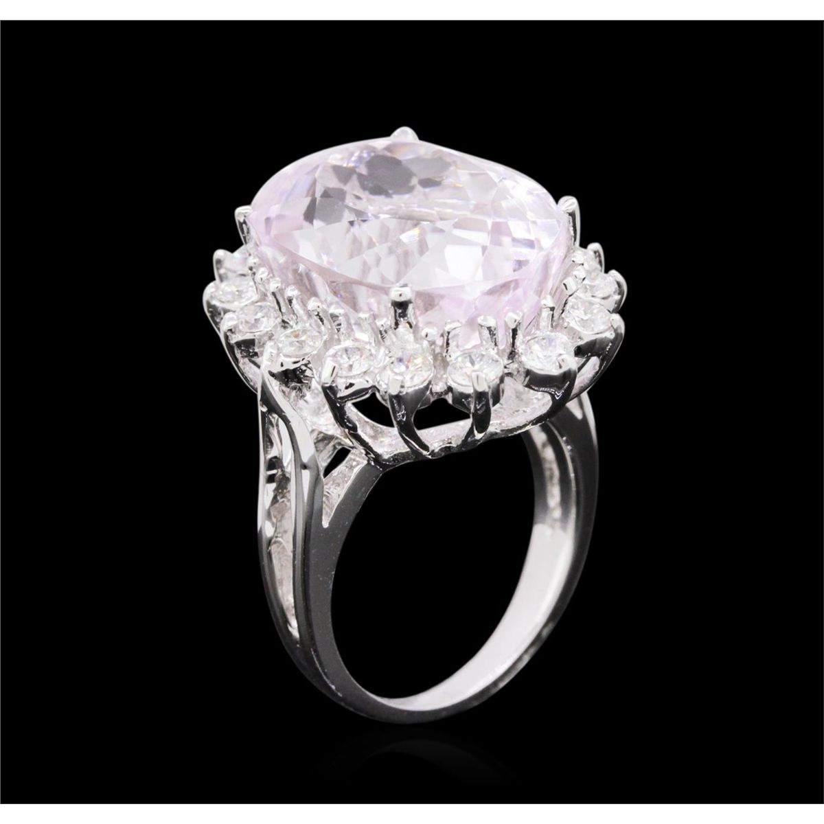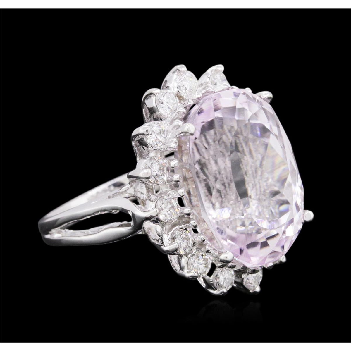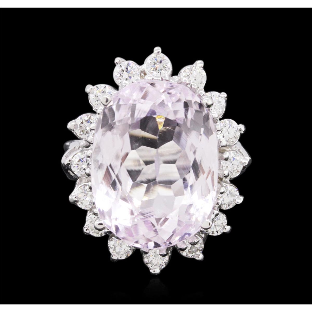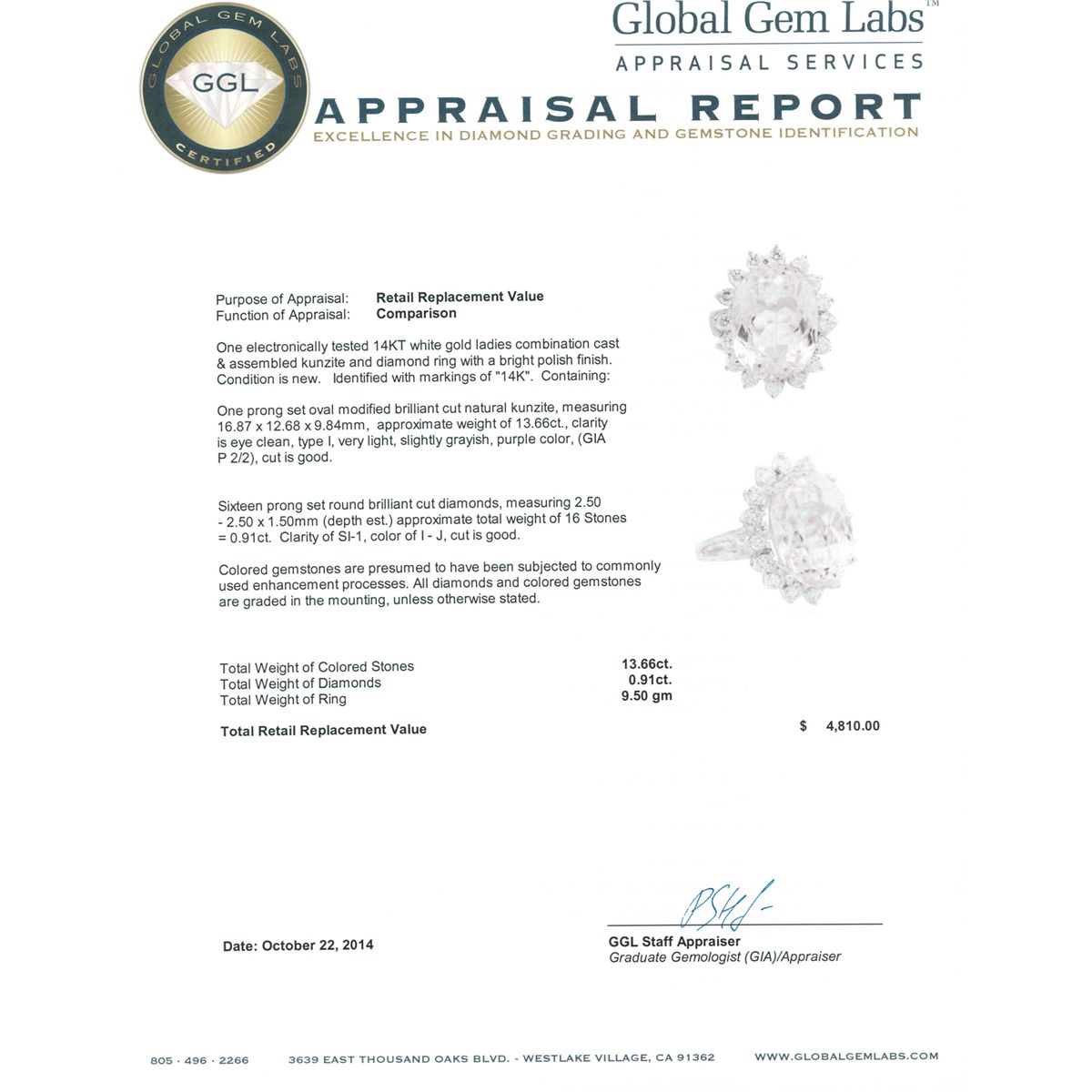 One electronically tested 14KT white gold ladies combination cast & assembled kunzite and diamond ring with a bright polish finish. Identified with markings of "14K". Condition is new. Containing: One prong set oval modified brilliant cut natural kunzite, measuring 16.87 x 12.68 x 9.84mm, approximate weight of 13.66ct., clarity is eye clean, type I, very light, slightly grayish, purple color, (GIA P 2/2), cut is good. Sixteen prong set round brilliant cut diamonds, measuring 2.50 - 2.50 x 1.50mm (depth est.) approximate total  weight of 16 Stones = 0.91ct. Clarity: SI-1. Color: I - J, Cut is Good. Colored gemstones are presumed to have been subjected to commonly used enhancement processes. All diamonds and colored gemstones are graded in the mounting, unless otherwise stated. Total Weight of Colored Stones 13.66ct. Total Weight of Diamonds 0.91ct. Total Weight of Ring 9.50 grams. GGL Appraised at $4,810.00.