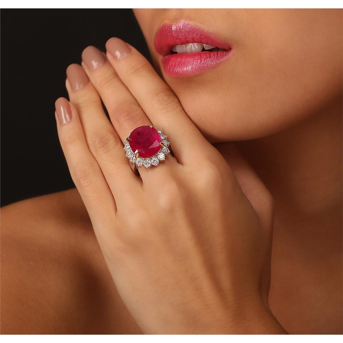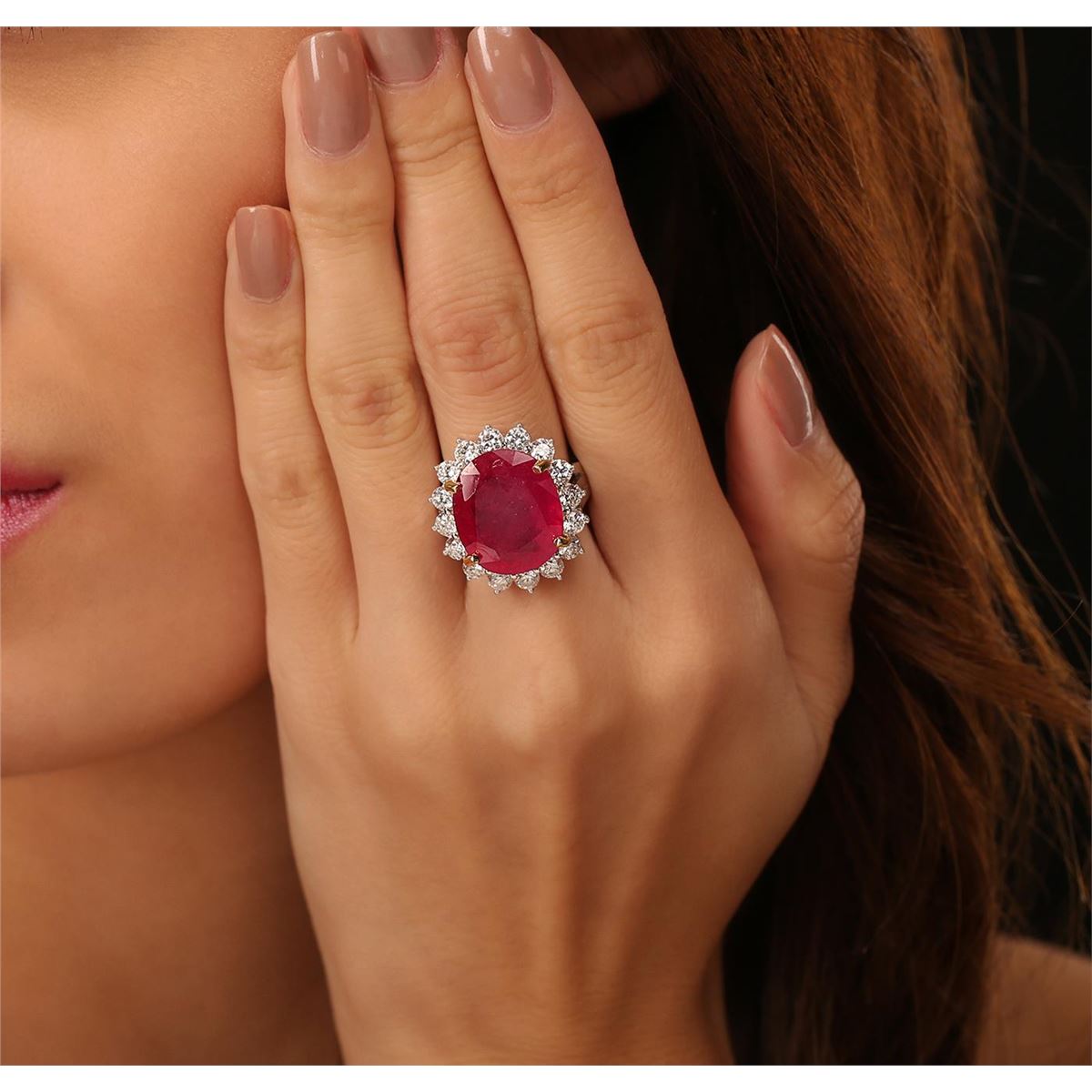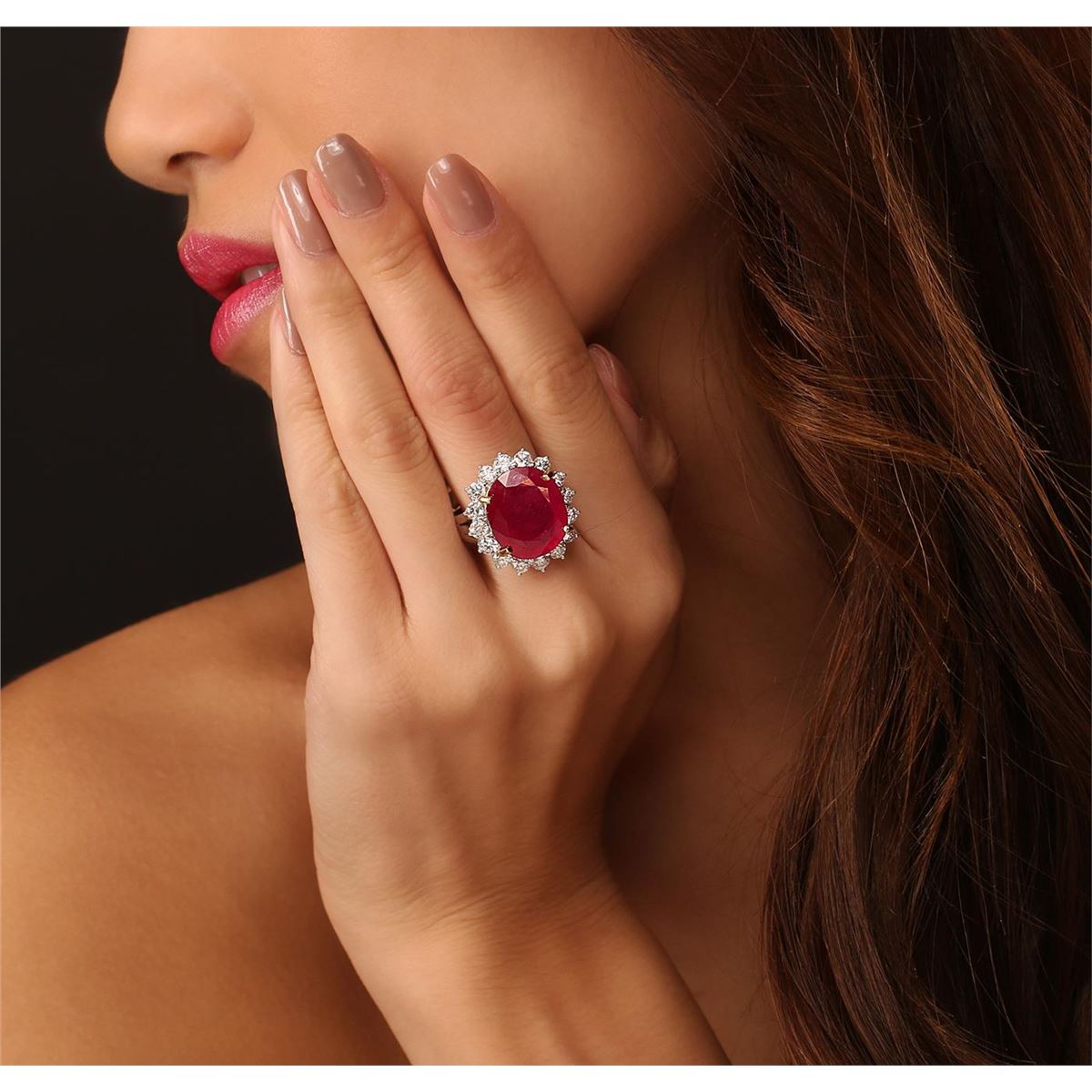One electronically tested 14KT white gold ladies cast ruby and diamond ring. The featured ruby is set within a diamond bezel, completed by a three and one-half millimeter wide band. Bright polish finish with yellow gold accents. Identified with markings of "14K". Condition is new, good workmanship. Containing: One prong set oval mixed cut natural ruby, measuring 16.80 x 14.20 x 6.50mm, 10%. bulge factor, approximate weight of 13.74ct., clarity is heavily included, type II, medium dark, moderately strong, red color, (GIA R 6/4), cut is good. Transmitting light somewhat diffusely, transparent to translucent. Naturally occurring internal & external characteristics are present. Indications of laboratory high temperature heat treatment, with glass & flux additives. Graded in the setting. Ruby has a low tolerance to rhodium plating, repolishing the surface, & ultrasonic cleaning. Sixteen prong set round brilliant cut diamonds, measuring 3.30 - 3.20 x 1.95mm (depth est.) approximate total weight of 16 Stones = 2.11ct. Graded in the setting. Clarity: SI-2 to I-1. Color: G - I. Total Weight of Colored Stones 13.74ct. Total Weight of Diamonds 2.11ct. Total Weight of Ring 11.60 grams. AIG Appraised at $10,505.00.