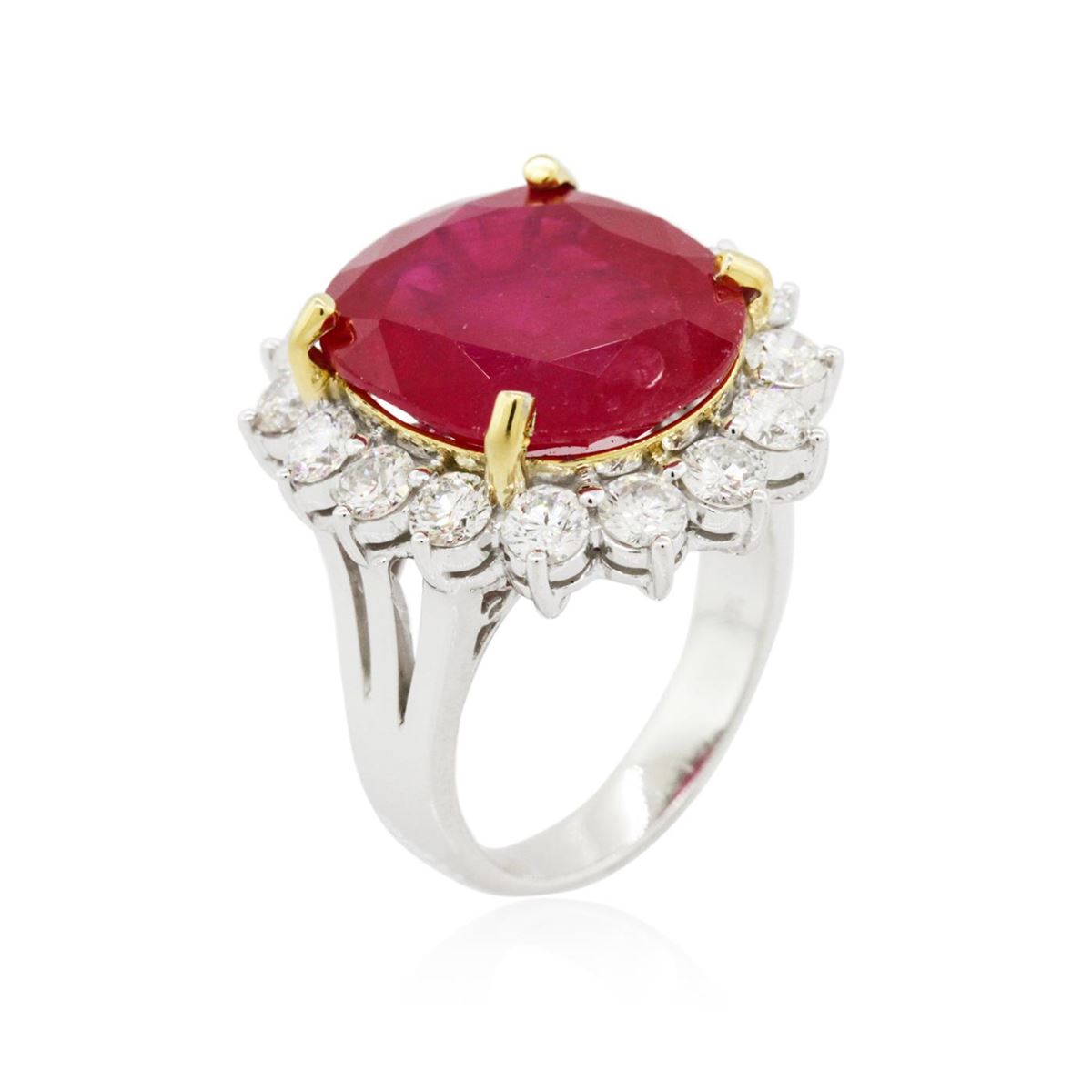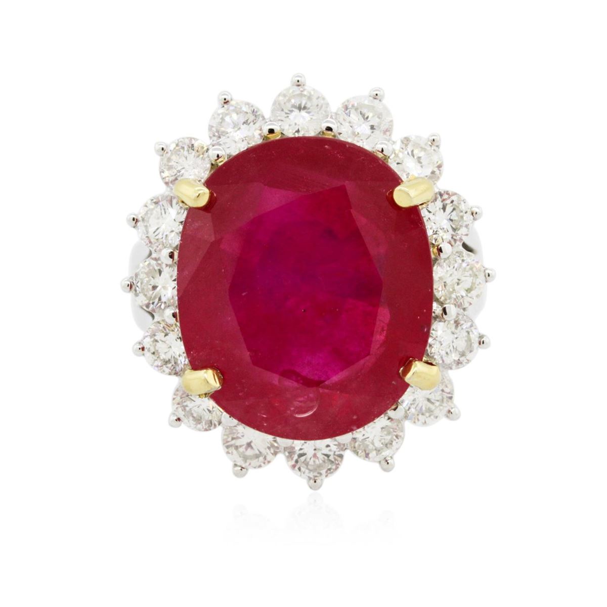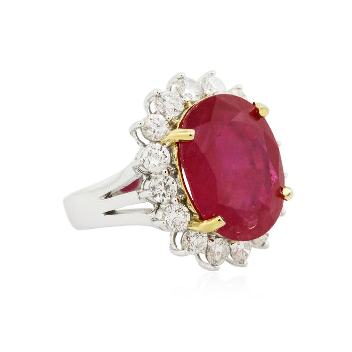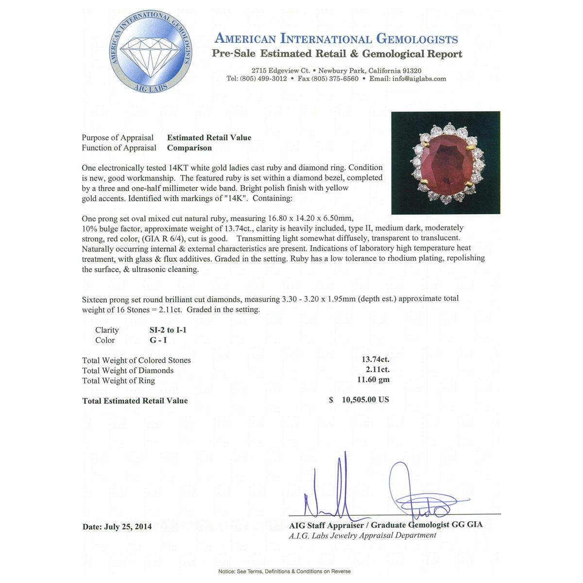 One electronically tested 14KT white gold ladies cast ruby and diamond ring. The featured ruby is set within a diamond bezel, completed by a three and one-half millimeter wide band. Bright polish finish with yellow gold accents. Identified with markings of "14K". Condition is new, good workmanship. Containing: One prong set oval mixed cut natural ruby, measuring 16.80 x 14.20 x 6.50mm, 10%. bulge factor, approximate weight of 13.74ct., clarity is heavily included, type II, medium dark, moderately strong, red color, (GIA R 6/4), cut is good. Transmitting light somewhat diffusely, transparent to translucent. Naturally occurring internal & external characteristics are present. Indications of laboratory high temperature heat treatment, with glass & flux additives. Graded in the setting. Ruby has a low tolerance to rhodium plating, repolishing the surface, & ultrasonic cleaning. Sixteen prong set round brilliant cut diamonds, measuring 3.30 - 3.20 x 1.95mm (depth est.) approximate total weight of 16 Stones = 2.11ct. Graded in the setting. Clarity: SI-2 to I-1. Color: G - I. Total Weight of Colored Stones 13.74ct. Total Weight of Diamonds 2.11ct. Total Weight of Ring 11.60 grams. AIG Appraised at $10,505.00.