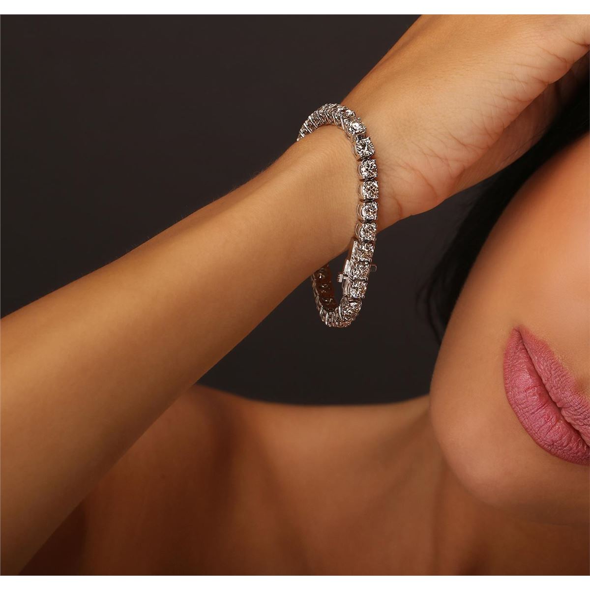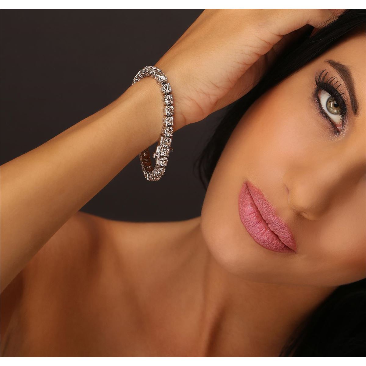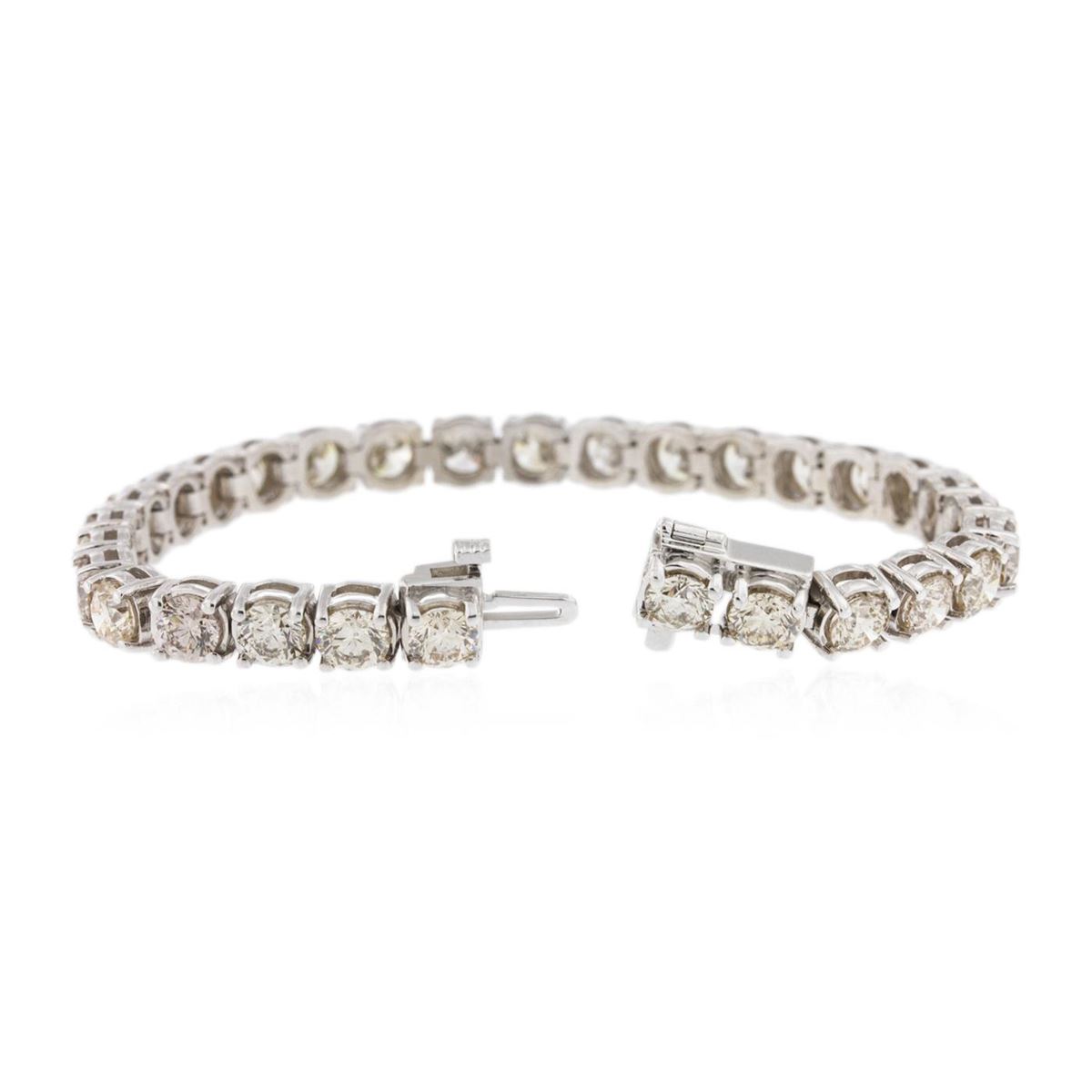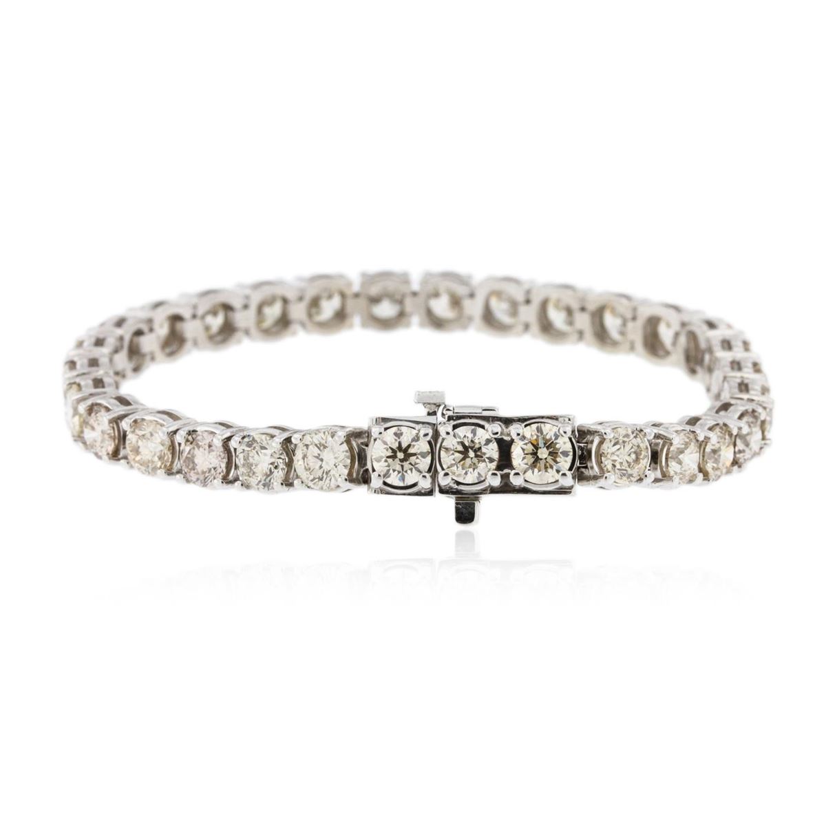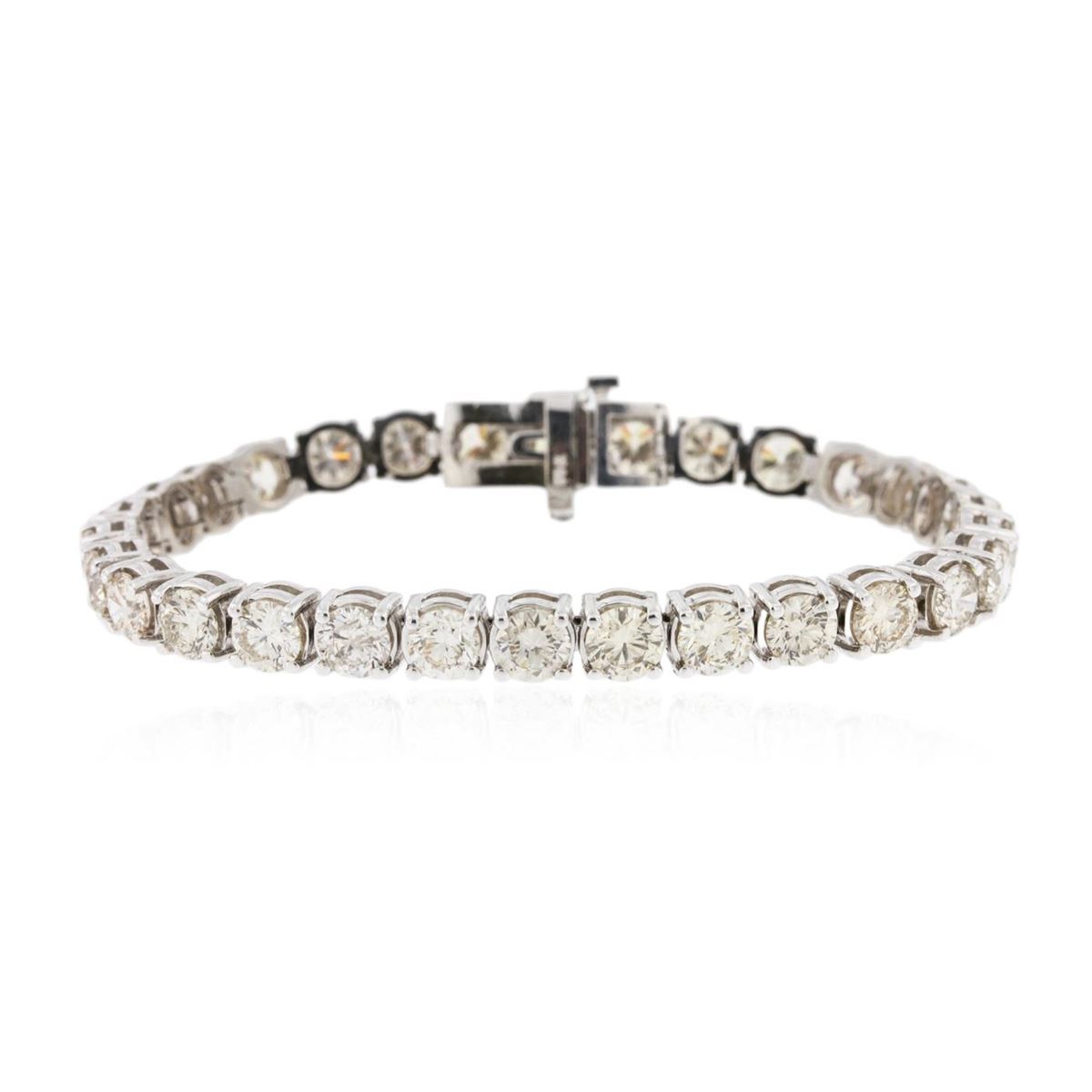One electronically tested 14KT white gold ladies cast & assembled diamond tennis bracelet with a bright polish finish. Condition is new, good workmanship. Seven inch length bracelet composed of a flexible ribbon of diamonds, terminating in a concealed clasp with safety. Identified with markings of "14K". Tennis bracelets & necklaces got their unusual name from an incident involving the U.S. professional tennis player Chris Evert during a tennis match in the 1980's. Evert had been wearing an expensive diamond bracelet, an inline string of individually-set diamonds. Previously these bracelets were known as eternity bracelets. When the clasp snapped during play, she asked the officials to stop the tennis match until the bracelet could be found. Since that day, bracelets and necklaces featuring an inline string of diamonds have been called tennis bracelets and tennis necklaces. Containing: Thirty prong set round brilliant cut diamonds, measuring 5.00 - 4.90 x 3.05mm (depth est.) approximate. Total Weight of 30 Stones = 13.77ct. Color grade is an average for the group. Graded in the setting. Clarity: SI-1 to I-1. Total Weight of Diamonds 13.77ct. Total Weight of Tennis Bracelet 22.39 grams. AIG Appraised at $57,020.00.
