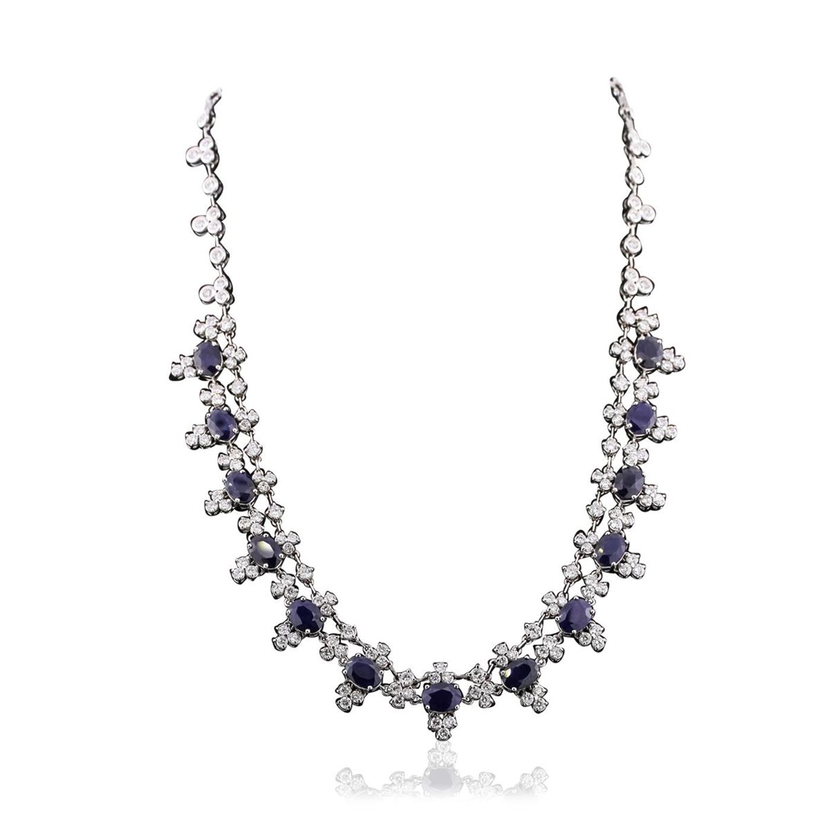 One electronically tested 14KT white gold ladies combination cast & assembled necklace with a hidden box clasp with a bright polish finish. Measurements: 16" in length. Identified with markings of "K14". Condition is new. Containing: Thirteen prong set oval modified brilliant cut natural blue sapphires, measuring 8.13 x 5.92 x 2.69mm, approximate total weight of 13.78ct., clarity is heavily included, type II, dark, moderately strong, blue color, (GIA B 7/4), cut is good. Eighty prong set round brilliant cut diamonds, measuring 2.50 - 1.80 x 1.29mm (depth est.) approximate total weight of 80 Stones = 2.90ct. Clarity: SI-1 to I-1. Color: H - J, Cut is Good. Colored gemstones are presumed to have been subjected to commonly used enhancement processes. All diamonds and colored gemstones are graded in the mounting, unless otherwise stated. Total Weight of Colored Stones 13.78ct. Total Weight of Diamonds 2.90ct. Total Weight of Necklace 37.30 grams. GGL Appraised at $25,040.00.