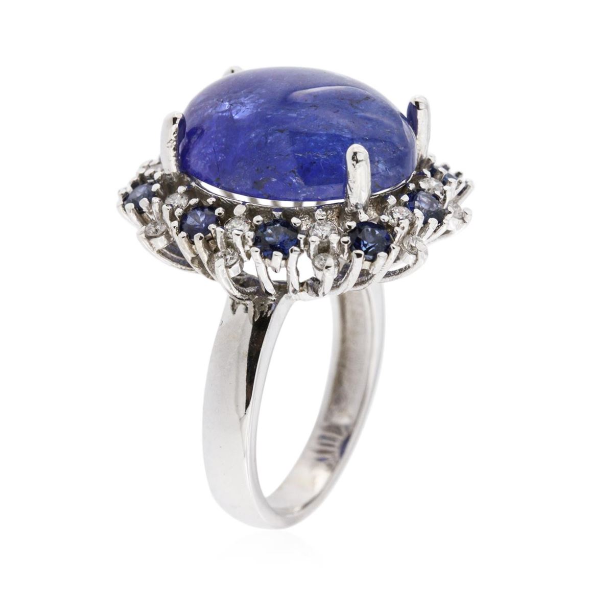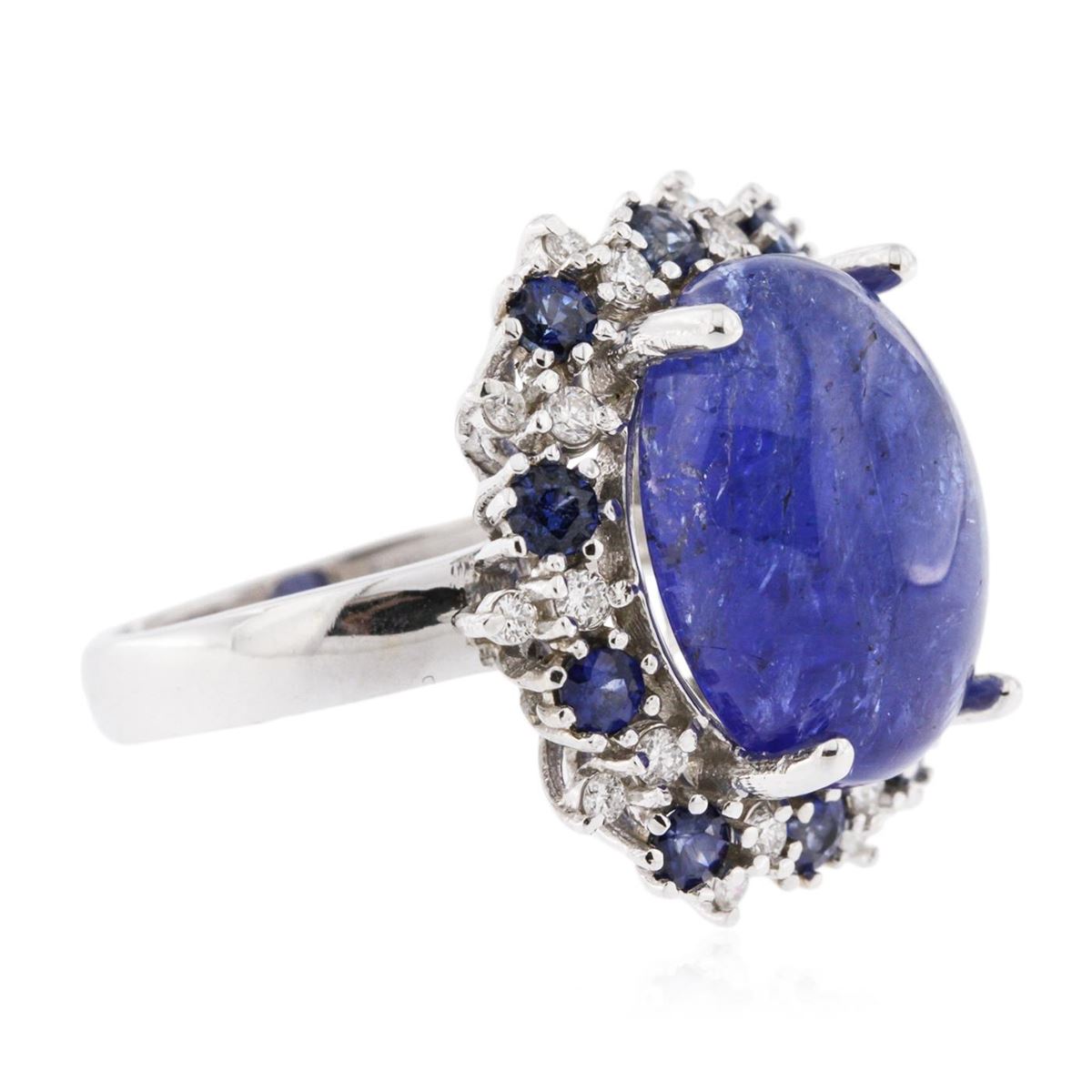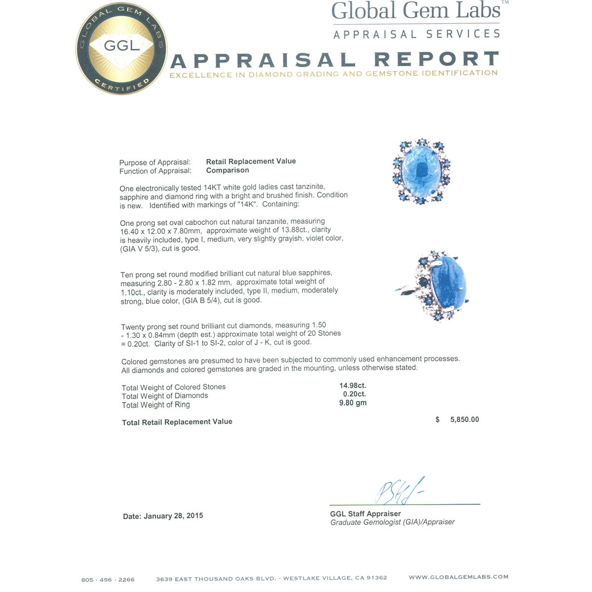 One electronically tested 14KT white gold ladies cast tanzanite, sapphire and diamond ring with a bright and brushed finish. Identified with markings of "14K". Condition is new. Containing: One prong set oval cabochon cut natural tanzanite, measuring 16.40 x 12.00 x 7.80mm, approximate weight of 13.88ct., clarity is heavily included, type I, medium, very slightly grayish, violet color, (GIA V 5/3), cut is good. Ten prong set round modified brilliant cut natural blue sapphires, measuring 2.80 - 2.80 x 1.82 mm, approximate total weight of 1.10ct., clarity is moderately included, type II, medium, moderately strong, blue color, (GIA B 5/4), cut is good. Twenty prong set round brilliant cut diamonds, measuring 1.50 - 1.30 x 0.84mm (depth est.) approximate total weight of 20 Stones = 0.20ct. Clarity: SI-1 to SI-2. Color: J - K, Cut is Good. Colored gemstones are presumed to have been subjected to commonly used enhancement processes. All diamonds and colored gemstones are graded in the mounting, unless otherwise stated. Total Weight of Colored Stones 14.98ct. Total Weight of Diamonds 0.20ct. Total Weight of Ring 9.80 grams. GGL Appraised at $5,850.00.
