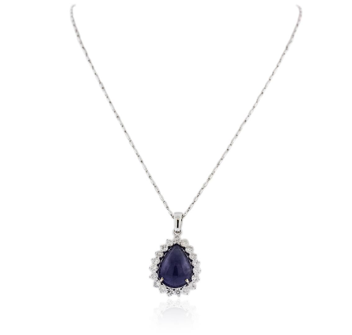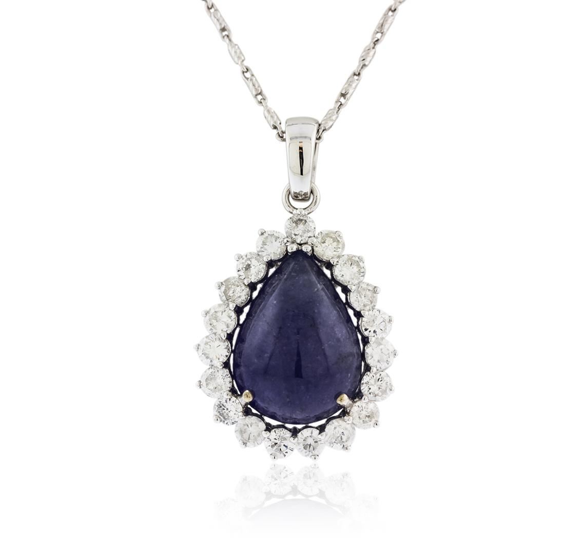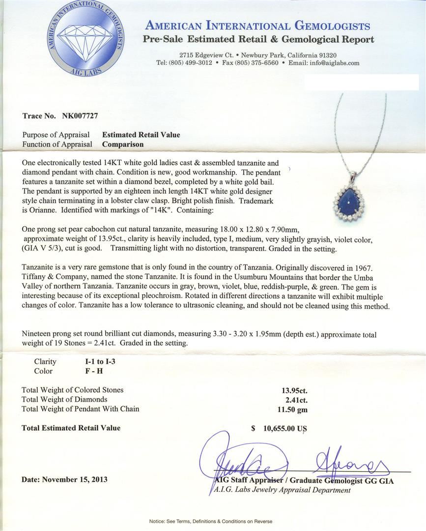 One electronically tested 14KT white gold ladies cast & assembled tanzanite and diamond pendant with chain. The pendant features a tanzanite set within a diamond bezel, completed by a white gold bail. The pendant is supported by an eighteen inch length 14KT white gold designer style chain terminating in a lobster claw clasp. Bright polish finish. Trademark is Orianne. Identified with markings of "14K". Condition is new, good workmanship. Containing: One prong set pear cabochon cut natural tanzanite, measuring 18.00 x 12.80 x 7.90mm, approximate weight of 13.95ct., clarity is heavily included, type I, medium, very slightly grayish, violet color, (GIA V 5/3), cut is good. Transmitting light with no distortion, transparent. Graded in the setting. Tanzanite is a very rare gemstone that is only found in the country of Tanzania. Originally discovered in 1967. Tiffany & Company, named the stone Tanzanite. It is found in the Usumburu Mountains that border the Umba Valley of northern Tanzania. Tanzanite occurs in gray, brown, violet, blue, reddish-purple, & green. The gem is interesting because of its exceptional pleochroism. Rotated in different directions a tanzanite will exhibit multiple changes of color. Tanzanite has a low tolerance to ultrasonic cleaning, and should not be cleaned using this method. Nineteen prong set round brilliant cut diamonds, measuring 3.30 - 3.20 x 1.95mm (depth est.) approximate total weight of 19 Stones = 2.41ct. Graded in the setting. Clarity: I-1 to I-3. Color: F - H. Total Weight of Colored Stones 13.95ct. Total Weight of Diamonds 2.41ct. Total Weight of Pendant With Chain 11.50gm. AIG Appraised at $10,655.00.
