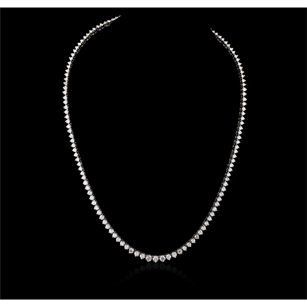 One electronically tested 14KT white gold ladies combination cast & assembled diamond necklace with a hidden box clasp with safety closer with a bright polish finish. Measurements: 17 in length. Identified with markings of 14K. Condition is new. Containing: One Hundred Forty-Two prong set round brilliant cut diamonds, measuring 4.00 - 2.00 x 1.80mm (depth est.) approximate total weight of 142 Stones = 14.03ct. Clarity: SI-2 to I-2. Color: H - J, Cut is Good. All diamonds are graded in the mounting, unless otherwise stated. Total Weight of Diamonds 14.03ct. Total Weight of Necklace 26.30 grams. GGL Appraised at $29,570.00.