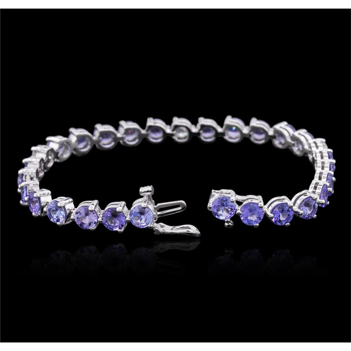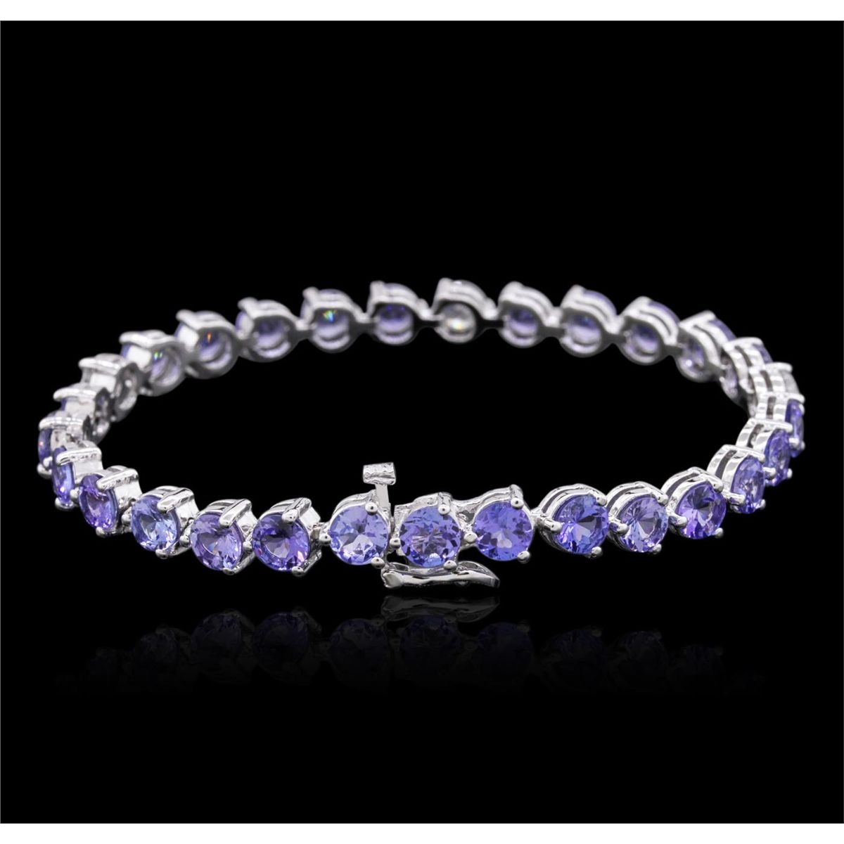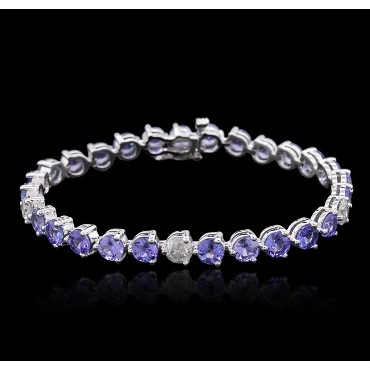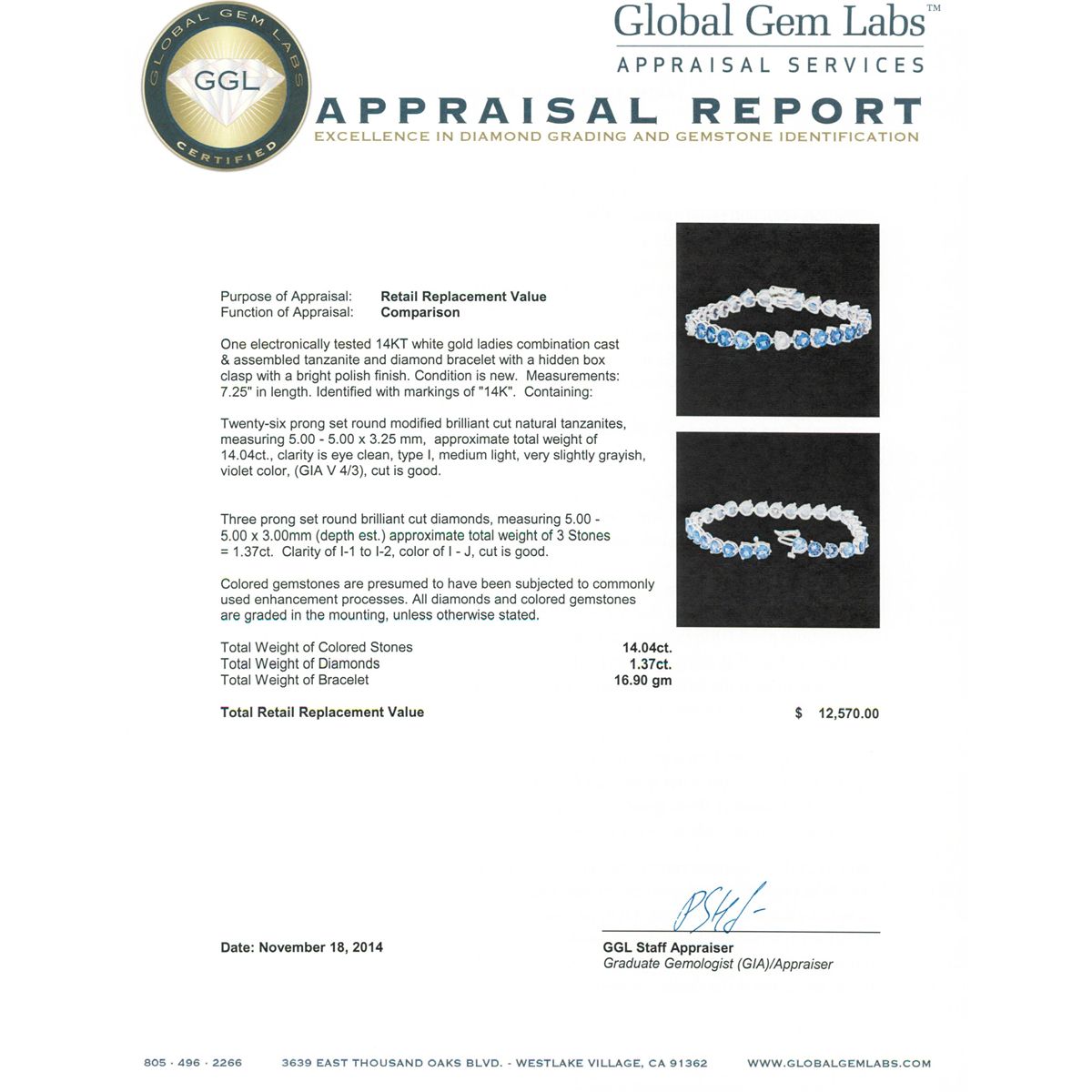 One electronically tested 14KT white gold ladies combination cast & assembled tanzanite and diamond bracelet with a hidden box clasp with a bright polish finish. Measurements: 7.25" in length. Identified with markings of "14K". Condition is new. Containing: Twenty-six prong set round modified brilliant cut natural tanzanites, measuring 5.00 - 5.00 x 3.25 mm, approximate total weight of 14.04ct., clarity is eye clean, type I, medium light, very slightly grayish, violet color, (GIA V 4/3), cut is good. Three prong set round brilliant cut diamonds, measuring 5.00 - 5.00 x 3.00mm (depth est.) approximate total weight of 3 Stones = 1.37ct. Clarity: I-1 to I-2. Color: I - J, Cut is Good. Colored gemstones are presumed to have been subjected to commonly used enhancement processes. All diamonds and colored gemstones are graded in the mounting, unless otherwise stated. Total Weight of Colored Stones 14.04ct. Total Weight of Diamonds 1.37ct. Total Weight of Bracelet 16.90 grams. GGL Appraised at $12,570.00.