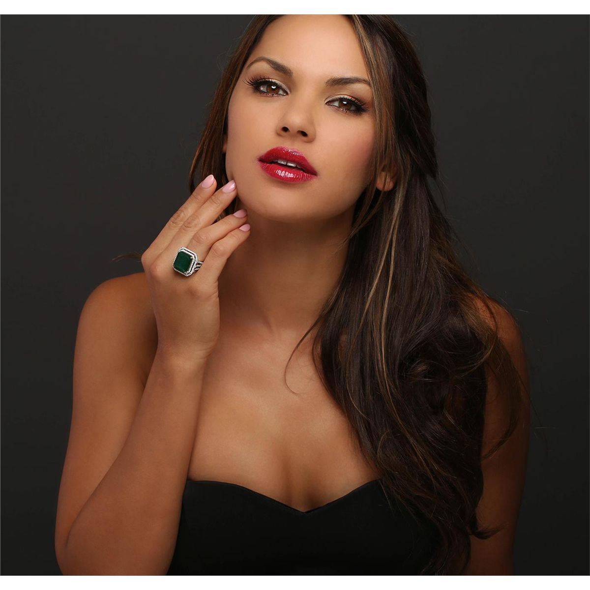 One electronically tested 14KT white gold ladies cast emerald and diamond ring. The featured emerald is set within two tiered diamond bezels supported by diamond set three-way split shoulders, completed by a four millimeter wide band. Bright polish finish with yellow gold accents. Identified with markings of "14K". Condition is new, good workmanship. Containing: One prong set rectangular step cut natural emerald, measuring 16.55 x 13.40 x 7.25mm, 8% bulge factor, approximate weight of 14.17ct., clarity is heavily included, type III, dark, very slightly grayish, very slightly bluish green color, (GIA vslbG 7/3), cut is good. Transmitting light somewhat diffusely, translucent. Naturally occurring internal & external characteristics are present. Indications of oil residue. Colored Stone Grading Report attached. Graded in the setting. One Hundred Forty prong and bezel set round brilliant cut diamonds, measuring 1.50 - 1.40 x 0.87mm (depth est.) approximate total weight of 140 Stones = 1.65ct. Graded in the setting. Clarity: SI-2 to I-2. Color: G - I. Total Weight of Colored Stones 14.17ct. Total Weight of Diamonds 1.65ct. Total Weight of Ring 11.53 grams. AIG Appraised at $32,190.00.