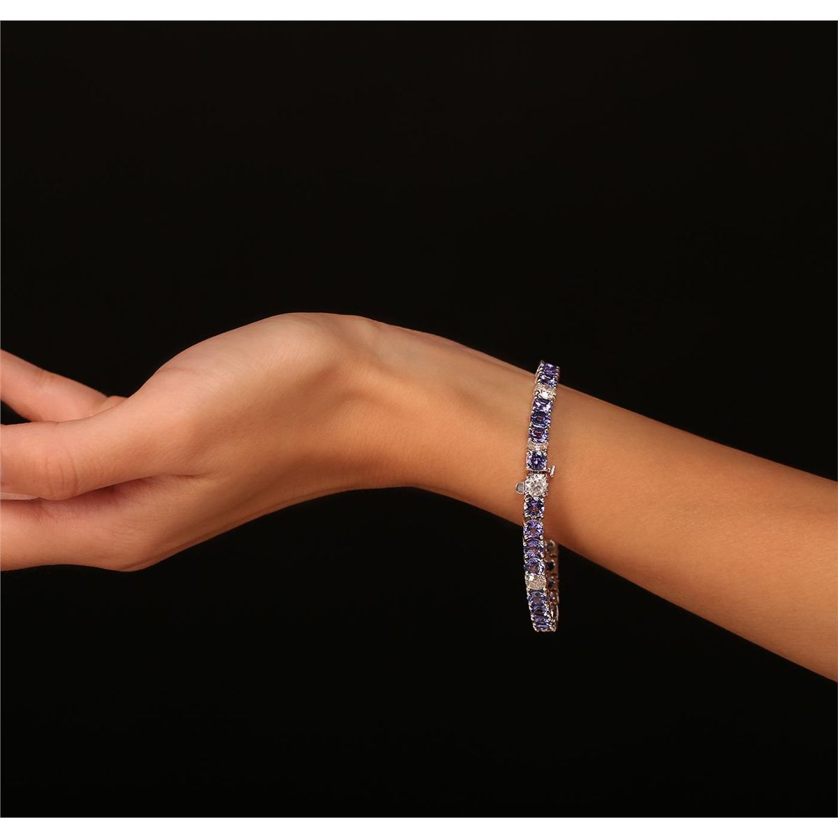 One electronically tested 14KT white gold Ladies combination cast & assembled bracelet with a hidden box clasp with a bright polish finish. Condition is new. Measurements: 7" in length. Identified with markings of "14K". Containing: Twenty-eight prong set round modified brilliant cut natural tanzanites, measuring 4.90 - 4.90 x 3.19 mm, approximate. Total Weight of 14.28ct., clarity is eye clean, type I, medium light, moderately strong, violet color, (GIA V 4/4), cut is very good. Colored gemstones are presumed to have been subjected to commonly used color/clarity enhancement processes. Seven prong set round brilliant cut diamonds, measuring 5.10 - 5.10 x 3.06mm (depth est.) approximate. Total Weight of 7 Stones = 3.40ct. Clarity: I-2 to I-3. Color: I - J, Cut is Good. Total Weight of Colored Stones 14.28ct. Total Weight of Diamonds 3.40ct. Total Weight of Bracelet 20.40 grams. GGL Appraised at $33,845.00.