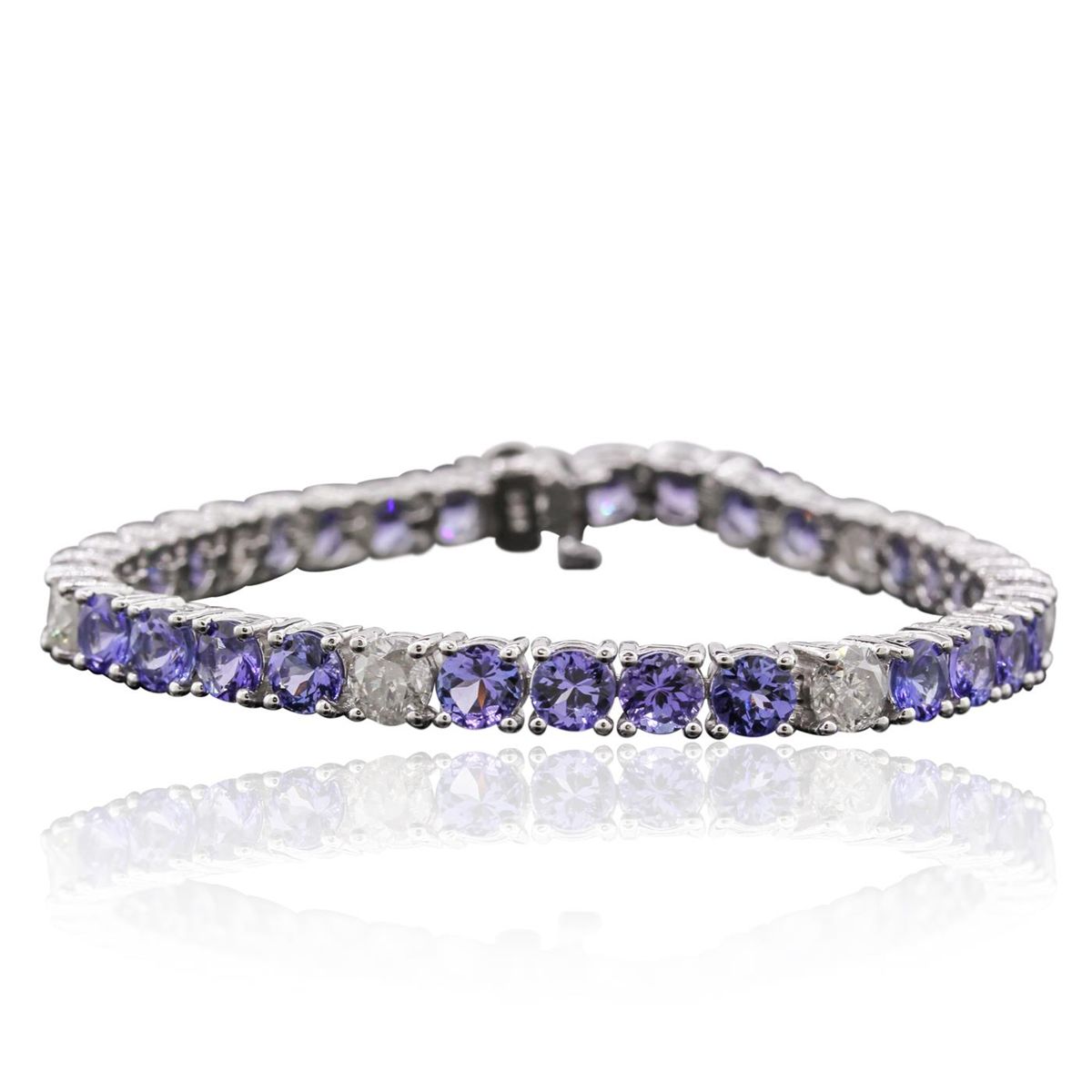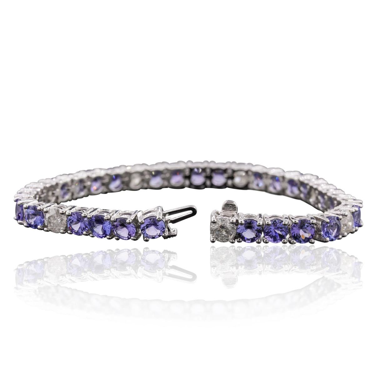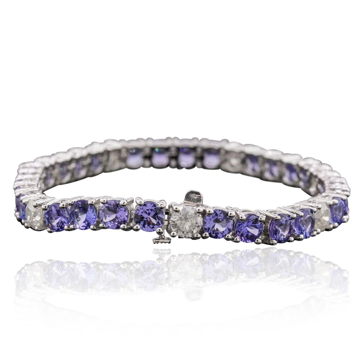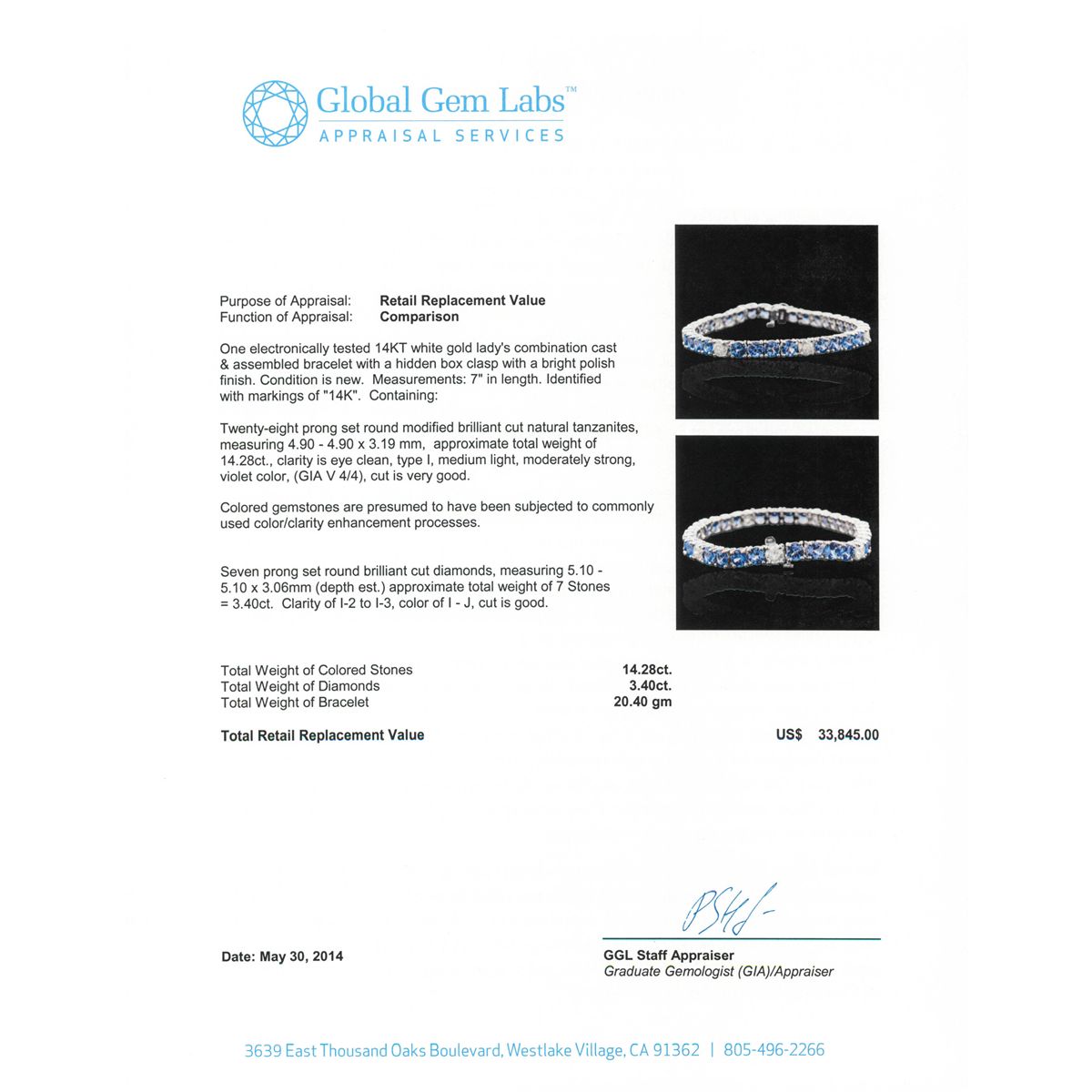 One electronically tested 14KT white gold Ladies combination cast & assembled bracelet with a hidden box clasp with a bright polish finish. Condition is new. Measurements: 7" in length. Identified with markings of "14K". Containing: Twenty-eight prong set round modified brilliant cut natural tanzanites, measuring 4.90 - 4.90 x 3.19 mm, approximate. Total Weight of 14.28ct., clarity is eye clean, type I, medium light, moderately strong, violet color, (GIA V 4/4), cut is very good. Colored gemstones are presumed to have been subjected to commonly used color/clarity enhancement processes. Seven prong set round brilliant cut diamonds, measuring 5.10 - 5.10 x 3.06mm (depth est.) approximate. Total Weight of 7 Stones = 3.40ct. Clarity: I-2 to I-3. Color: I - J, Cut is Good. Total Weight of Colored Stones 14.28ct. Total Weight of Diamonds 3.40ct. Total Weight of Bracelet 20.40 grams. GGL Appraised at $33,845.00.