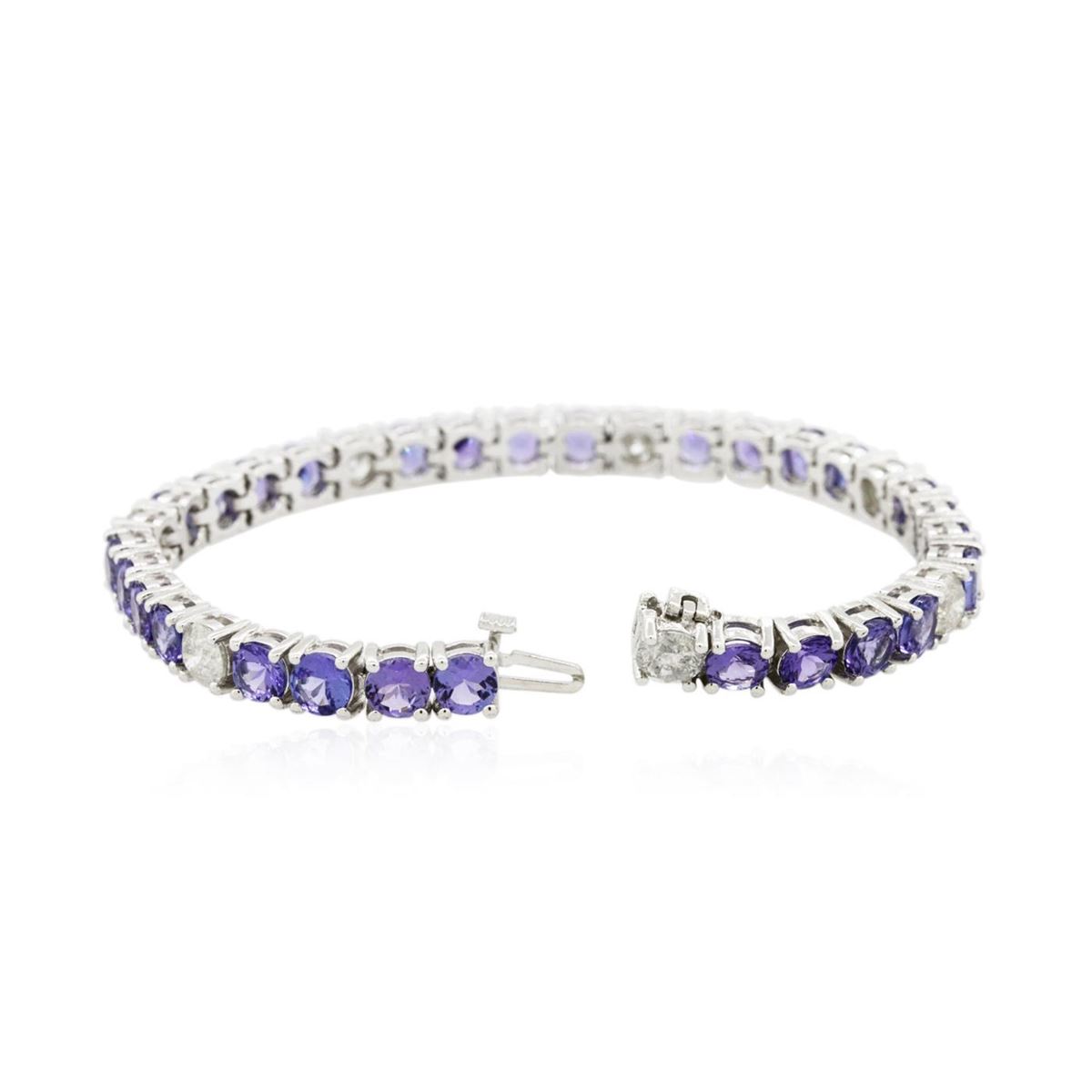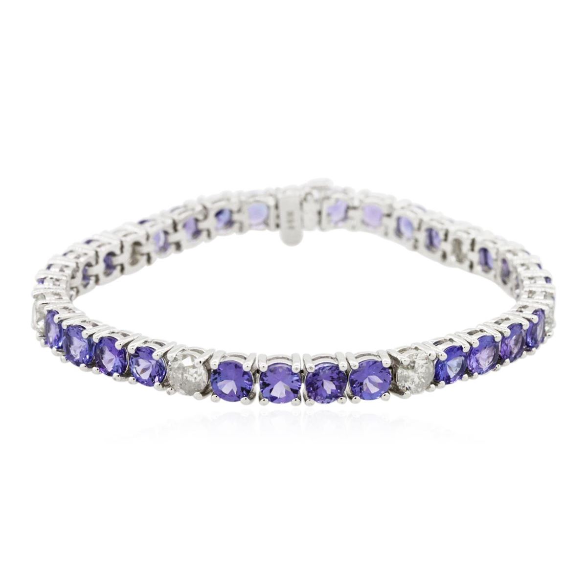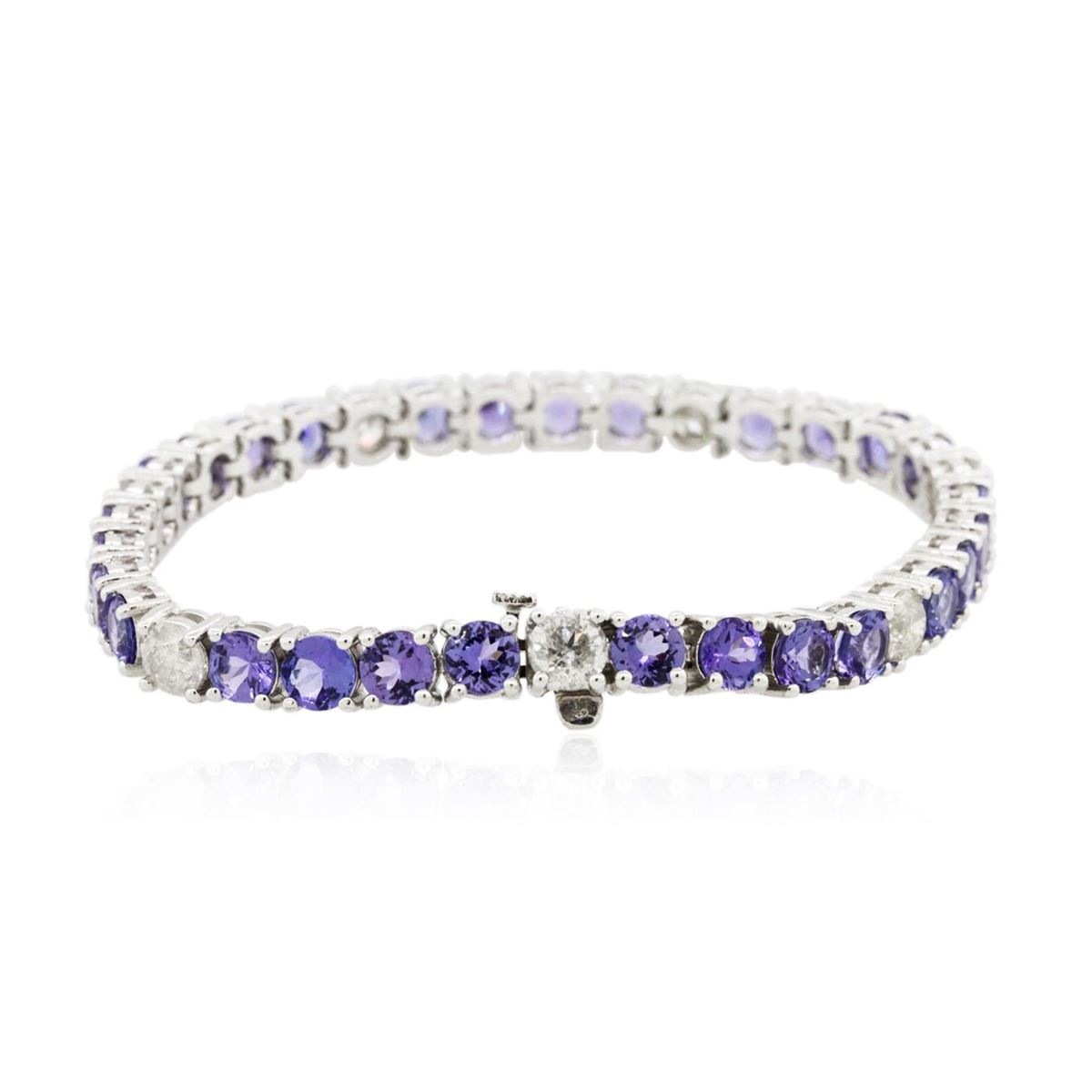 One electronically tested 14KT white gold Ladies combination cast & assembled bracelet with a hidden box clasp with a bright polish finish. Condition is new. Measurements: 7" in length. Identified with markings of "14K". Containing: Twenty-eight prong set round modified brilliant cut natural tanzanites, measuring 4.90 - 4.90 x 3.19 mm, approximate. Total Weight of 14.28ct., clarity is eye clean, type I, medium light, moderately strong, violet color, (GIA V 4/4), cut is very good. Colored gemstones are presumed to have been subjected to commonly used color/clarity enhancement processes. Seven prong set round brilliant cut diamonds, measuring 5.10 - 5.10 x 3.06mm (depth est.) approximate. Total Weight of 7 Stones = 3.40ct. Clarity: I-2 to I-3. Color: I - J, Cut is Good. Total Weight of Colored Stones 14.28ct. Total Weight of Diamonds 3.40ct. Total Weight of Bracelet 20.40 grams. GGL Appraised at $33,845.00.