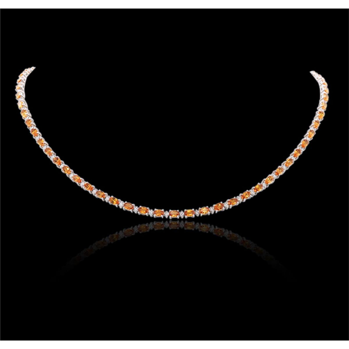 One electronically tested 14KT white gold ladies cast & assembled orange sapphire and diamond necklace with a bright polish finish. Eighteen and one-half inch length necklace features a flexible orange sapphire and diamond ribbon, terminating in a concealed clasp with safety. Identified with markings of "K14". Condition is new, good workmanship. Containing: Sixty-five prong set oval mixed cut natural orange sapphires, measuring 5.00 x 3.00 x 1.65mm, 6% bulge factor, approximate total weight of 14.30ct., clarity is slightly included, type II, medium dark, brownish, orange color, (GIA O 6/3), cut is good. Transmitting light with a minimum of distortion, transparent. Naturally occurring internal & external characteristics are present. Measurements & the color grade are an average for the group. Graded in the setting. Sixty-Five prong set round brilliant cut diamonds, measuring 1.90 - 1.80 x 1.11mm (depth est.) approximate total weight of 65 Stones = 1.60ct. Graded in the setting. Clarity: SI-2 to I-1. Color: G - I. Total Weight of Colored Stones 14.30ct. Total Weight of Diamonds 1.60ct. Total Weight of Necklace 20.86 grams. AIG Appraised at $13,520.00.