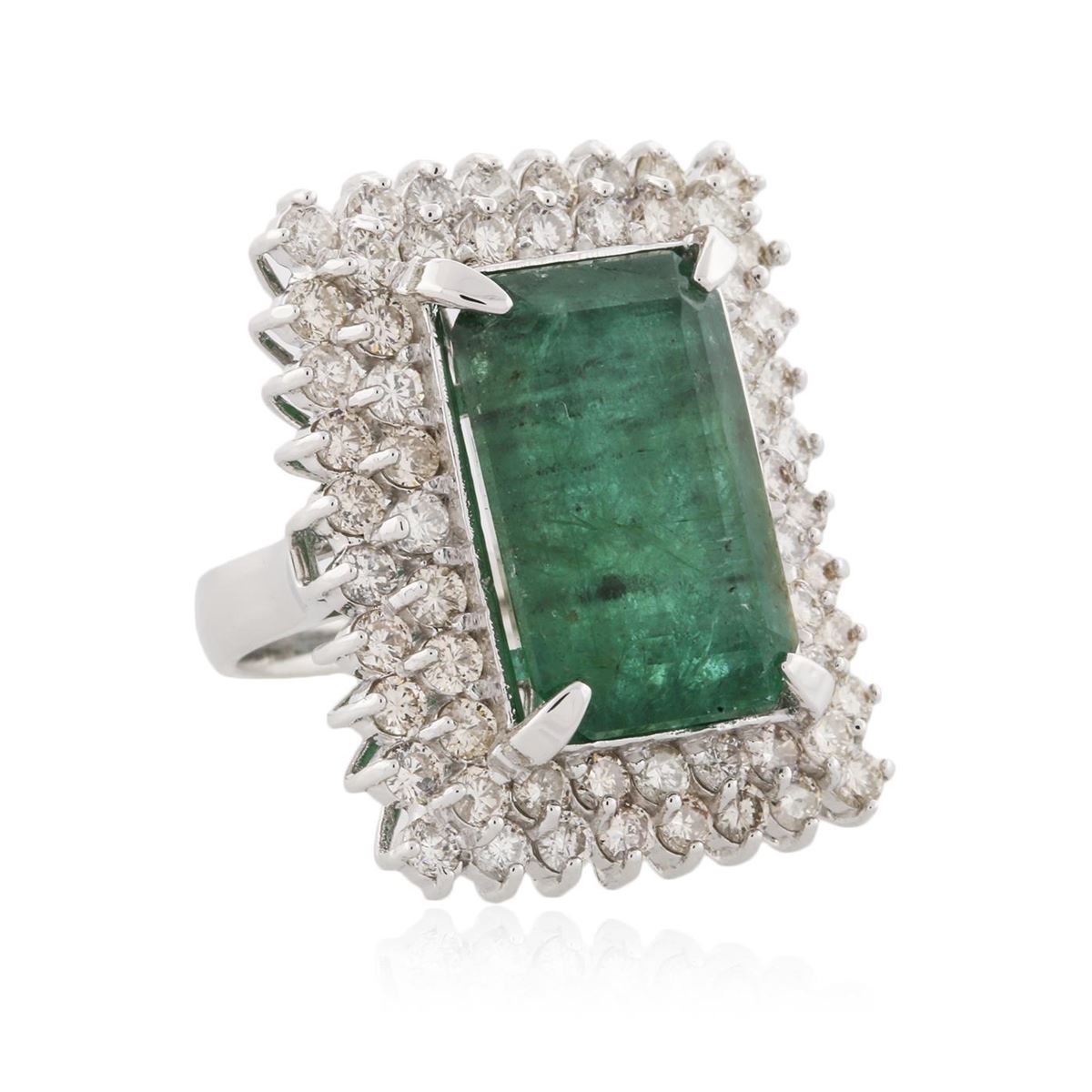 One electronically tested 14KT white gold Ladies combination cast & assembled fancy ring with a high polish finish. Condition is new. Identified with markings of "14K". Containing: One prong set emerald standard step cut natural emerald, measuring 18.50 x 11.50 x 9.20mm, approximate weight of 14.37ct., clarity is heavily included, type III, medium dark, very slightly grayish, very slightly bluish green color, (GIA vslbG 6/3), cut is good. Colored gemstones are presumed to have been subjected to commonly used and possible undetectable color/clarity enhancement processes. Sixty prong set round brilliant cut diamonds, measuring 2.40 - 2.40 x 1.59mm (depth est.) approximate total weight of 60 Stones = 3.51ct. Clarity of SI-2 to I-1, Color of I - K, Cut is Good. Total Weight of Colored Stones 14.37ct. Total Weight of Diamonds 3.51ct. Total Weight of Ring 15.90 grams. GGL Appraised at $30,780.00.