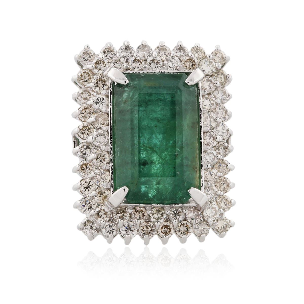 One electronically tested 14KT white gold Ladies combination cast & assembled fancy ring with a high polish finish. Condition is new. Identified with markings of "14K". Containing: One prong set emerald standard step cut natural emerald, measuring 18.50 x 11.50 x 9.20mm, approximate weight of 14.37ct., clarity is heavily included, type III, medium dark, very slightly grayish, very slightly bluish green color, (GIA vslbG 6/3), cut is good. Colored gemstones are presumed to have been subjected to commonly used and possible undetectable color/clarity enhancement processes. Sixty prong set round brilliant cut diamonds, measuring 2.40 - 2.40 x 1.59mm (depth est.) approximate total weight of 60 Stones = 3.51ct. Clarity of SI-2 to I-1, Color of I - K, Cut is Good. Total Weight of Colored Stones 14.37ct. Total Weight of Diamonds 3.51ct. Total Weight of Ring 15.90 grams. GGL Appraised at $30,780.00.