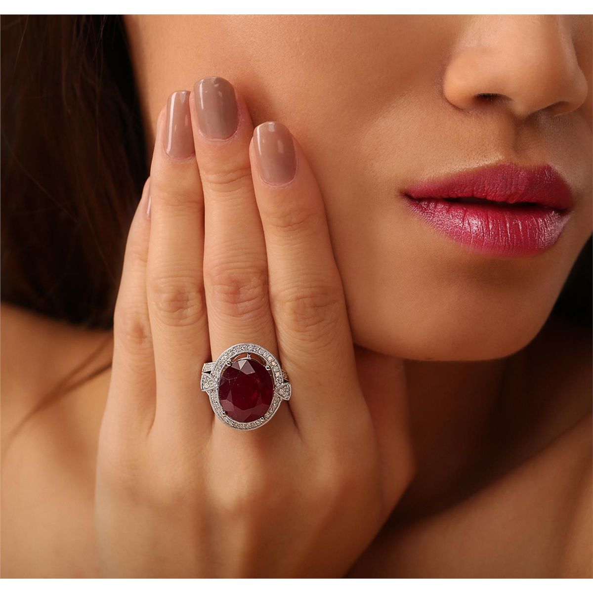 One electronically tested 14KT white gold ladies cast ruby and diamond ring. Condition is new, good workmanship. The featured ruby is set within a diamond bezel supported by diamond set split shoulders, completed by a one and one-half millimeter wide band. Bright polish finish with milgrain detailing throughout. Trademark is PMI. Identified with markings of "14K". Containing: One prong set oval mixed cut natural ruby, measuring 15.00 x 13.00 x 8.40mm, 10%. bulge factor, approximate weight of 14.49ct., clarity is heavily included, type II, dark, very slightly brownish, slightly purplish red color, (GIA slpR 7/3), cut is good. Transmitting light somewhat diffusely, transparent to translucent. Naturally occurring internal & external characteristics are present. Indications of laboratory high temperature heat treatment, with glass & flux additives. Graded in the setting. Ruby has a low tolerance to rhodium plating, repolishing the surface, & ultrasonic cleaning. Sixty bead set round brilliant cut diamonds, measuring 1.30 - 1.20 x 0.75mm (depth est.) approximate. Total Weight of 60 Stones = 0.52ct. Graded in the setting. Clarity: I-1 to I-3. Color: G - I. Total Weight of Colored Stones 14.49ct. Total Weight of Diamonds 0.52ct. Total Weight of Ring 10.14 grams. AIG Appraised at $5,635.00.