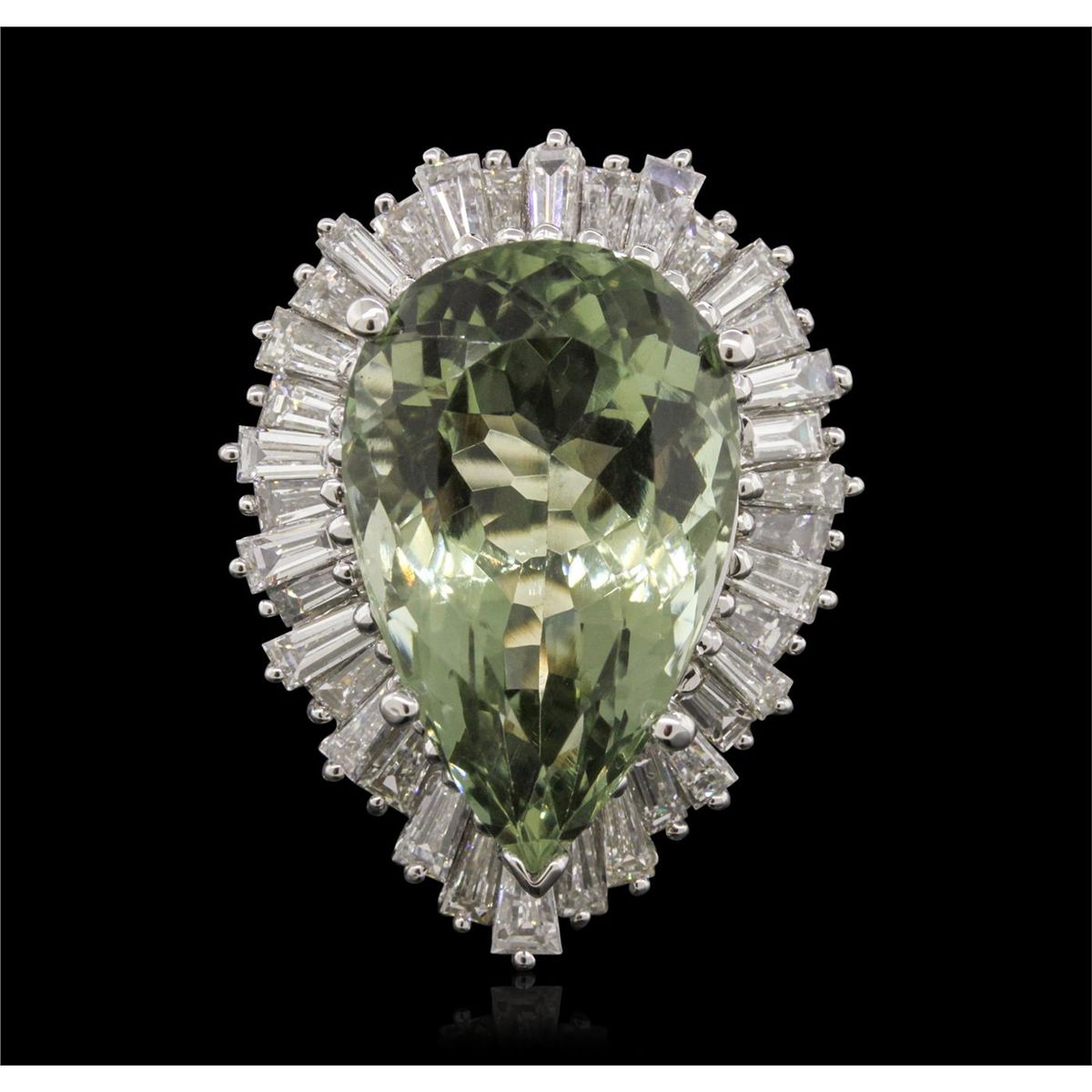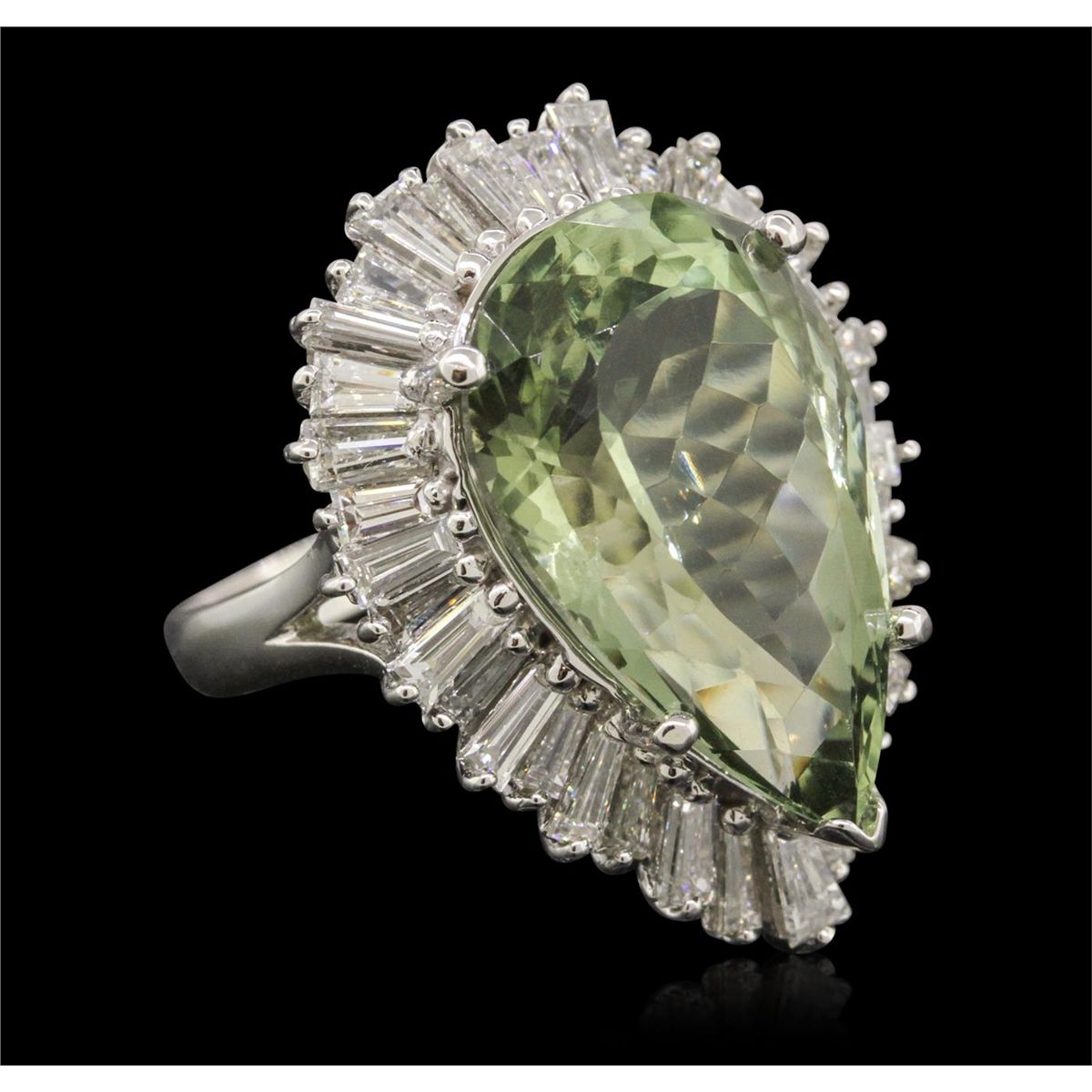 One electronically tested 14KT white gold ladies combination cast & assembled ring with a bright polish finish. Identified with markings of "K14". Condition is new. Containing: One prong set pear modified brilliant cut natural greened amethyst, measuring 21.00 x 13.00 x 10.00mm, approximate weight of 14.52ct., clarity is eye clean, light, very slightly grayish, green color, (GIA G 3/3), cut is good. Thirty-Six prong set baguette cut diamonds, measuring from 3.00 x 1.50 x 1.28mm (depth est.) to 4.50 x 1.50 x 1.28mm (depth est.) approximate total weight of 36 Stones = 2.37ct. Clarity: VS-2 to SI-1. Color: H - I, Cut is Good. Colored gemstones are presumed to have been subjected to commonly used enhancement processes. All diamonds and colored gemstones are graded in the mounting, unless otherwise stated. Total Weight of Colored Stones 14.52ct. Total Weight of Diamonds 2.37ct. Total Weight of Ring 10.30 grams. GGL Appraised at $11,475.00.