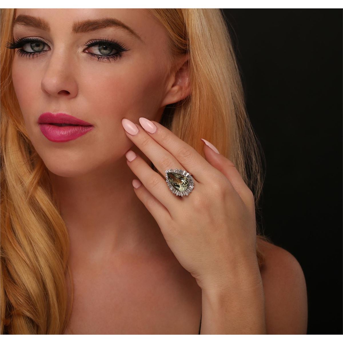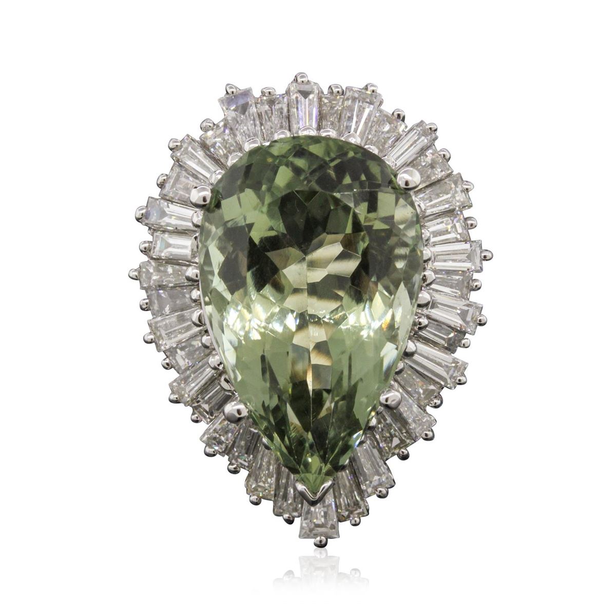 One electronically tested 14KT white gold ladies combination cast & assembled ring with a bright polish finish. Identified with markings of "K14". Condition is new. Containing: One prong set pear modified brilliant cut natural greened amethyst, measuring 21.00 x 13.00 x 10.00mm, approximate weight of 14.52ct., clarity is eye clean, light, very slightly grayish, green color, (GIA G 3/3), cut is good. Thirty-Six prong set baguette cut diamonds, measuring from 3.00 x 1.50 x 1.28mm (depth est.) to 4.50 x 1.50 x 1.28mm (depth est.) approximate total weight of 36 Stones = 2.37ct. Clarity: VS-2 to SI-1. Color: H - I, Cut is Good. Colored gemstones are presumed to have been subjected to commonly used enhancement processes. All diamonds and colored gemstones are graded in the mounting, unless otherwise stated. Total Weight of Colored Stones 14.52ct. Total Weight of Diamonds 2.37ct. Total Weight of Ring 10.30 grams. GGL Appraised at $11,475.00.