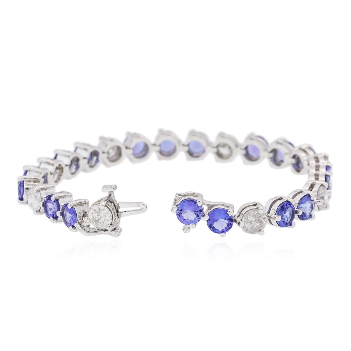 One electronically tested 14KT white gold ladies combination cast & assembled tennis bracelet with a hidden box clasp with a bright polish finish. Measurements: 6" in length. Identified with markings of "14K". Condition is new. Containing: Eighteen prong set round modified brilliant cut natural tanzanites, measuring 5.70 - 5.70 x 3.71 mm, approximate total weight of 14.58ct., clarity is eye clean, type I, medium, moderately strong, bluish violet color, (GIA bV 5/4), cut is good. Eight prong set round brilliant cut diamonds, measuring 5.50 - 5.50 x 3.30mm (depth est.) approximate total weight of 8 Stones = 4.87ct. Clarity: I-2 to I-3. Color: H - I, Cut is Good. Colored gemstones are presumed to have been subjected to commonly used enhancement processes. All diamonds and colored gemstones are graded in the mounting, unless otherwise stated. Total Weight of Colored Stones 14.58ct. Total Weight of Diamonds 4.87ct. Total Weight of Bracelet 20.30 grams. GGL Appraised at $17,850.00.