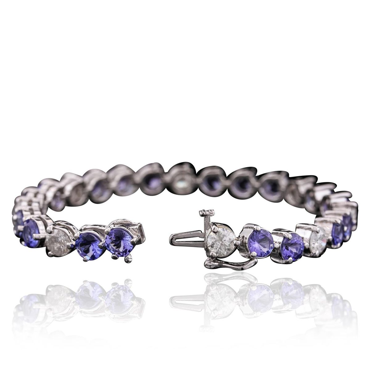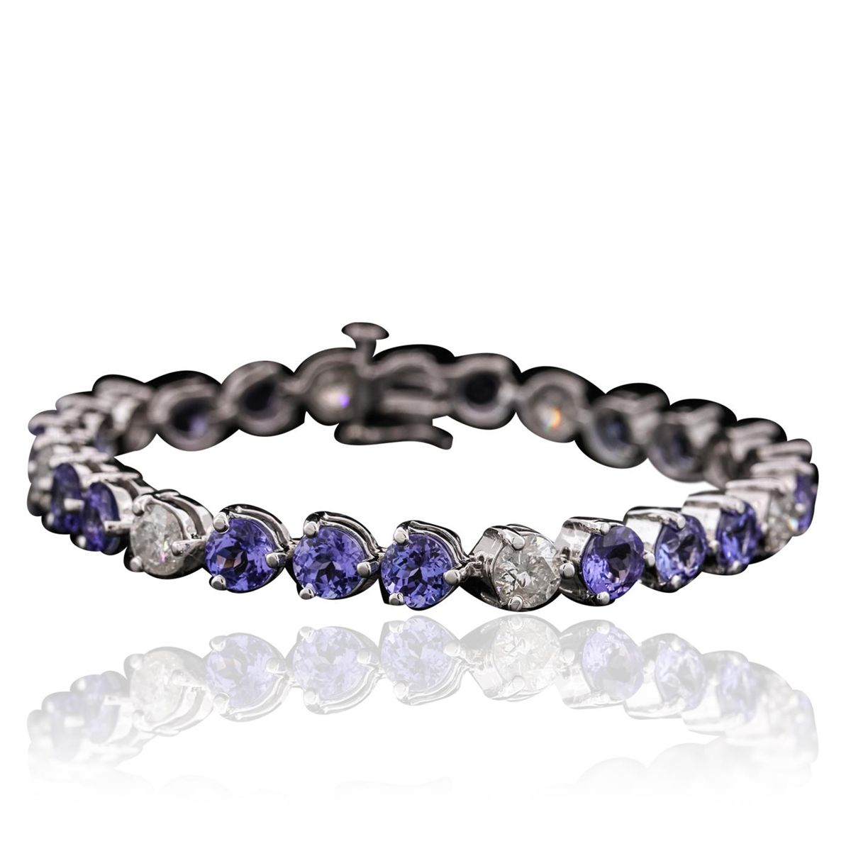 One electronically tested 14KT white gold ladies combination cast & assembled tennis bracelet with a hidden box clasp with a bright polish finish. Measurements: 6" in length. Identified with markings of "14K". Condition is new. Containing: Eighteen prong set round modified brilliant cut natural tanzanites, measuring 5.70 - 5.70 x 3.71 mm, approximate total weight of 14.58ct., clarity is eye clean, type I, medium, moderately strong, bluish violet color, (GIA bV 5/4), cut is good. Eight prong set round brilliant cut diamonds, measuring 5.50 - 5.50 x 3.30mm (depth est.) approximate total weight of 8 Stones = 4.87ct. Clarity: I-2 to I-3. Color: H - I, Cut is Good. Colored gemstones are presumed to have been subjected to commonly used enhancement processes. All diamonds and colored gemstones are graded in the mounting, unless otherwise stated. Total Weight of Colored Stones 14.58ct. Total Weight of Diamonds 4.87ct. Total Weight of Bracelet 20.30 grams. GGL Appraised at $17,850.00.