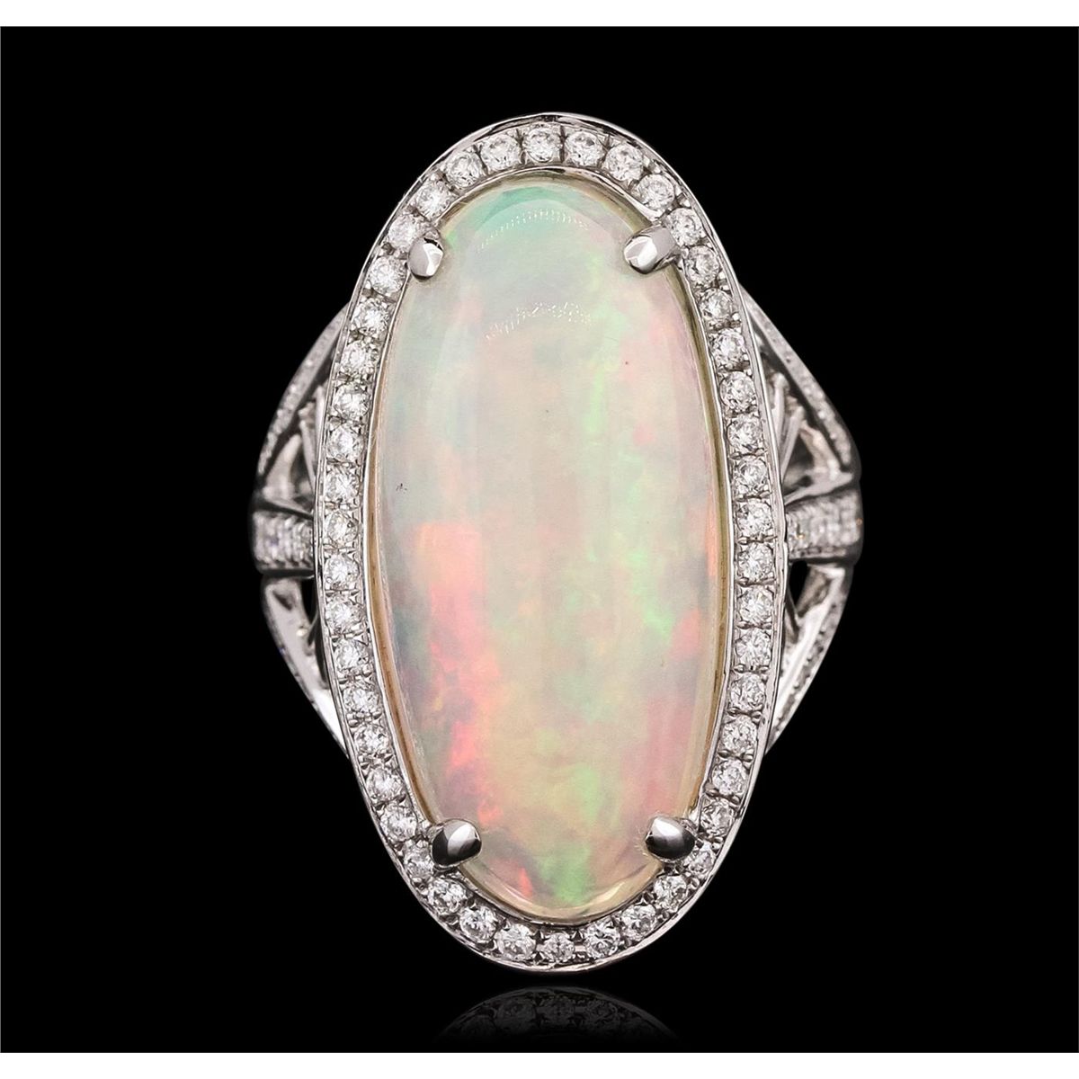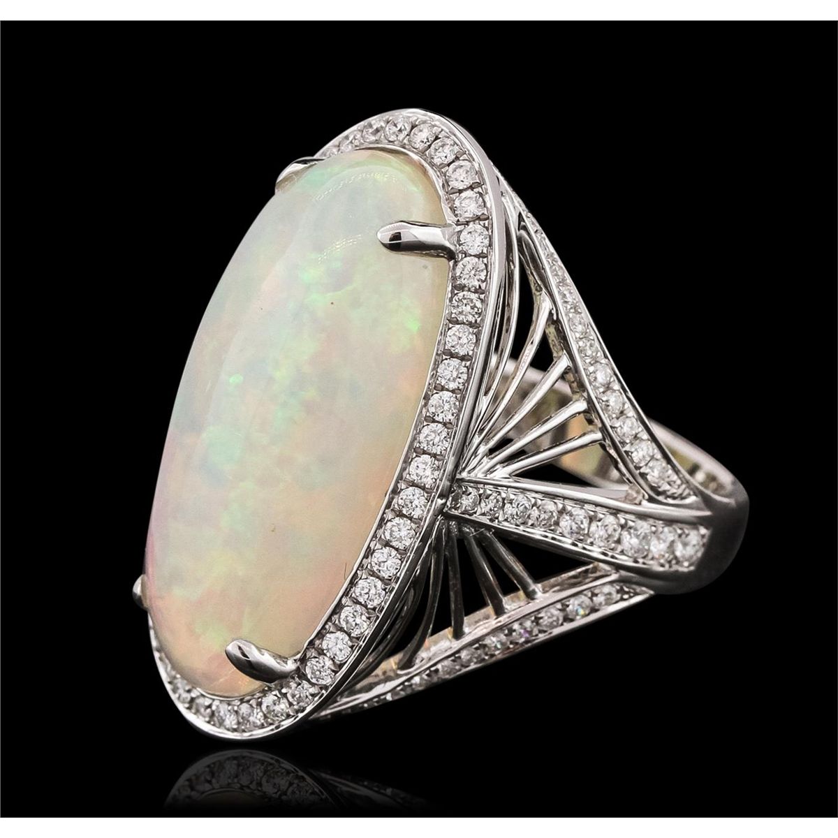 One electronically tested 14KT white gold ladies cast ring with a flat shank with rounded edges with a bright polish finish. Identified with markings of "14K". Condition is new. Containing: One white opal that is cut in a oval shape and is prong set, measuring 24.26 mm long x 11.03 mm wide, and 10.98 mm thick and the approximate weight is 14.69 carats. The opal has a somewhat bright, green-orange play of color (fire) in a flashfire pattern; a medium dome; a good cut; no inclusions; consistent in its brightness and pattern; and is somewhat directional. One Hundred Thirty-Six prong set round brilliant cut diamonds, measuring 1.10 - 1.10 x 0.66mm (depth est.) approximate total weight of 136 Stones = 0.65ct. Clarity: SI-2 to I-1. Color: H - I, Cut is Good. Colored gemstones are presumed to have been subjected to commonly used enhancement processes. All diamonds and colored gemstones are graded in the mounting, unless otherwise stated. Total Weight of Diamonds 0.65ct. Total Weight of Opals 14.69ct. Total Weight of Ring 9.70 grams. GGL Appraised at $6,005.00.