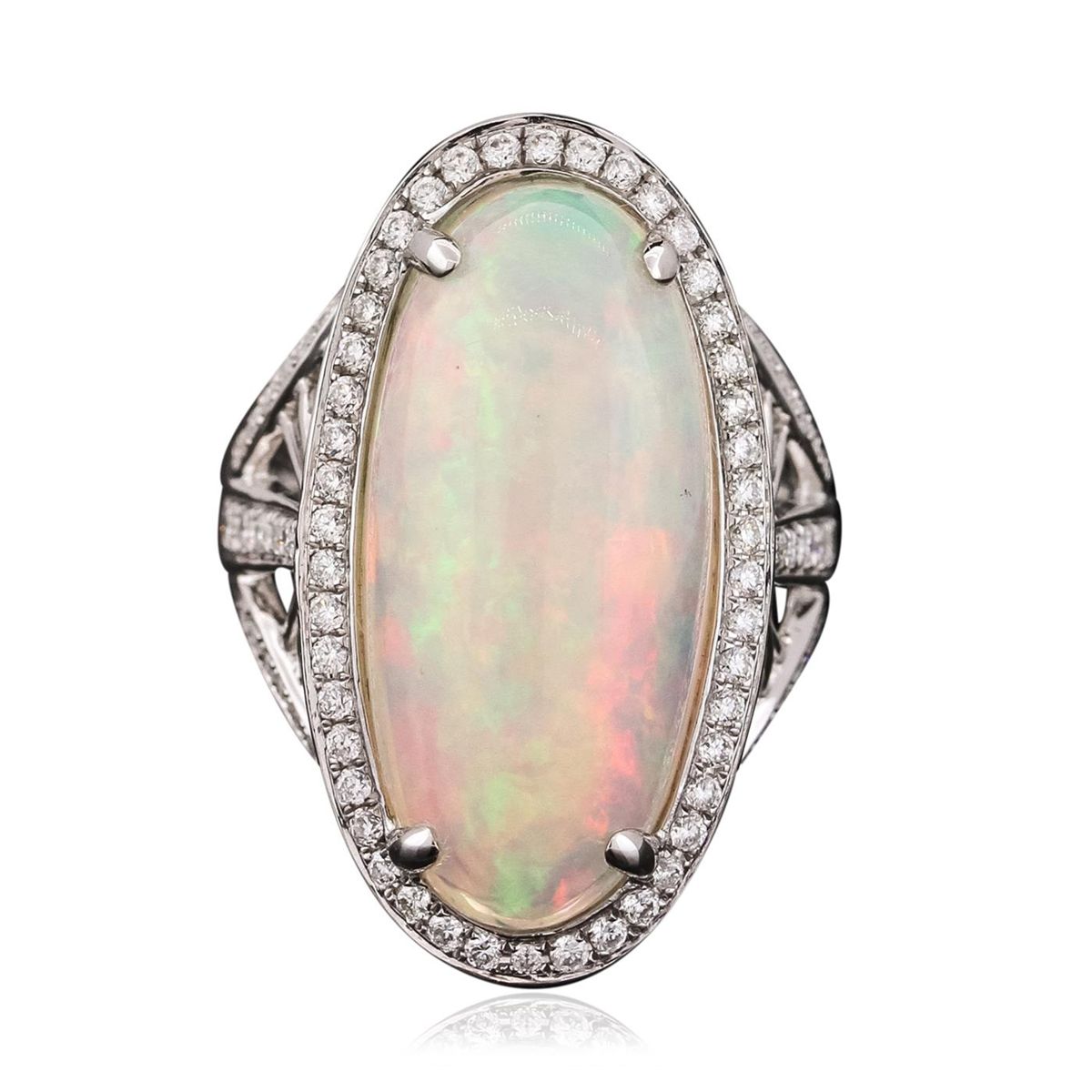 One electronically tested 14KT white gold ladies cast ring with a flat shank with rounded edges with a bright polish finish. Identified with markings of "14K". Condition is new. Containing: One white opal that is cut in a oval shape and is prong set, measuring 24.26 mm long x 11.03 mm wide, and 10.98 mm thick and the approximate weight is 14.69 carats. The opal has a somewhat bright, green-orange play of color (fire) in a flashfire pattern; a medium dome; a good cut; no inclusions; consistent in its brightness and pattern; and is somewhat directional. One Hundred Thirty-Six prong set round brilliant cut diamonds, measuring 1.10 - 1.10 x 0.66mm (depth est.) approximate total weight of 136 Stones = 0.65ct. Clarity: SI-2 to I-1. Color: H - I, Cut is Good. Colored gemstones are presumed to have been subjected to commonly used enhancement processes. All diamonds and colored gemstones are graded in the mounting, unless otherwise stated. Total Weight of Diamonds 0.65ct. Total Weight of Opals 14.69ct. Total Weight of Ring 9.70 grams. GGL Appraised at $6,005.00.