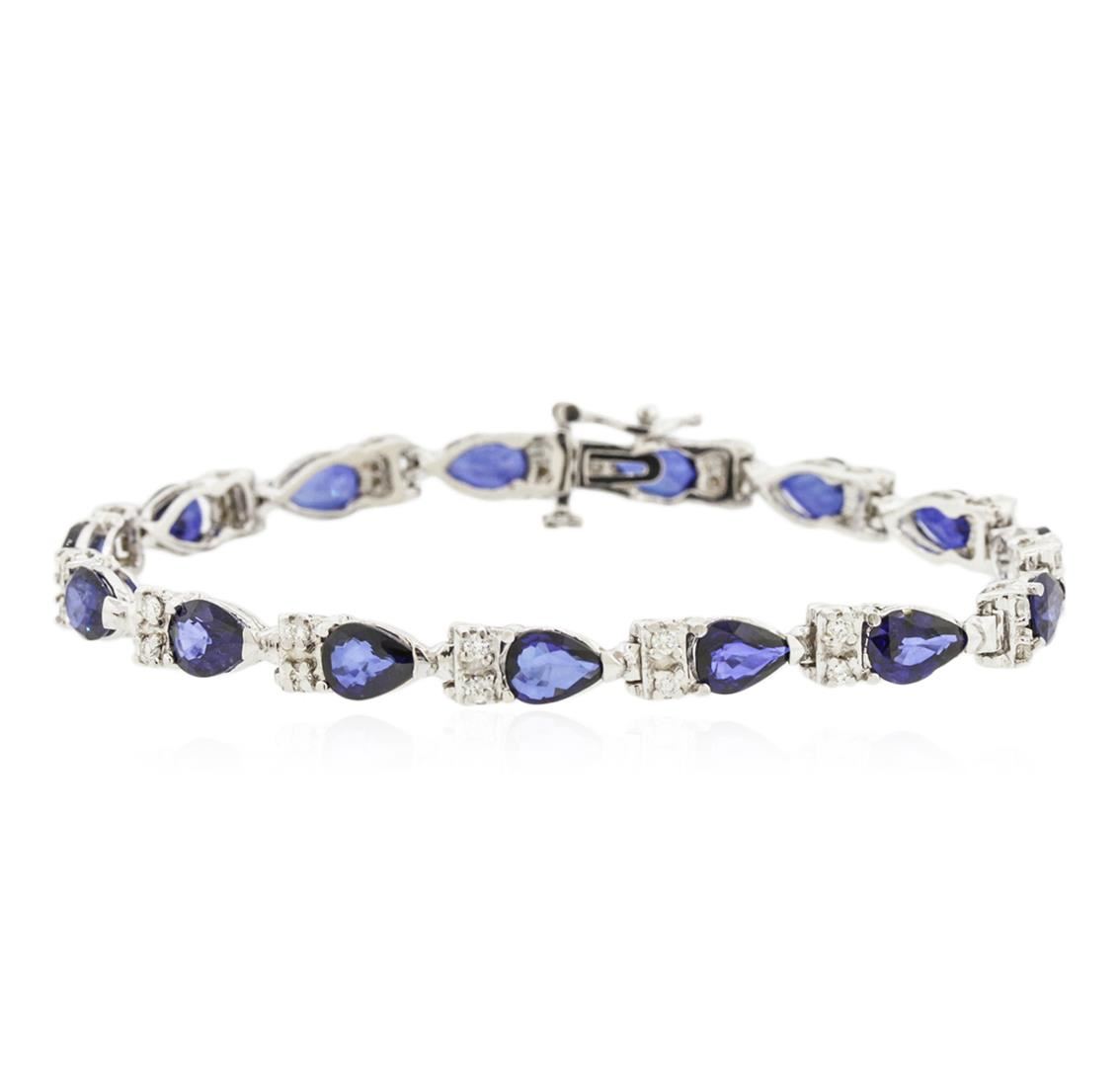 One electronically tested 14KT white gold ladies cast sapphire and diamond bracelet with a hidden box clasp with safety closer with a bright polish finish. Measurements: 7 " in length Identified with markings of "14K". Condition is new. Containing: Fifteen prong set pear modified brilliant cut natural blue sapphires, measuring 7.50 x 5.00 x 3.25mm, approximate total weight of 14.70ct., clarity is eye clean, type II, medium light, very slightly grayish, blue color, (GIA B 4/3), cut is good. Thirty prong set round brilliant cut diamonds, measuring 1.80 - 1.80 x 1.08mm (depth est.) approximate total weight of 30 Stones = 0.64ct. Clarity: SI-2 to I-1. Color: I - J, Cut is Good. Colored gemstones are presumed to have been subjected to commonly used enhancement processes. All diamonds and colored gemstones are graded in the mounting, unless otherwise stated. Total Weight of Colored Stones 14.70ct. Total Weight of Diamonds 0.64ct. Total Weight of Bracelet 12.80 grams. GGL Appraised at $5,980.00.