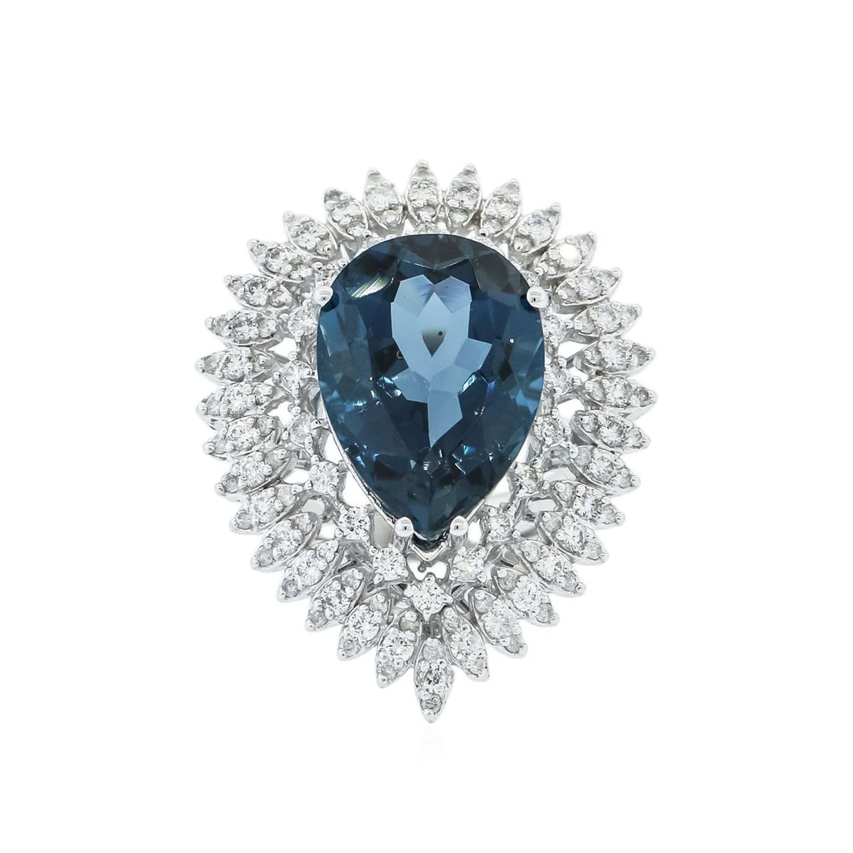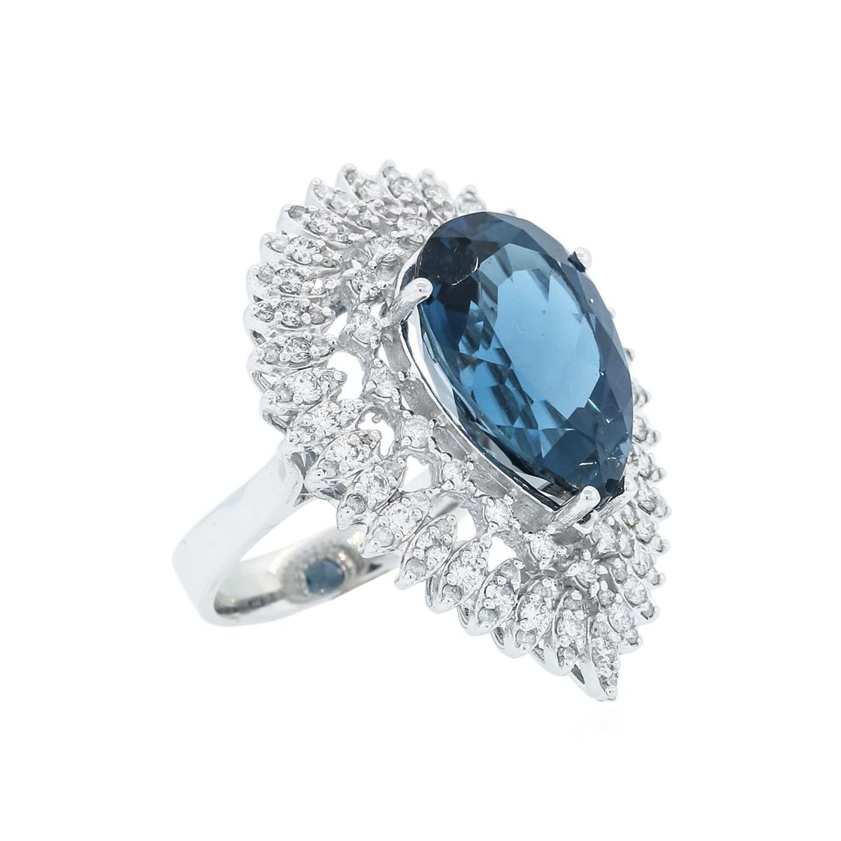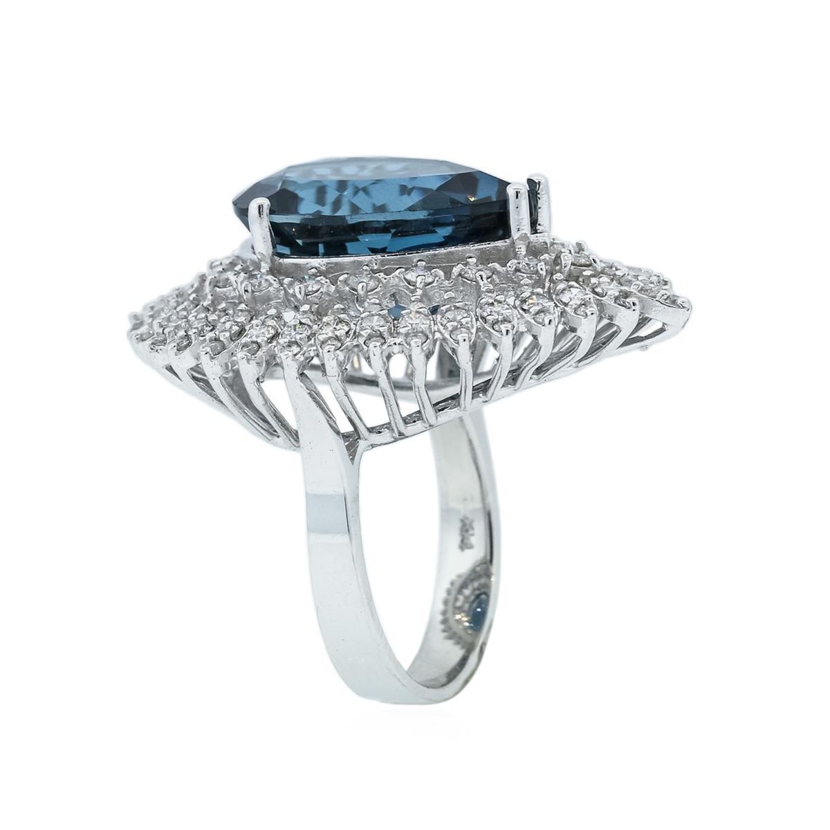 One electronically tested 14KT white gold ladies cast topaz and diamond ring with a bright polish finish. Identified with markings of "14K". Condition is new. Containing: One prong set oval modified brilliant cut natural blue topaz, measuring 18.34 x 12.91 x 8.39mm, approximate weight of 14.73ct., clarity is eye clean, type I, medium dark, moderately strong, greenish blue color, (GIA gB 6/4), cut is good. One Hundred Ten prong set round brilliant cut diamonds, measuring 1.80 - 1.30 x 0.93mm (depth est.) approximate total weight of 110 Stones = 1.50ct. Clarity: SI-1 to I-1. Color: I - J, Cut is Good. Colored gemstones are presumed to have been subjected to commonly used enhancement processes. All diamonds and colored gemstones are graded in the mounting, unless otherwise stated. Total Weight of Colored Stones 14.73ct. Total Weight of Diamonds 1.50ct. Total Weight of Ring 13.80 grams. GGL Appraised at $5,195.00.