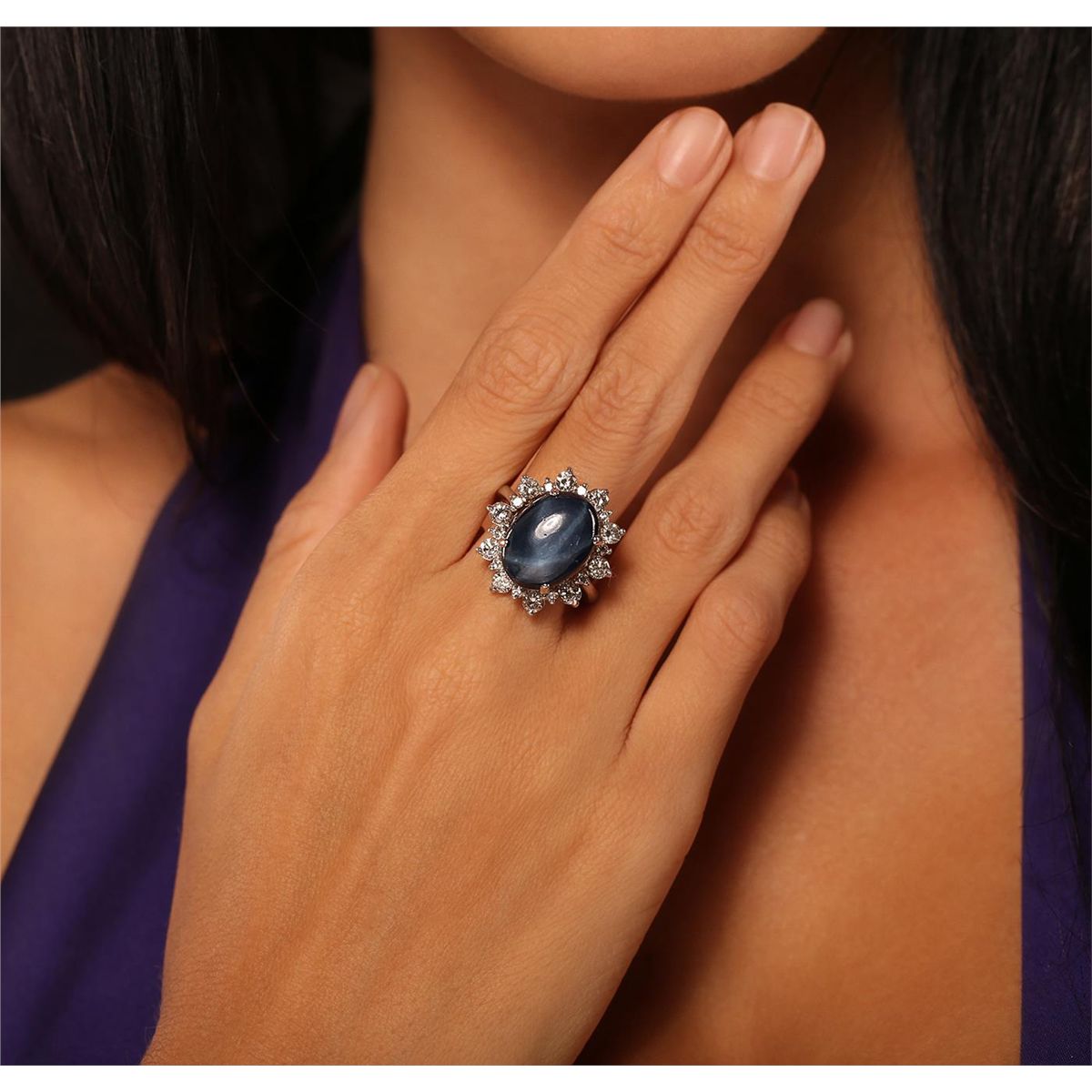 One electronically tested 14KT white gold Ladies combination cast & assembled ring with a bright polish finish. Condition is new. Identified with markings of "K14". Containing: One prong set oval cabochon cut natural star sapphire, measuring 16.20 x 12.00 x 7.02mm, approximate weight of 14.74ct., clarity is heavily included, medium dark, moderately strong, blue color, (GIA B 6/4), cut is good. This stone has a partly complete four ray star with weak intensity and fair movement. Colored gemstones are presumed to have been subjected to commonly used color/clarity enhancement processes. Ten prong set round brilliant cut diamonds, measuring 3.20 - 3.20 x 1.92mm (depth est.) approximate total weight of 10 Stones = 1.20ct. Clarity of I-1, Color of K - L, Cut is Good. Ten prong set round brilliant cut diamonds, measuring 1.60 - 1.60 x 0.96mm (depth est.) approximate total weight of 10 Stones = 0.15ct. Clarity of I-1, Color of K - L, Cut is Good. Total Weight of Colored Stones 14.74ct. Total Weight of Diamonds 1.35ct. Total Weight of Ring 9.60 grams. GGL Appraised at $6,895.00.