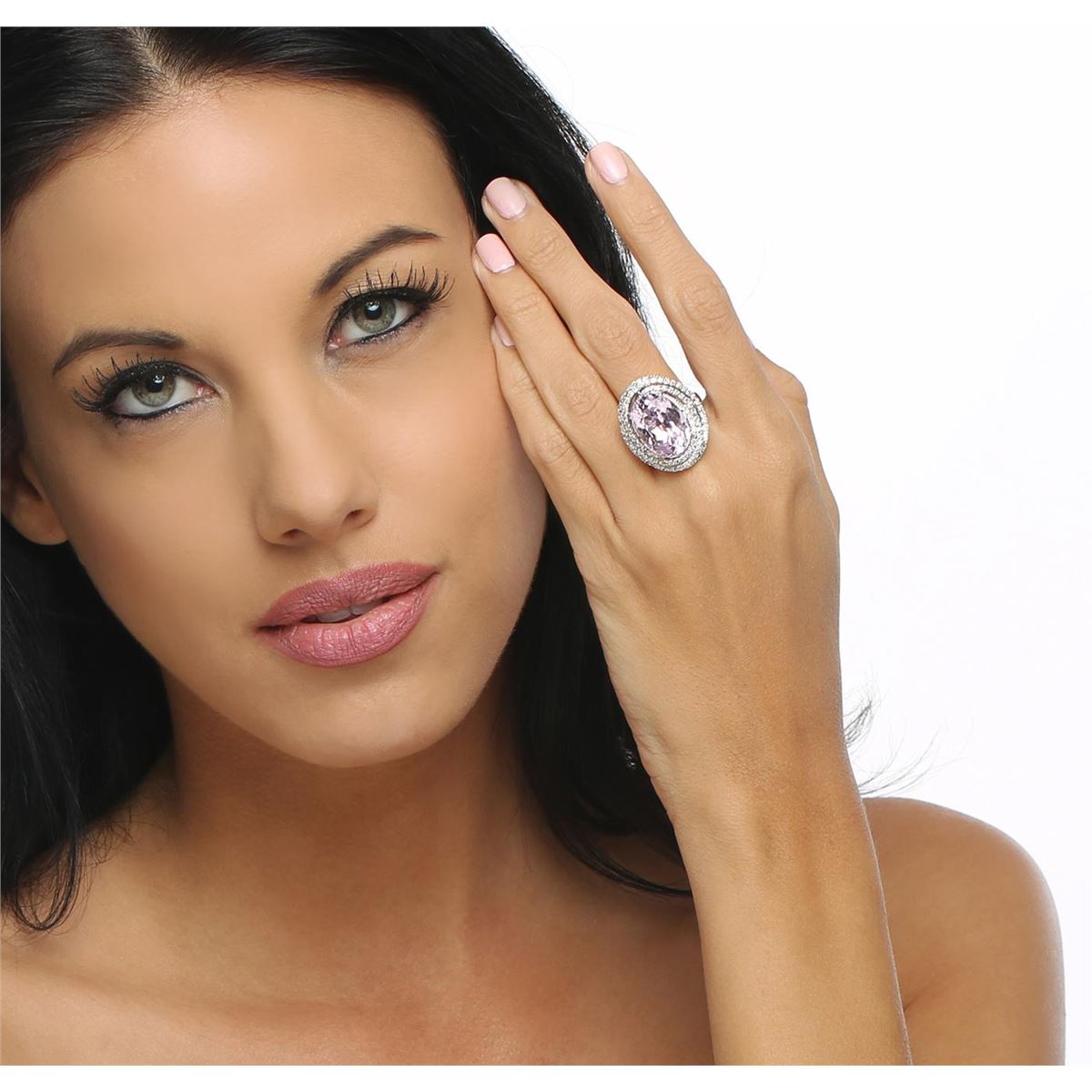 One electronically tested 14KT white gold lady's combination cast and assembled cocktail ring with a high polish finish. Condition is new. Identified with markings of "14K". Containing: One prong set oval modified mixed cut natural kunzite, measuring 17.00 x 12.20 x 7.93mm, approximate weight of 14.76ct., clarity is eye clean, type I, light, very slightly grayish, purple color, (GIA P 3/3), cut is very good. Colored gemstones are presumed to have been subjected to commonly used and possible undetectable color/clarity enhancement processes. One Hundred Twenty-Two prong set round brilliant cut diamonds, measuring 1.30 - 1.30 x 0.78mm (depth est.) approximate. Total Weight of 122 Stones = 1.10ct. Clarity: SI-2 to I-2. Color: H - I, Cut is Good. Total Weight of Colored Stones 14.76ct. Total Weight of Diamonds 1.10ct. Total Weight of Ring 12.10 grams. GGL Appraised at $12,290.00.