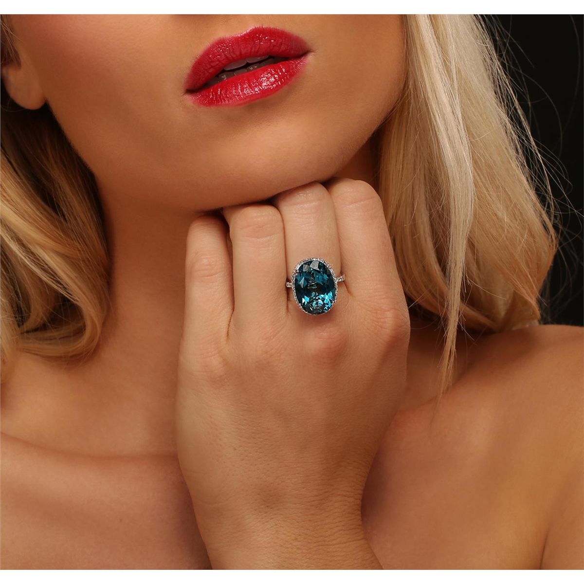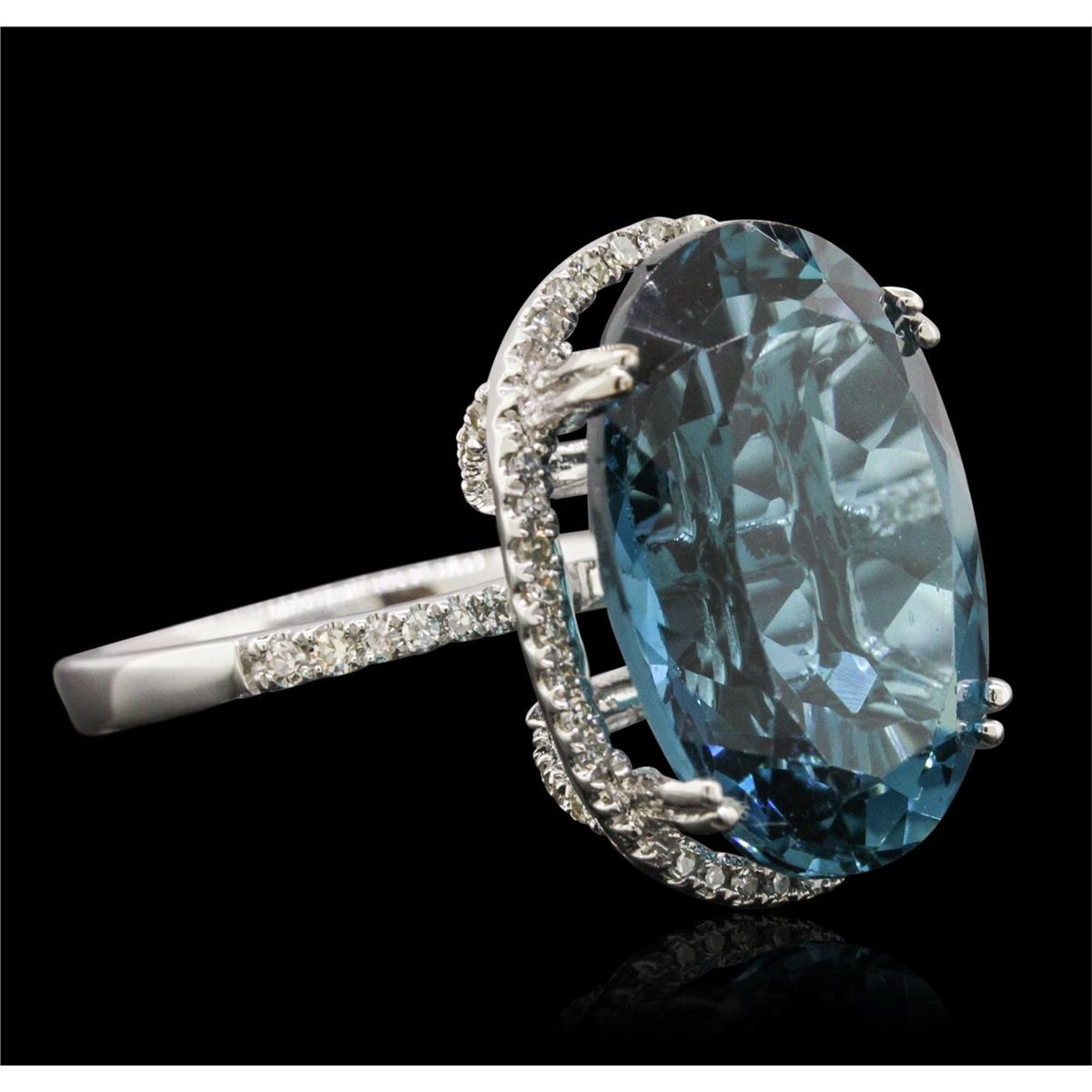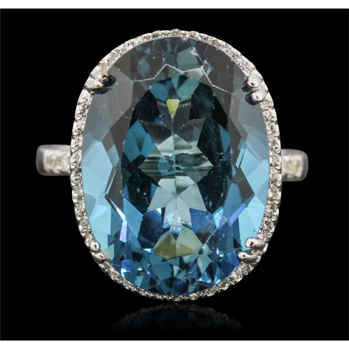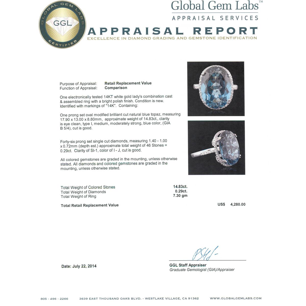 One electronically tested 14KT white gold ladies combination cast & assembled ring with a bright polish finish. Condition is new. Identified with markings of "14K". Containing: One prong set oval modified brilliant cut natural blue topaz, measuring 17.90 x 13.00 x 8.80mm, approximate weight of 14.83ct., clarity is eye clean, type I, medium, moderately strong, blue color, (GIA B 5/4), cut is good. Forty-Six prong set single cut diamonds, measuring 1.40 - 1.00 x 0.72mm (depth est.) approximate total weight of 46 Stones = 0.29ct. Clarity: SI-1. Color: I - J, Cut is Good. All colored gemstones are graded in the mounting, unless otherwise stated. All diamonds and colored gemstones are graded in the mounting, unless otherwise stated. Total Weight of Colored Stones 14.83ct. Total Weight of Diamonds 0.29ct. Total Weight of Ring 7.30 grams. GGL Appraised at $4,280.00.