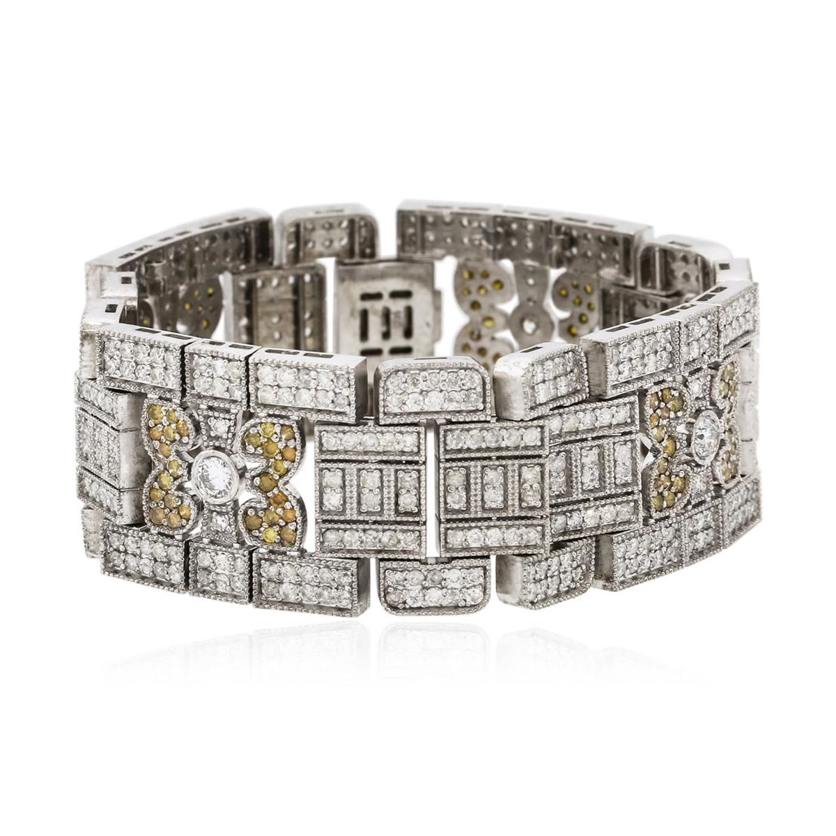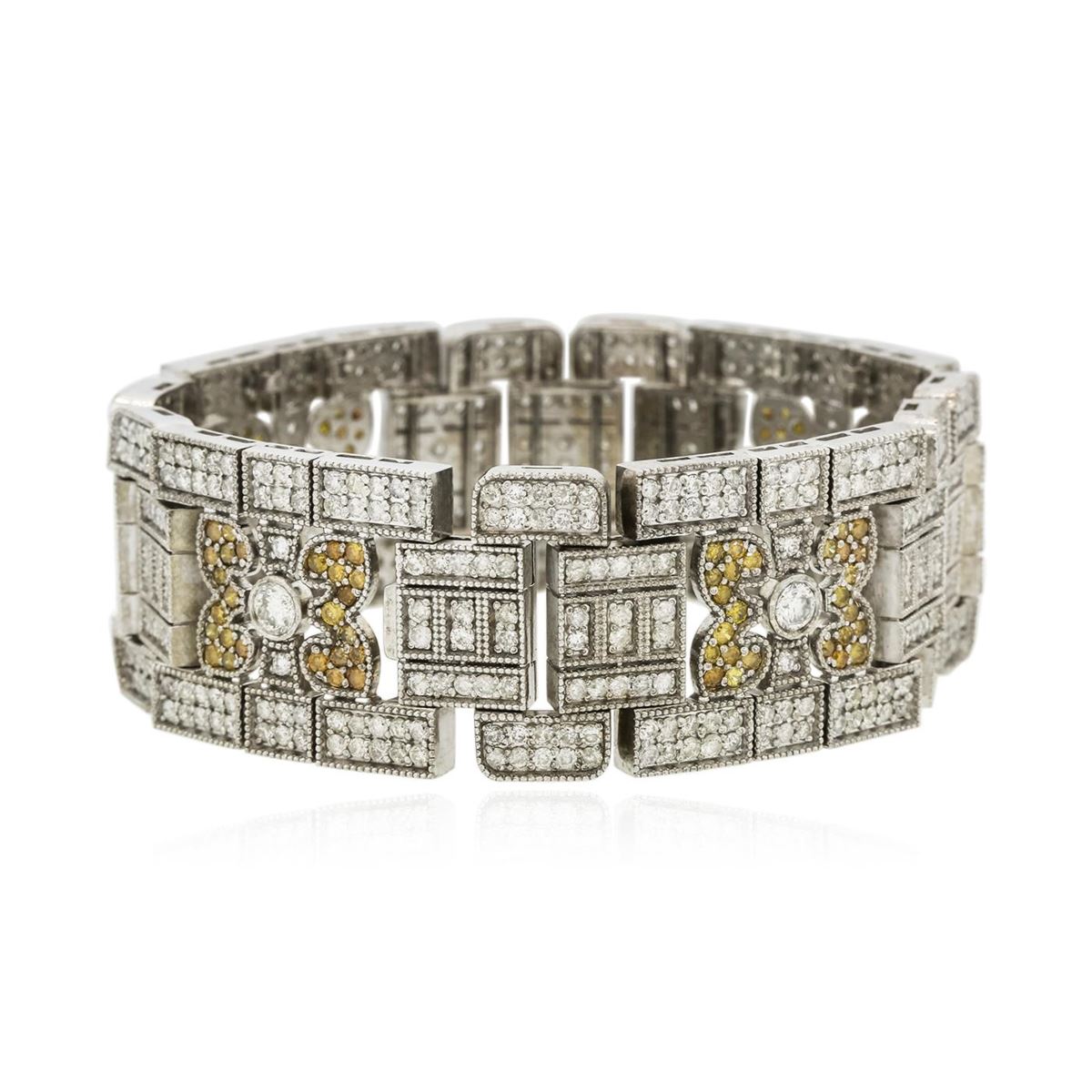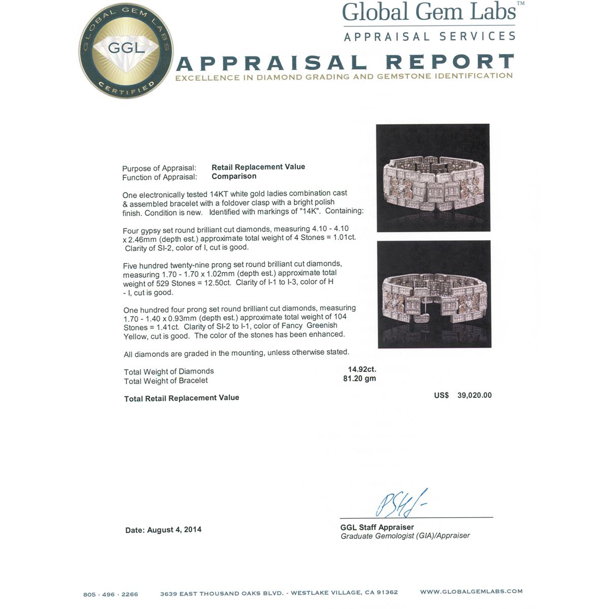 One electronically tested 14KT white gold ladies combination cast & assembled bracelet with a foldover clasp with a bright polish finish. Condition is new. Identified with markings of "14K". Containing: Four gypsy set round brilliant cut diamonds, measuring 4.10 - 4.10 x 2.46mm (depth est.) approximate. Total Weight of 4 Stones = 1.01ct. Clarity: SI-2. Color: I, Cut is Good. Five Hundred Twenty-Nine prong set round brilliant cut diamonds, measuring 1.70 - 1.70 x 1.02mm (depth est.) approximate. Total Weight of 529 Stones = 12.50ct. Clarity: I-1 to I-3. Color: H - I, Cut is Good. One Hundred Four prong set round brilliant cut diamonds, measuring 1.70 - 1.40 x 0.93mm (depth est.) approximate. Total Weight of 104 Stones = 1.41ct. Clarity: SI-2 to I-1, Cut is Good. The color of the stones has been enhanced. All diamonds are graded in the mounting, unless otherwise stated. Total Weight of Diamonds 14.92ct. Total Weight of Bracelet 81.20 grams. GGL Appraised at $39,020.00.