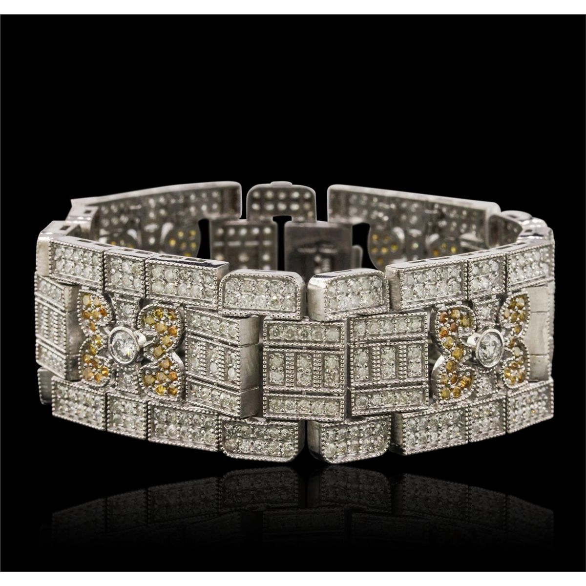 One electronically tested 14KT white gold ladies combination cast & assembled bracelet with a foldover clasp with a bright polish finish. Condition is new. Identified with markings of "14K". Containing: Four gypsy set round brilliant cut diamonds, measuring 4.10 - 4.10 x 2.46mm (depth est.) approximate. Total Weight of 4 Stones = 1.01ct. Clarity: SI-2. Color: I, Cut is Good. Five Hundred Twenty-Nine prong set round brilliant cut diamonds, measuring 1.70 - 1.70 x 1.02mm (depth est.) approximate. Total Weight of 529 Stones = 12.50ct. Clarity: I-1 to I-3. Color: H - I, Cut is Good. One Hundred Four prong set round brilliant cut diamonds, measuring 1.70 - 1.40 x 0.93mm (depth est.) approximate. Total Weight of 104 Stones = 1.41ct. Clarity: SI-2 to I-1, Cut is Good. The color of the stones has been enhanced. All diamonds are graded in the mounting, unless otherwise stated. Total Weight of Diamonds 14.92ct. Total Weight of Bracelet 81.20 grams. Global Gem Labs Appraised at $39,020.00.