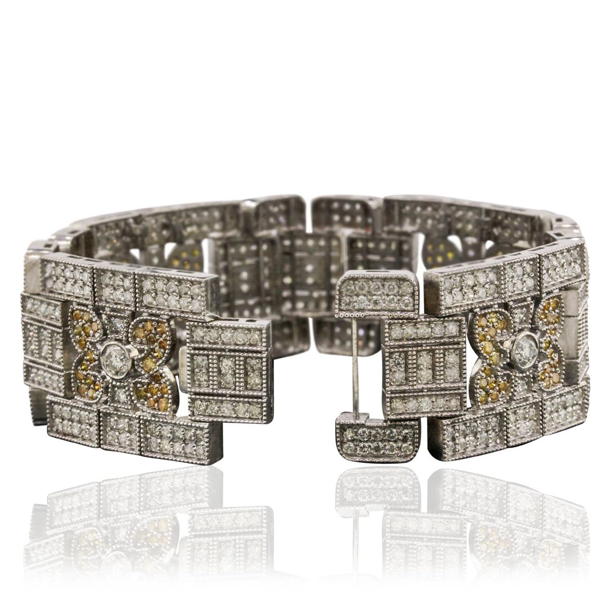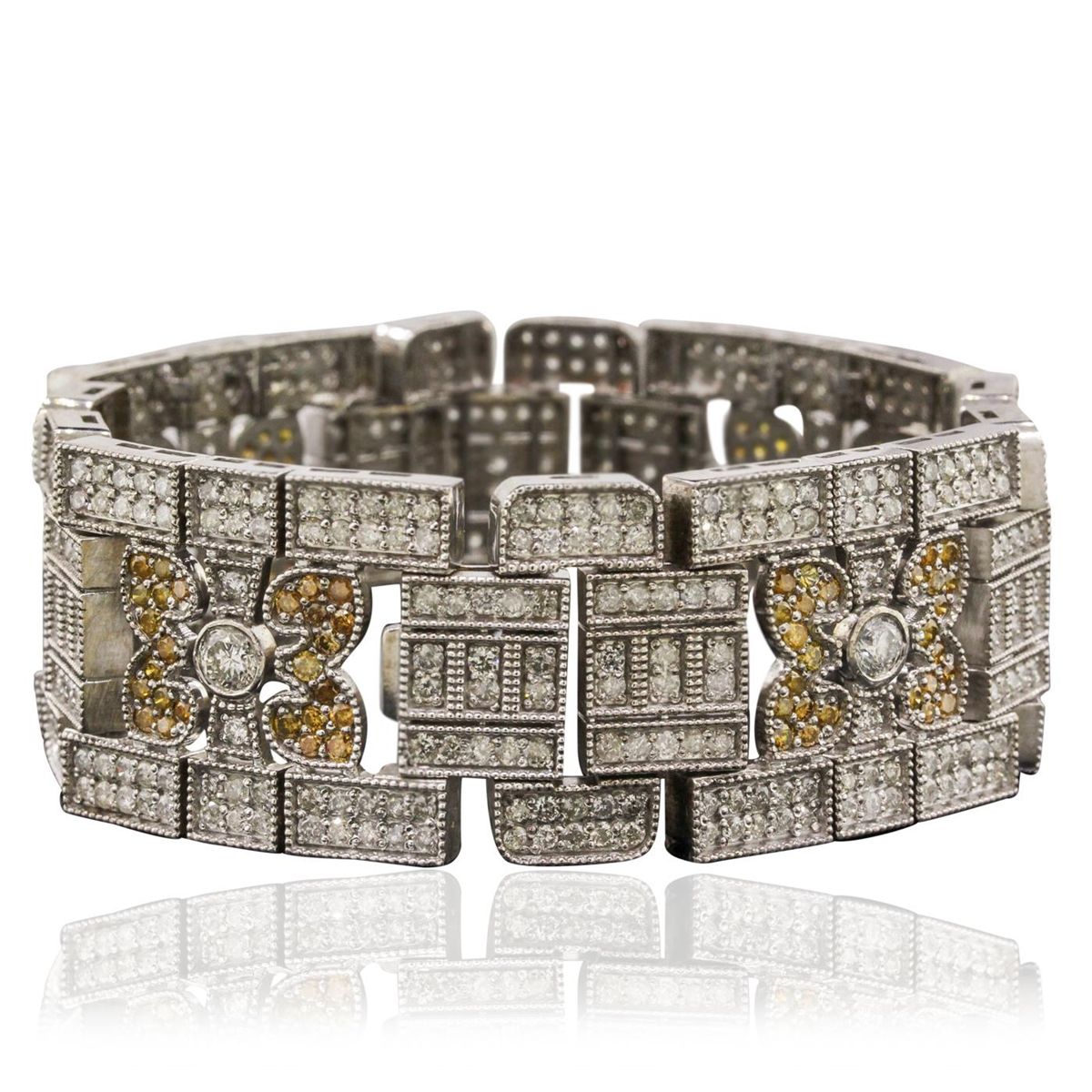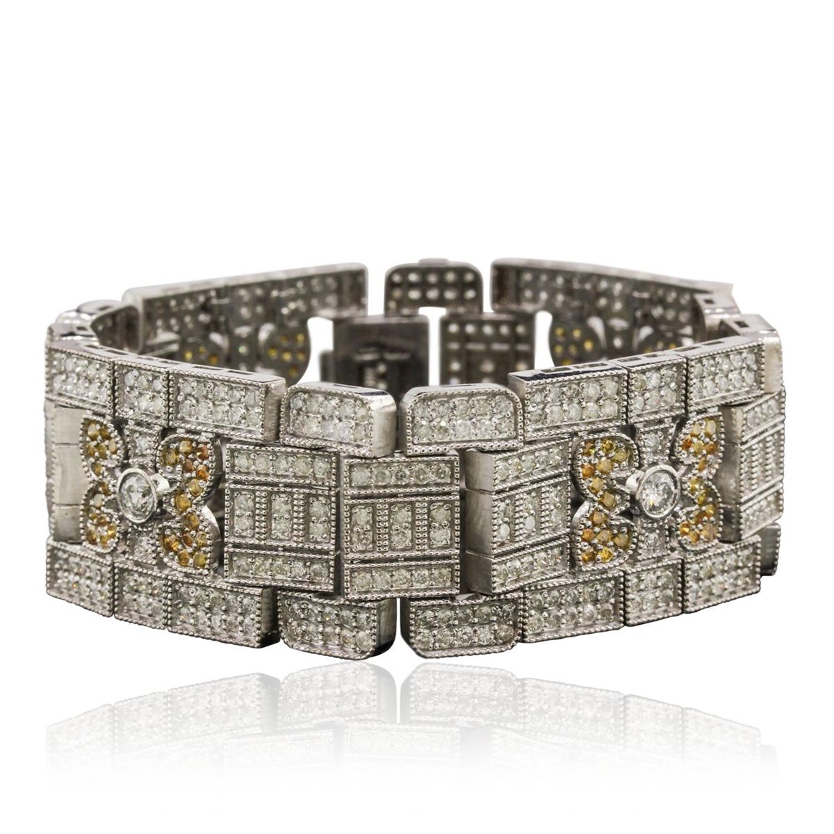 One electronically tested 14KT white gold ladies combination cast & assembled bracelet with a foldover clasp with a bright polish finish. Condition is new. Identified with markings of "14K". Containing: Four gypsy set round brilliant cut diamonds, measuring 4.10 - 4.10 x 2.46mm (depth est.) approximate. Total Weight of 4 Stones = 1.01ct. Clarity: SI-2. Color: I, Cut is Good. Five Hundred Twenty-Nine prong set round brilliant cut diamonds, measuring 1.70 - 1.70 x 1.02mm (depth est.) approximate. Total Weight of 529 Stones = 12.50ct. Clarity: I-1 to I-3. Color: H - I, Cut is Good. One Hundred Four prong set round brilliant cut diamonds, measuring 1.70 - 1.40 x 0.93mm (depth est.) approximate. Total Weight of 104 Stones = 1.41ct. Clarity: SI-2 to I-1, Cut is Good. The color of the stones has been enhanced. All diamonds are graded in the mounting, unless otherwise stated. Total Weight of Diamonds 14.92ct. Total Weight of Bracelet 81.20 grams. Global Gem Labs Appraised at $39,020.00.