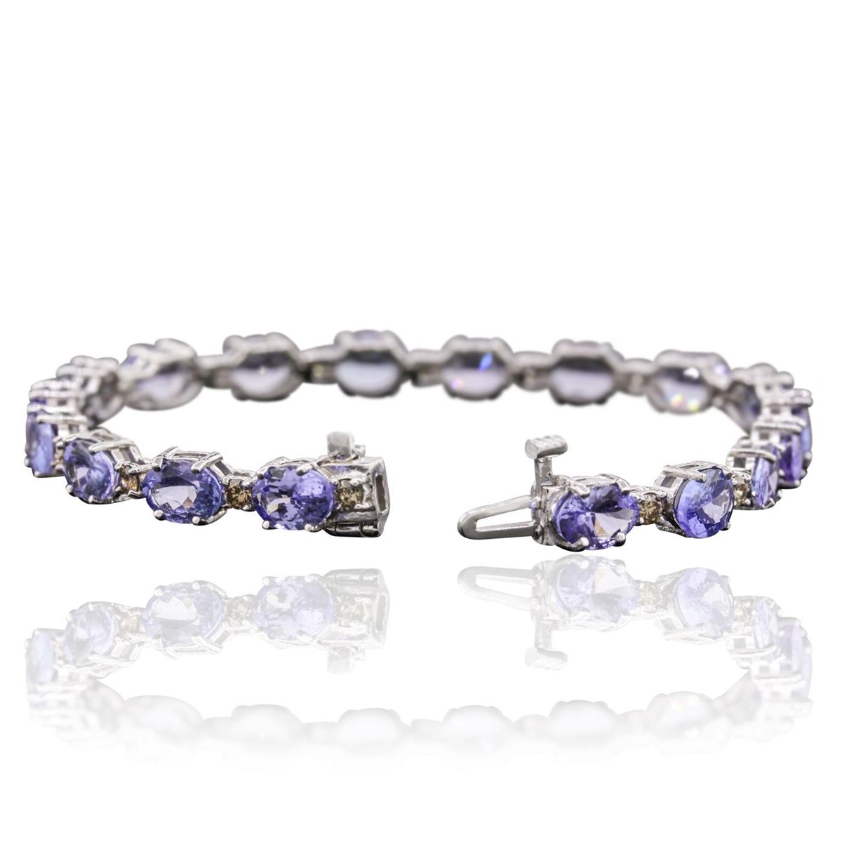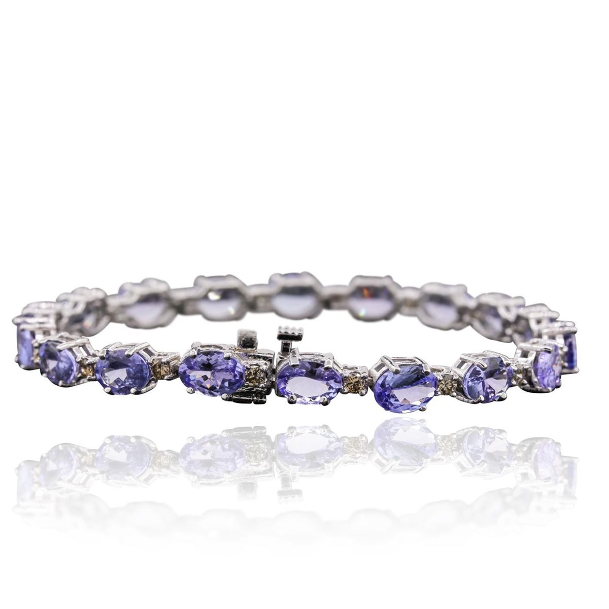 One electronically tested 14KT white gold ladies cast & assembled tanzanite and diamond bracelet with a bright polish finish. Condition is new, good workmanship. Seven inch length bracelet features a flexible ribbon of tanzanite alternated by diamonds terminating in a concealed clasp with safety bar. Identified with markings of "14K". Containing: Eighteen prong set oval mixed cut natural tanzanites, measuring 7.00 x 5.00 x 3.25mm, 6%. bulge factor, approximate. Total Weight of 14.98ct., clarity is eye clean, type I, medium, very slightly grayish, violet color, (GIA V 5/3), cut is good. Transmitting light with a minimum of distortion, transparent. Measurements & the color grade are an average for the group. Graded in the setting. Tanzanite is a very rare gemstone that is only found in the country of Tanzania. Originally discovered in 1967. Tiffany & Company, named the stone Tanzanite. It is found in the Usumburu Mountains that border the Umba Valley of northern Tanzania. Tanzanite occurs in gray, brown, violet, blue, reddish-purple, & green. The gem is interesting because of its exceptional pleochroism. Rotated in different directions a tanzanite will exhibit multiple changes of color. Tanzanite has a low tolerance to ultrasonic cleaning, and should not be cleaned using this method. Eighteen prong set round brilliant cut diamonds, measuring 2.60 - 2.50 x 1.53mm (depth est.) approximate. Total Weight of 18 Stones = 1.19ct. Graded in the setting. Clarity: SI-1 to I-1. Total Weight of Colored Stones 14.98ct. Total Weight of Diamonds 1.19ct. Total Weight of Bracelet 11.20 grams. AIG Appraised at $11,300.00.