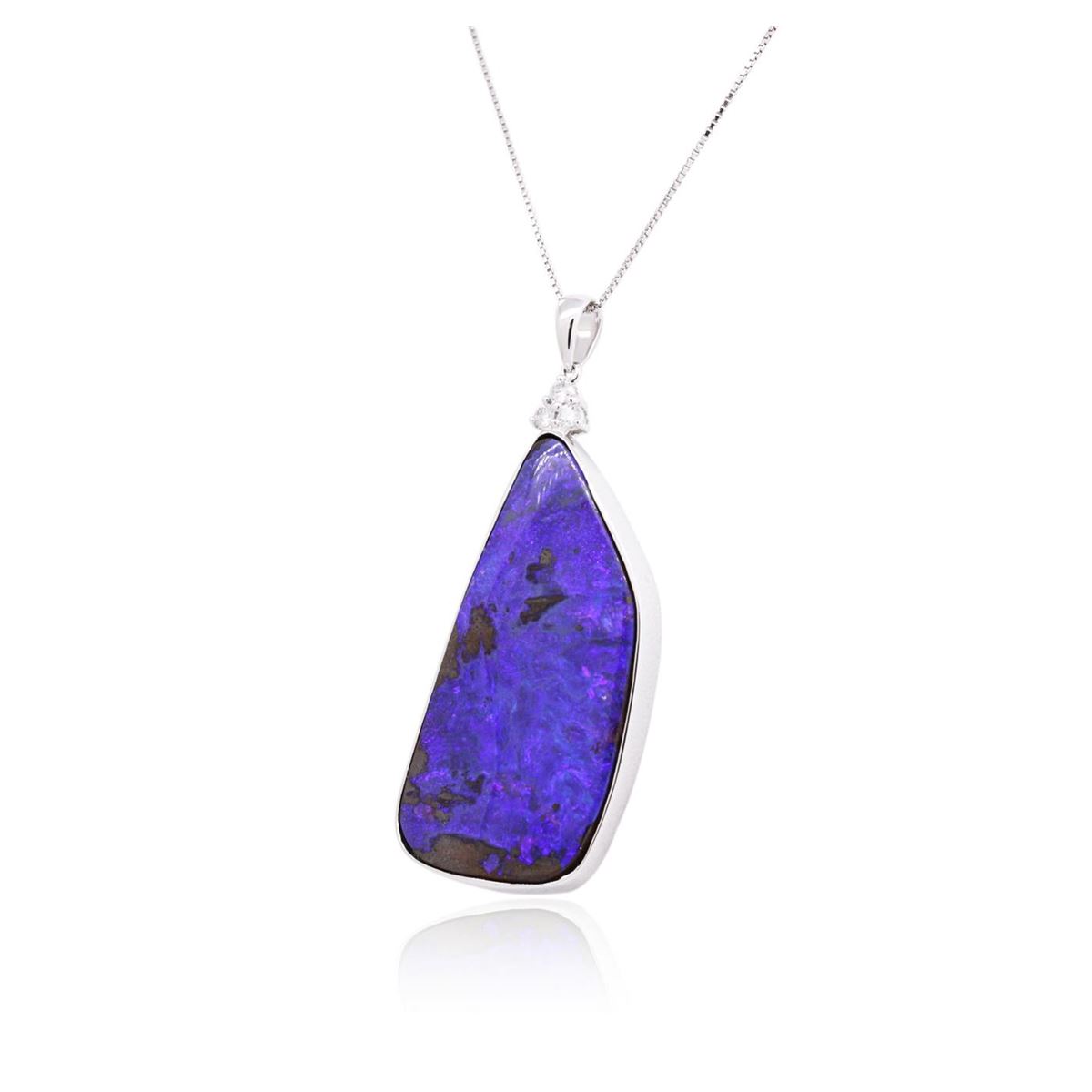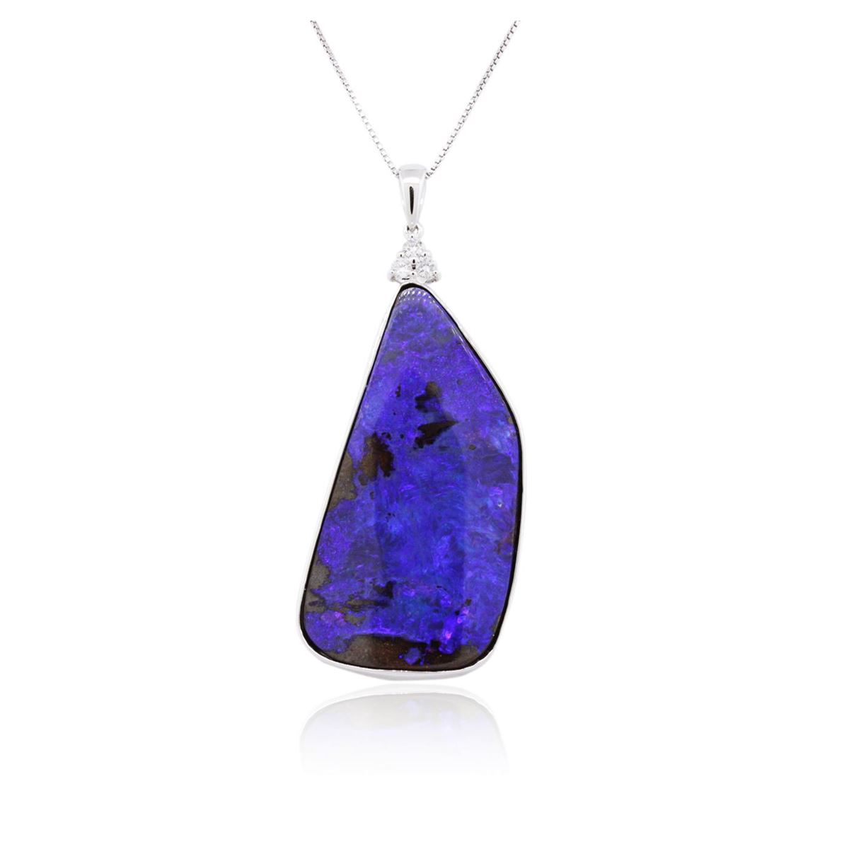 One electronically tested 14KT white gold ladies combination cast & assembled opal and diamond pendant & chain 16.0" long, box link with a spring ring clasp with a bright polish finish. Identified with markings of "14K". Condition is new. Containing: One semi black opal that is cut in a free-form shape and is bezel set, measuring 35.00. mm long x 18.00. mm wide, and 4.30 mm thick and the approximate weight is 15.00. carats. The opal has a somewhat bright, blue only play of color (fire) in a rolling flashfire pattern; a dome; a good cut; slightly included; consistent in its brightness and pattern; and is somewhat directional. Three prong set round brilliant cut diamonds, measuring 1.80 - 1.80 x 1.08mm (depth est.) approximate total weight of 3 Stones = 0.06ct. Clarity: I-1. Color: I - J, Cut is Good. Colored gemstones are presumed to have been subjected to commonly used enhancement processes. All diamonds and colored gemstones are graded in the mounting, unless otherwise stated. Total Weight of Diamonds 0.06ct. Total Weight of Opals 15.00ct. Total Weight of Pendant & Chain 9.70 grams. GGL Appraised at $2,835.00.