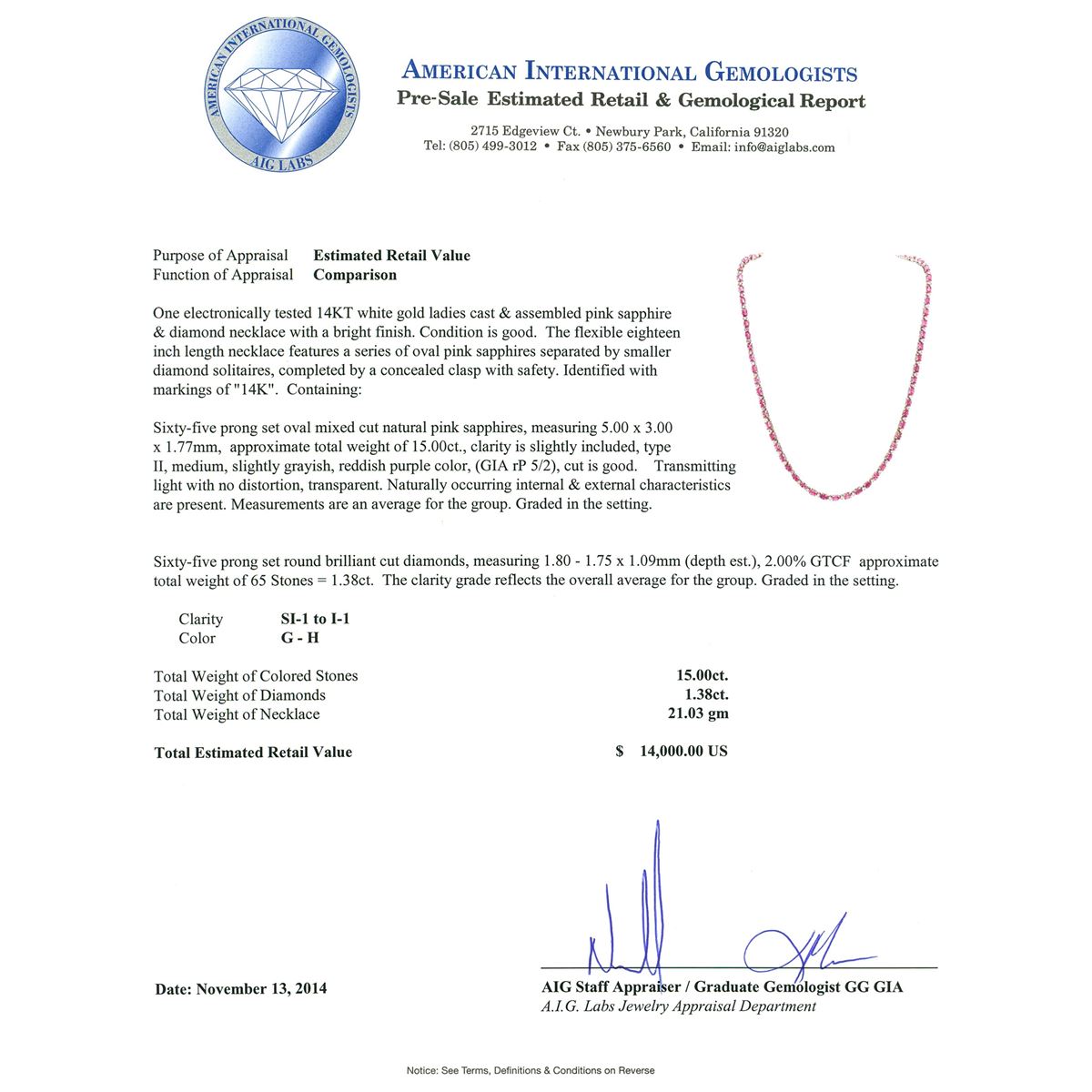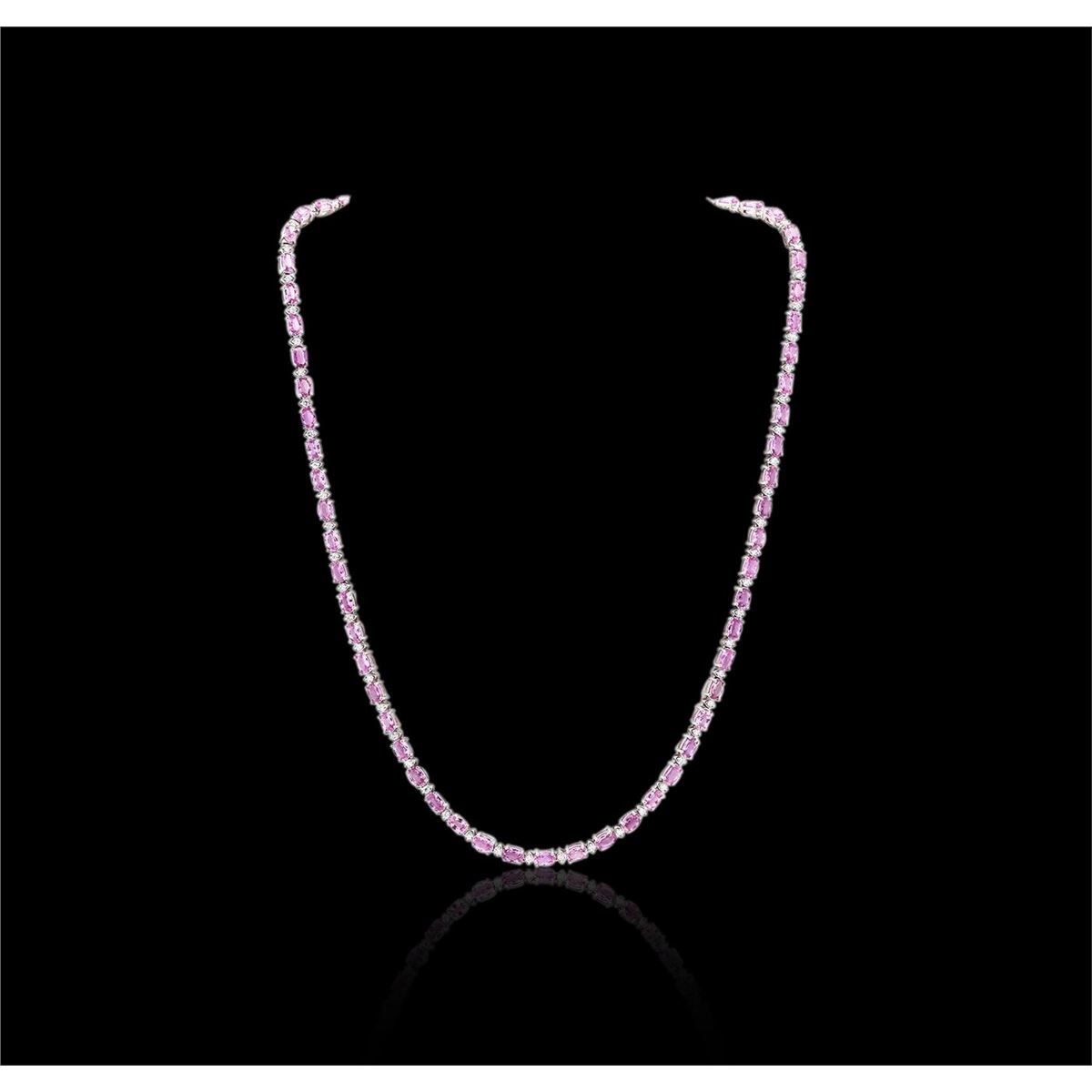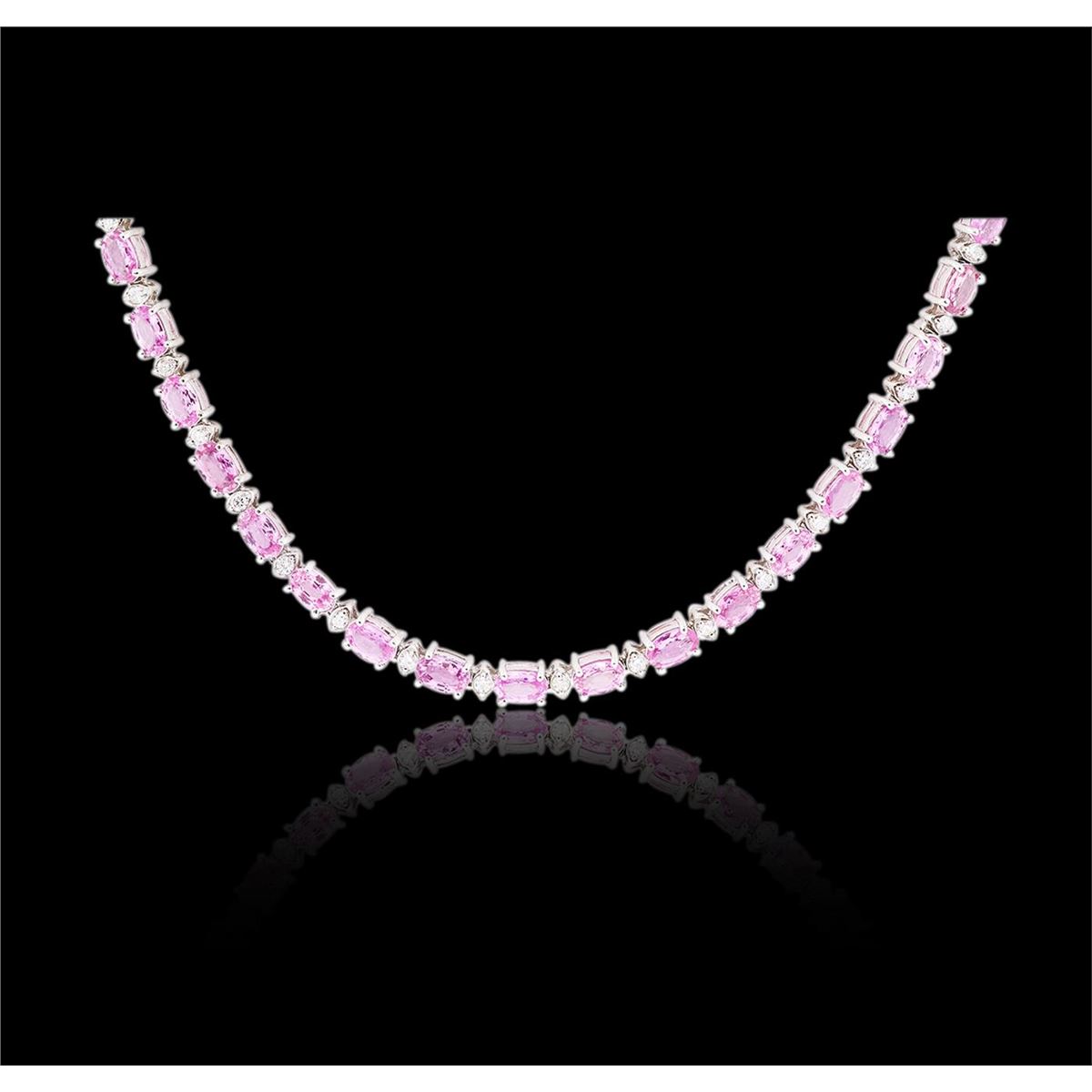 One electronically tested 14KT white gold ladies cast & assembled pink sapphire & diamond necklace with a bright finish.  The flexible eighteen inch length necklace features a series of oval pink sapphires separated by smaller diamond solitaires, completed by a concealed clasp with safety. Identified with markings of "14K". Condition is good. Containing: Sixty-five prong set oval mixed cut natural pink sapphires, measuring 5.00 x 3.00 x 1.77mm,  approximate total weight of 15.00ct., clarity is slightly included, type II, medium, slightly grayish, reddish purple color, (GIA rP 5/2), cut is good. Transmitting light with no distortion, transparent. Naturally occurring internal & external characteristics are present. Measurements are an average for the group. Graded in the setting. Sixty-Five prong set round brilliant cut diamonds, measuring 1.80 - 1.75 x 1.09mm (depth est.), 2.00% GTCF  approximate total weight of 65 Stones = 1.38ct.  The clarity grade reflects the overall average for the group. Graded in the setting. Clarity SI-1 to I-1. Color G - H. Total Weight of Colored Stones 15.00ct. Total Weight of Diamonds 1.38ct. Total Weight of Necklace 21.03 grams. AIG Appraised at $14,000.00.