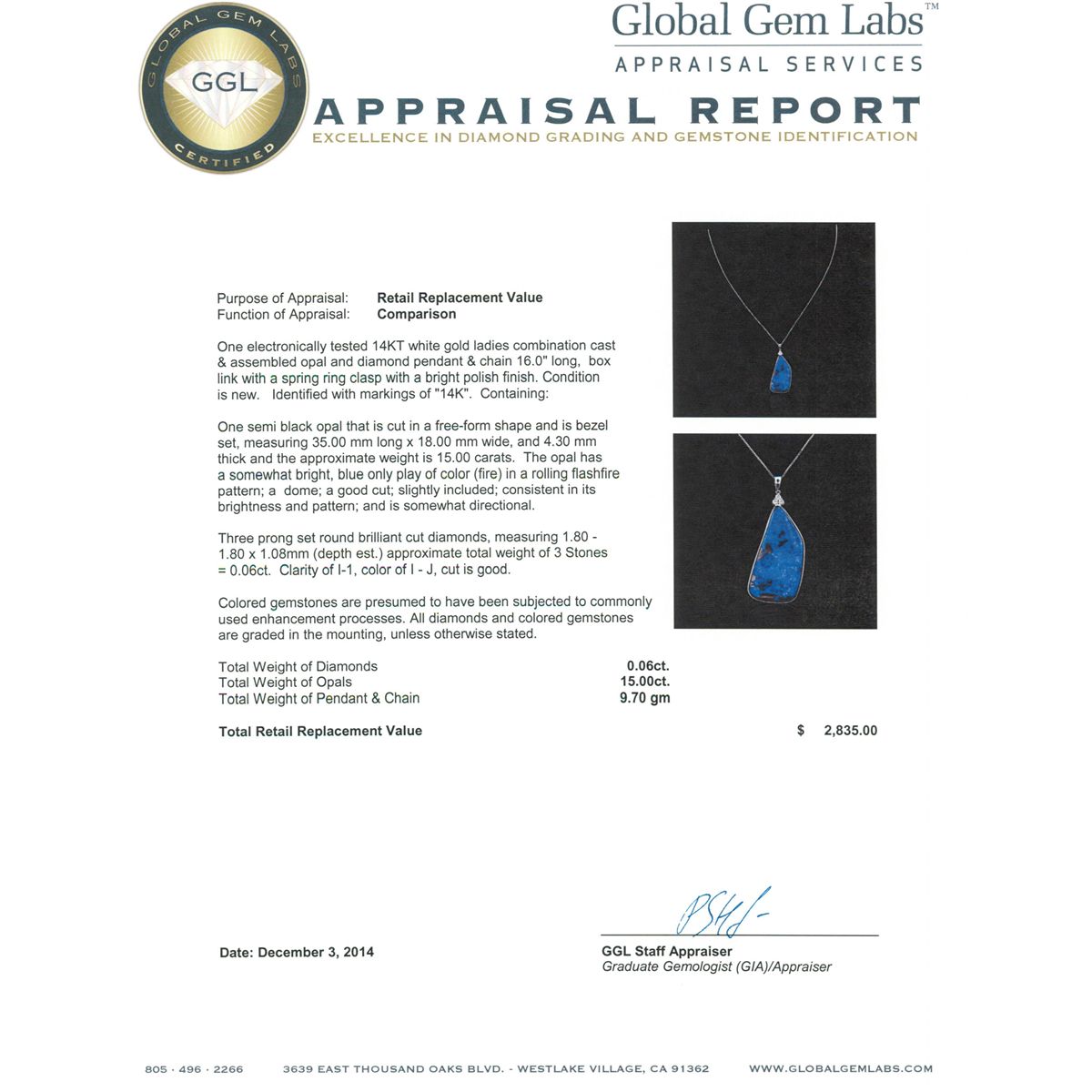 One electronically tested 14KT white gold ladies combination cast & assembled opal and diamond pendant & chain 16.0" long, box link with a spring ring clasp with a bright polish finish. Identified with markings of "14K". Condition is new. Containing: One semi black opal that is cut in a free-form shape and is bezel set, measuring 35.00. mm long x 18.00. mm wide, and 4.30 mm thick and the approximate weight is 15.00. carats. The opal has a somewhat bright, blue only play of color (fire) in a rolling flashfire pattern; a dome; a good cut; slightly included; consistent in its brightness and pattern; and is somewhat directional. Three prong set round brilliant cut diamonds, measuring 1.80 - 1.80 x 1.08mm (depth est.) approximate total weight of 3 Stones = 0.06ct. Clarity: I-1. Color: I - J, Cut is Good. Colored gemstones are presumed to have been subjected to commonly used enhancement processes. All diamonds and colored gemstones are graded in the mounting, unless otherwise stated. Total Weight of Diamonds 0.06ct. Total Weight of Opals 15.00ct. Total Weight of Pendant & Chain 9.70 grams. GGL Appraised at $2,835.00.