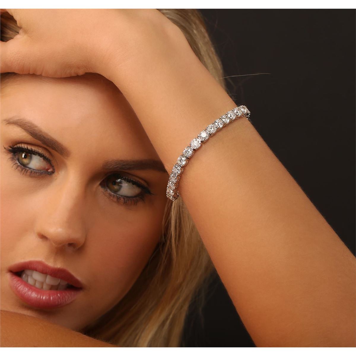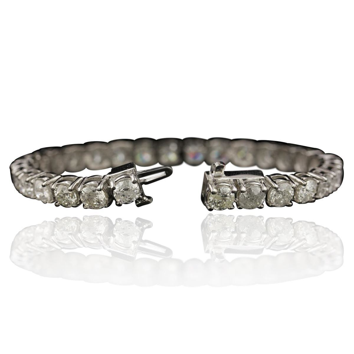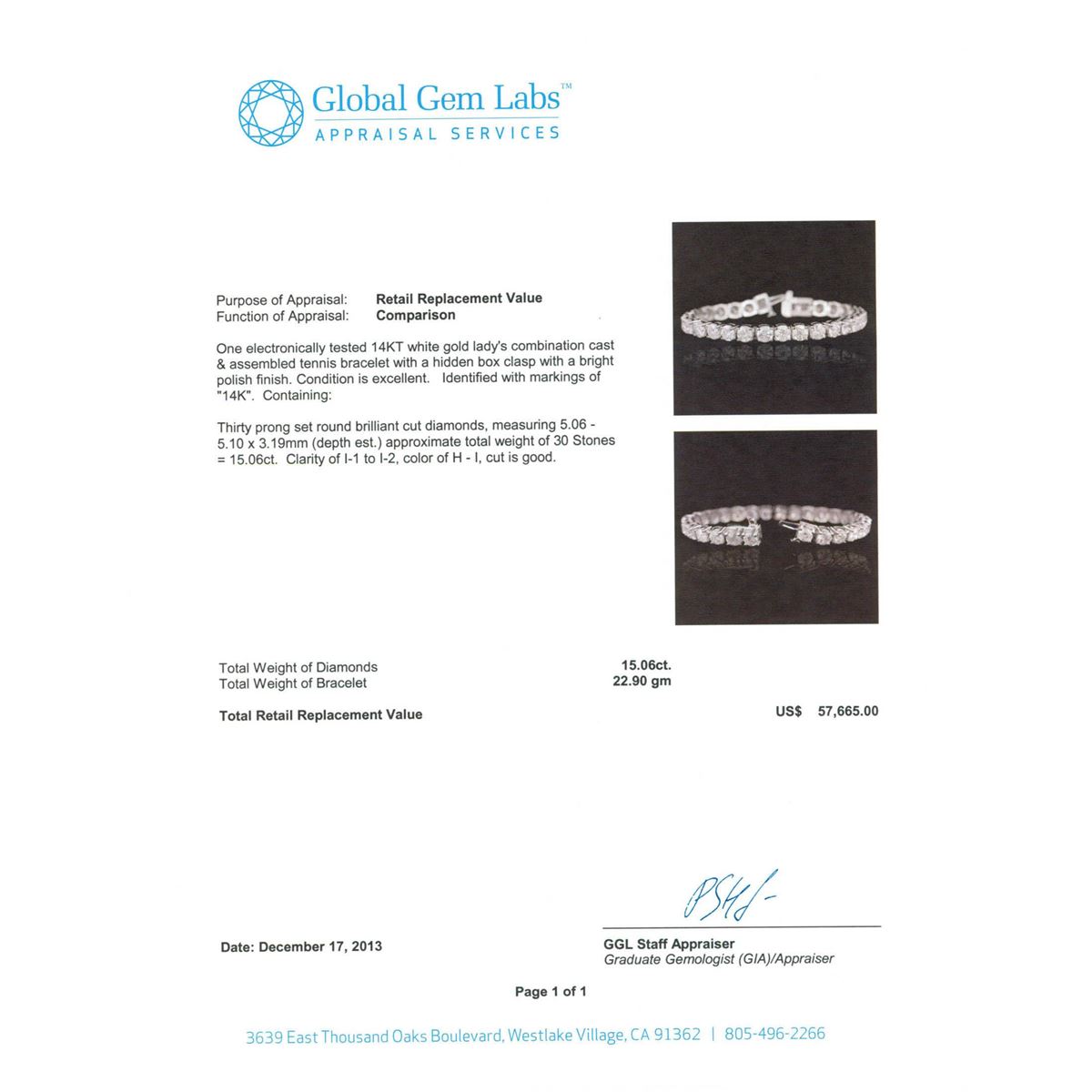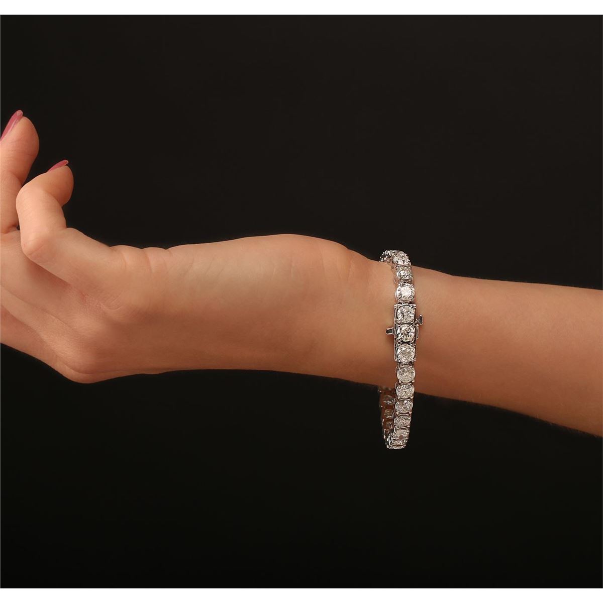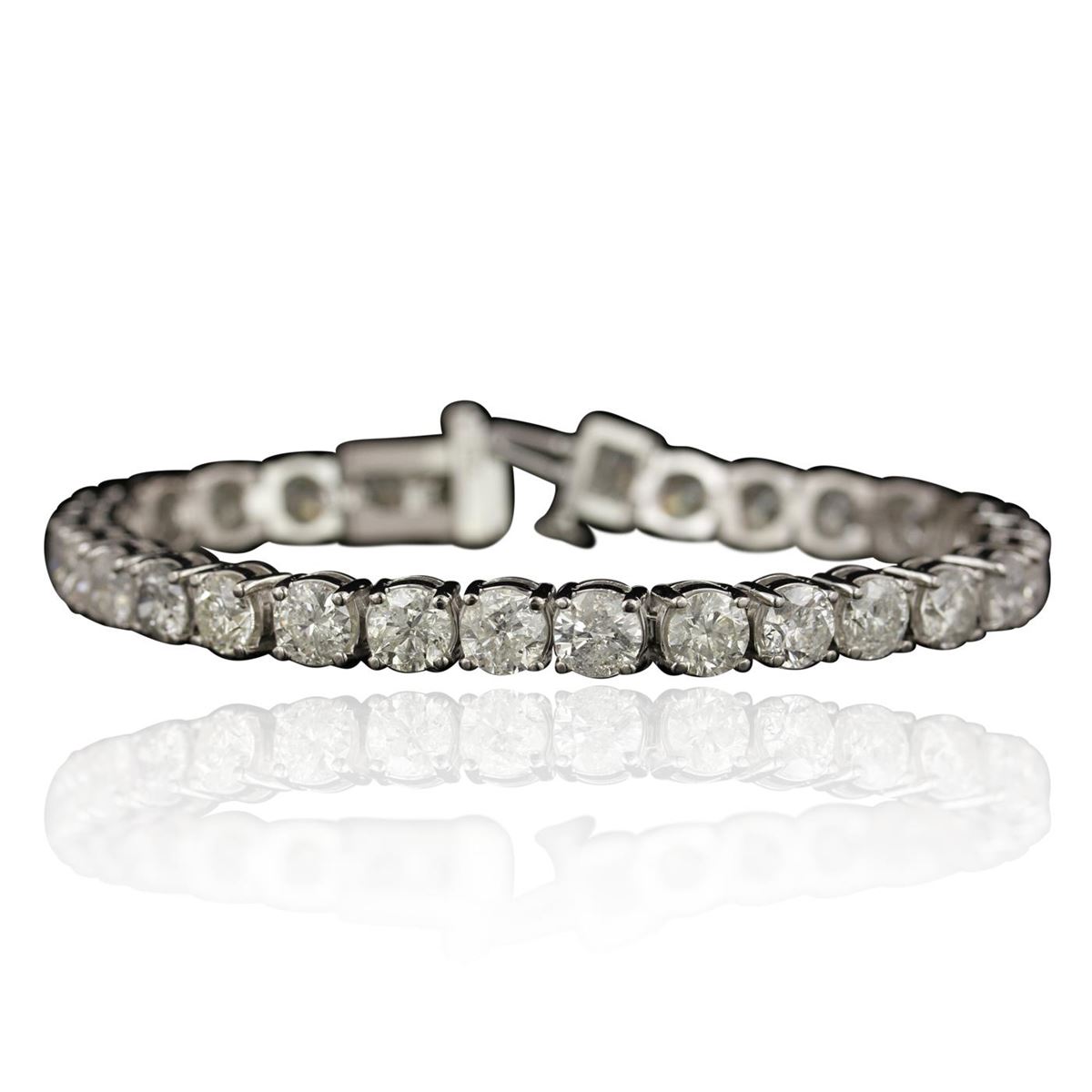 One electronically tested 14KT white gold Ladies combination cast & assembled tennis bracelet with a hidden box clasp with a bright polish finish. Identified with markings of "14K". Condition is excellent. Containing: Thirty prong set round brilliant cut diamonds, measuring 5.06 - 5.10 x 3.19mm (depth est.) approximate total weight of 30 Stones = 15.06ct. Clarity of I1 to I-2, Color of H - I, Cut is Good. Total Weight of Diamonds 15.06ct. Total Weight of Bracelet 22.90gm. GGL Appraised at $57,665.00.