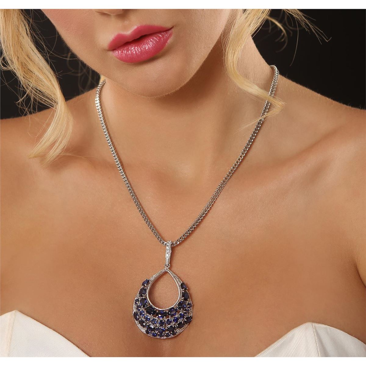 One electronically tested 14KT white gold ladies cast & assembled blue sapphire and diamond pendant with chain. Condition is new, good workmanship. The pendant features sapphires set within a stylized tear drop design with diamond accents, completed by a diamond set bail. The pendant is supported by an eighteen inch length 14KT white gold designer style chain, terminating in a lobster claw clasp. Bright polish finish with migraine detailing. Identified with markings of "K14". Containing: Thirty-two prong set round and oval mixed cut natural blue sapphires approximate total weight of 15.07ct., clarity is slightly included, type II, medium dark, very slightly grayish, blue color, (GIA B 6/3), cut is good. Transmitting light with a minimum of distortion, transparent. Naturally occurring internal & external characteristics are present. Indications of laboratory high temperature diffusion treatment. Color grade is an average for the group. Graded in the setting. Twenty-nine bead set round brilliant cut diamonds, measuring 2.30 - 1.80 x 1.23mm (depth est.) approximate total weight of 29 Stones = 0.79ct. Graded in the setting. Clarity VS-2 to SI-1. Color G - H. Total Weight of Colored Stones 15.07ct. Total Weight of Diamonds 0.79ct. Total Weight of Pendant With Chain 26.87gm. AIG Appraised at $11,000.00.