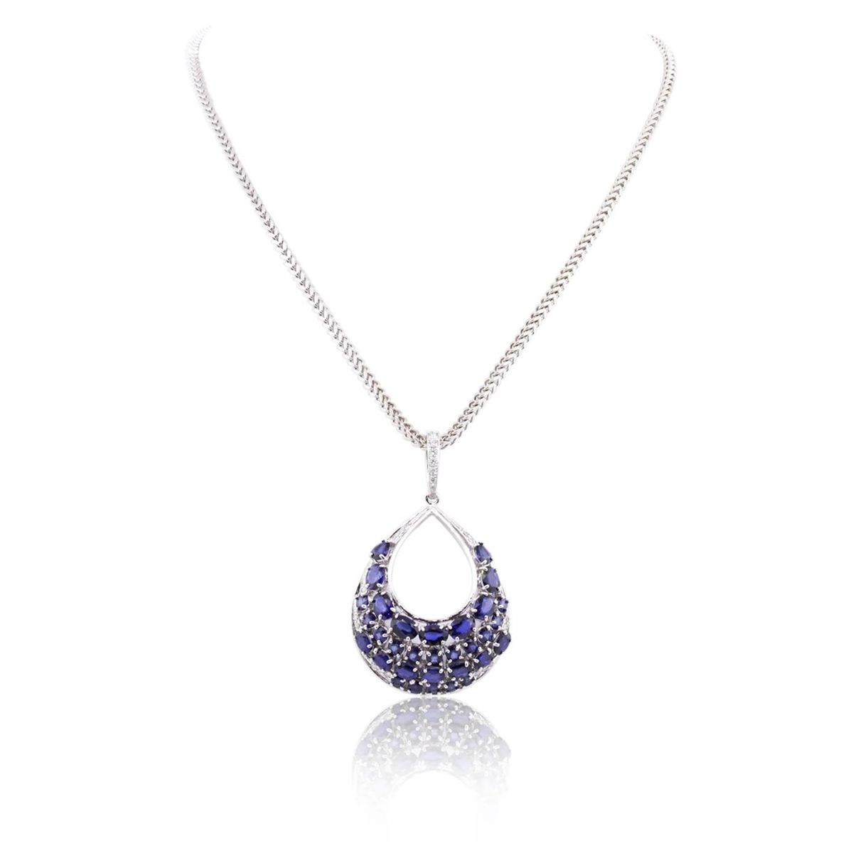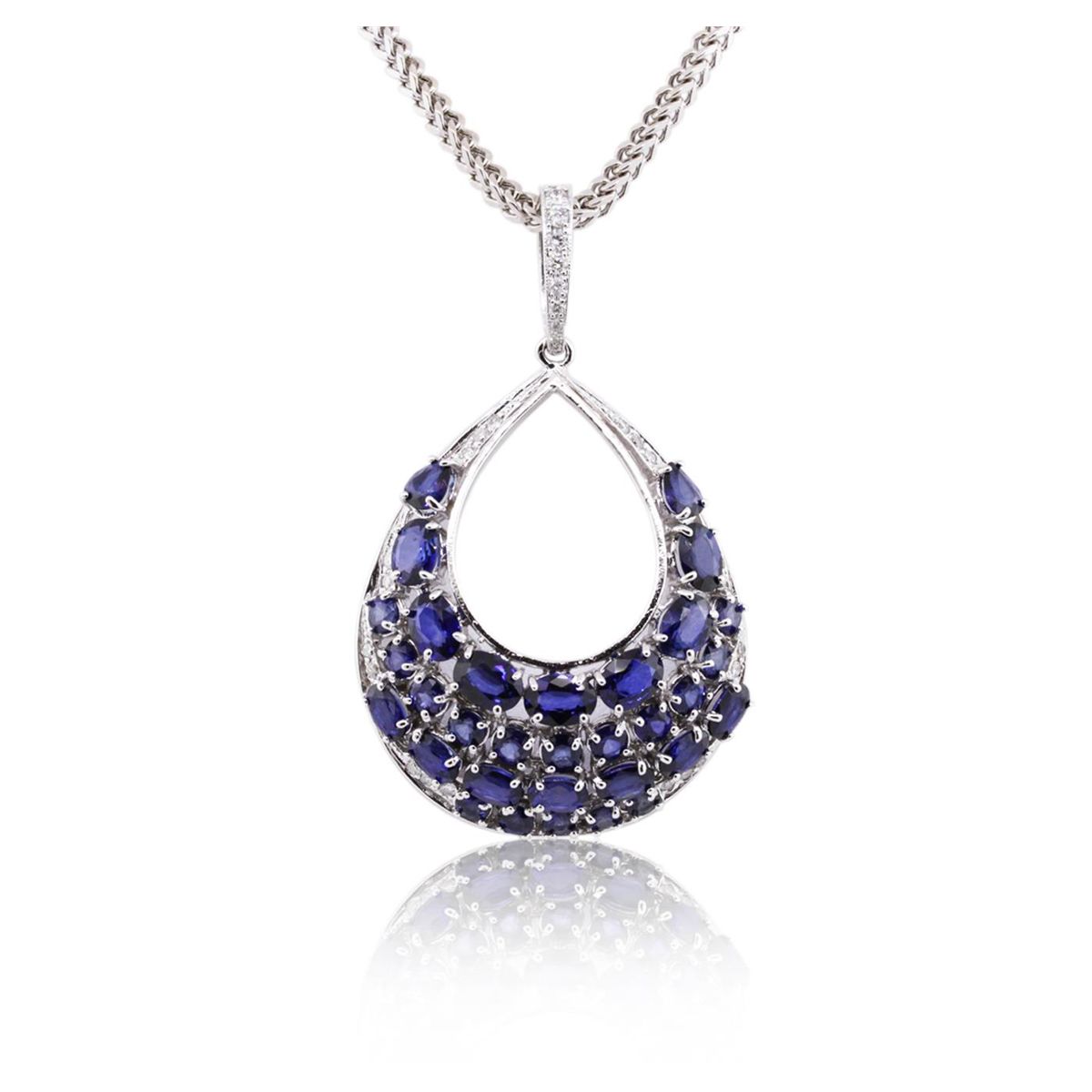 One electronically tested 14KT white gold ladies cast & assembled blue sapphire and diamond pendant with chain. Condition is new, good workmanship. The pendant features sapphires set within a stylized tear drop design with diamond accents, completed by a diamond set bail. The pendant is supported by an eighteen inch length 14KT white gold designer style chain, terminating in a lobster claw clasp. Bright polish finish with migraine detailing. Identified with markings of "K14". Containing: Thirty-two prong set round and oval mixed cut natural blue sapphires approximate total weight of 15.07ct., clarity is slightly included, type II, medium dark, very slightly grayish, blue color, (GIA B 6/3), cut is good. Transmitting light with a minimum of distortion, transparent. Naturally occurring internal & external characteristics are present. Indications of laboratory high temperature diffusion treatment. Color grade is an average for the group. Graded in the setting. Twenty-nine bead set round brilliant cut diamonds, measuring 2.30 - 1.80 x 1.23mm (depth est.) approximate total weight of 29 Stones = 0.79ct. Graded in the setting. Clarity VS-2 to SI-1. Color G - H. Total Weight of Colored Stones 15.07ct. Total Weight of Diamonds 0.79ct. Total Weight of Pendant With Chain 26.87gm. AIG Appraised at $11,000.00.