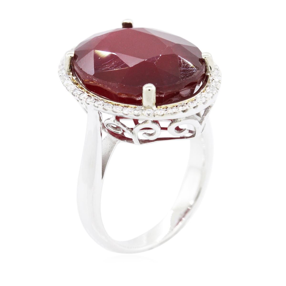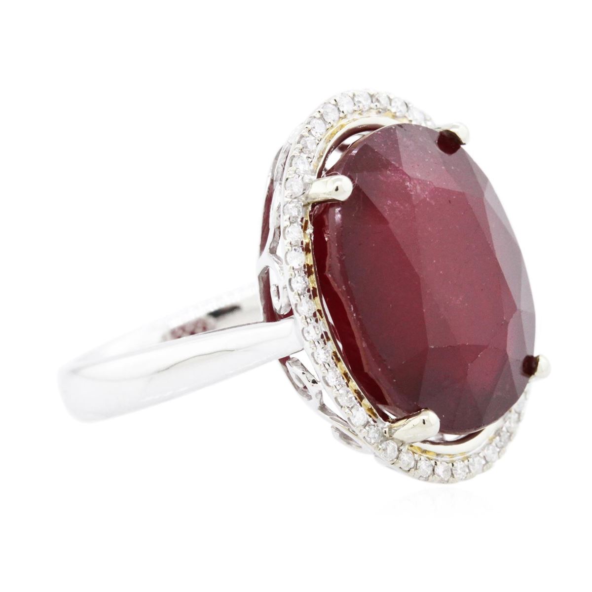 One electronically tested 14KT white gold ladies combination cast & assembled ruby and diamond ring with a flat shank with a bright polish finish. Identified with markings of "14K". Condition is new. Containing: One prong set oval modified brilliant cut natural ruby, measuring 16.96 x 13.60 x 8.15mm, approximate weight of 15.22ct., clarity is heavily included, type II, medium dark, moderately strong, strongly purplish red color, (GIA stpR 6/4), cut is good. Forty-Four prong set round brilliant cut diamonds, measuring 1.00 - 1.00 x 0.60mm (depth est.) stated total weight of 44 Stones = 0.16ct. Clarity: I-1 to I-2. Color: I - J, Cut is Good. Colored gemstones are presumed to have been subjected to commonly used enhancement processes. All diamonds and colored gemstones are graded in the mounting, unless otherwise stated total weight of Colored Stones 15.22ct. Total Weight of Diamonds 0.16ct. Total Weight of Ring 9.80 grams. GGL Appraised at $8,195.00.