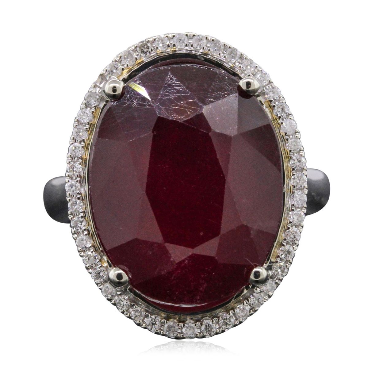 One electronically tested 14KT white gold ladies combination cast & assembled ruby and diamond ring with a flat shank with a bright polish finish.  Identified with markings of "14K". Condition is new. Containing: One prong set oval modified brilliant cut natural ruby, measuring 16.96 x 13.60 x 8.15mm, approximate weight of 15.22ct., clarity is heavily included, type II, medium dark, moderately strong, strongly purplish red color, (GIA stpR 6/4), cut is good. Forty-Four prong set round brilliant cut diamonds, measuring 1.00 - 1.00 x 0.60mm (depth est.) stated total weight of 44 Stones = 0.16ct. Clarity: I-1 to I-2. Color: I - J, Cut is Good. Colored gemstones are presumed to have been subjected to commonly used enhancement processes. All diamonds and colored gemstones are graded in the mounting, unless otherwise stated total weight of Colored Stones 15.22ct. Total Weight of Diamonds 0.16ct. Total Weight of Ring 9.80 grams. GGL Appraised at $8,195.00.