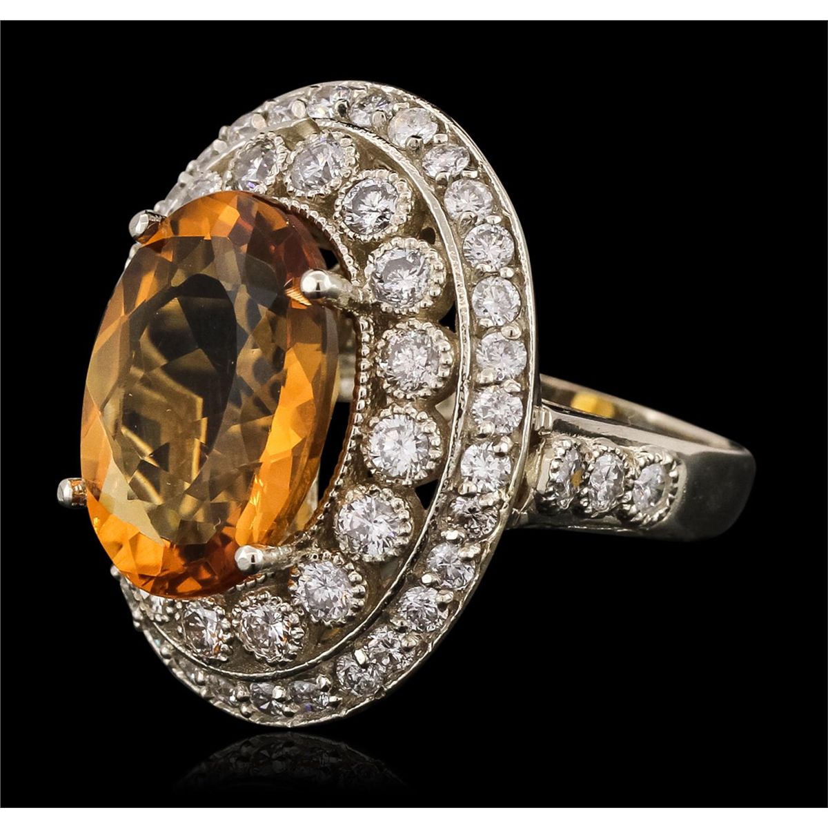 One electronically tested 14KT white gold ladies combination cast & assembled engagement ring with a bright polish finish. Identified with markings of "14K". Condition is new. Containing: One prong set oval modified brilliant cut natural citrine quartz, measuring 26.00 x 12.20 x 7.93mm, approximate weight of 15.39ct., clarity is eye clean, type I, medium light, brownish, orangy yellow color, (GIA oY 4/3), cut is good. Fifty prong set round brilliant cut diamonds, measuring 2.50 - 1.90 x 1.32mm (depth est.) approximate total weight of 50 Stones = 1.95ct. Clarity: SI-2 to I-1. Color: I - J, Cut is Good. Colored gemstones are presumed to have been subjected to commonly used enhancement processes. All diamonds and colored gemstones are graded in the mounting, unless otherwise stated. Total Weight of Colored Stones 15.39ct. Total Weight of Diamonds 1.95ct. Total Weight of Ring 12.00 grams. GGL Appraised at $7,970.00.