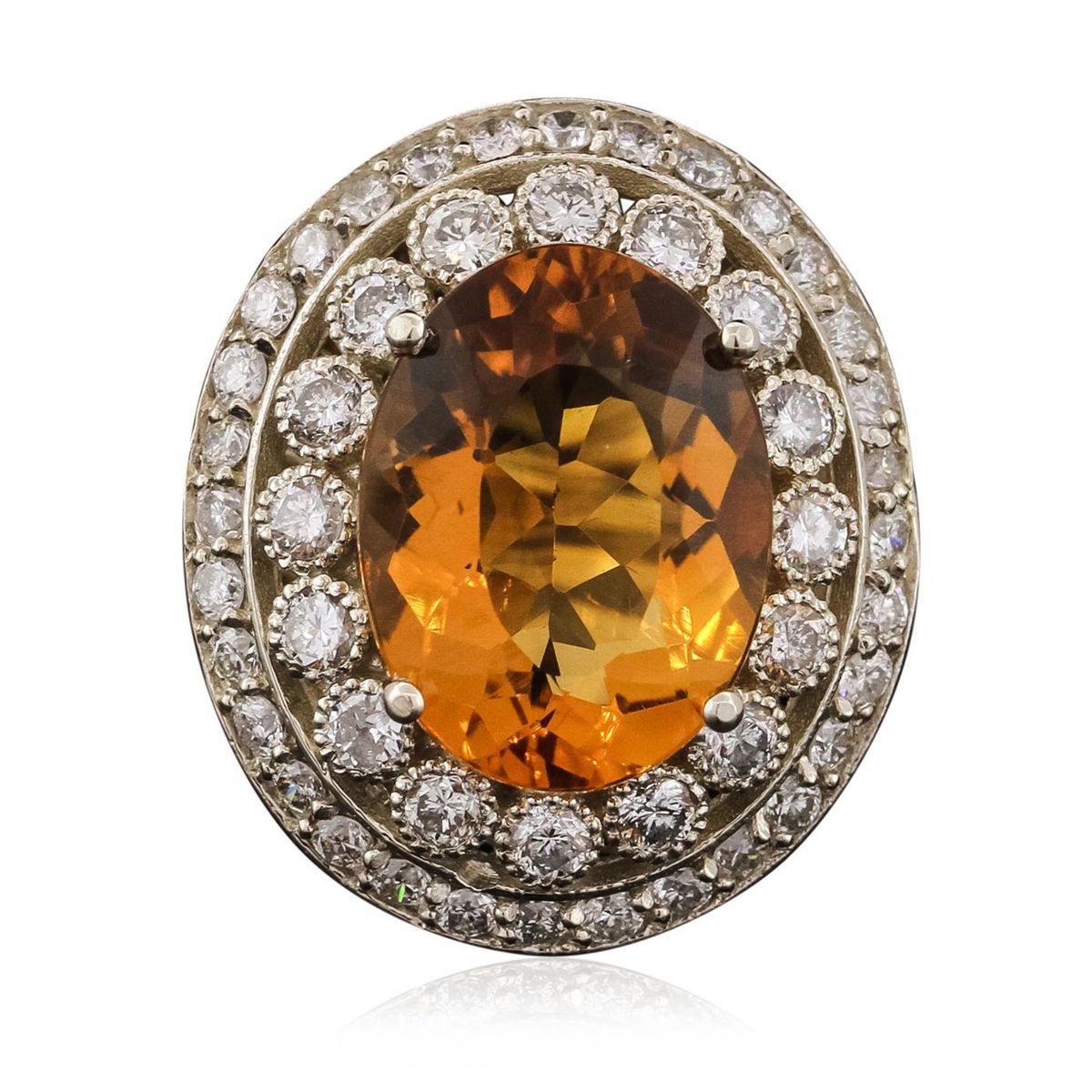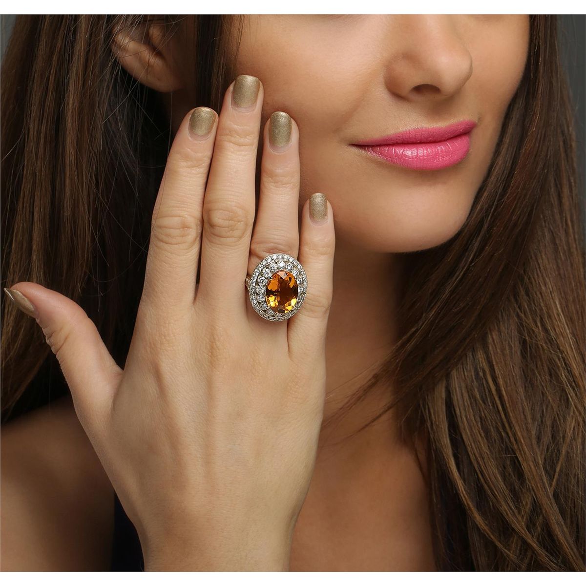 One electronically tested 14KT white gold ladies combination cast & assembled engagement ring with a bright polish finish. Identified with markings of "14K". Condition is new. Containing: One prong set oval modified brilliant cut natural citrine quartz, measuring 26.00 x 12.20 x 7.93mm, approximate weight of 15.39ct., clarity is eye clean, type I, medium light, brownish, orangy yellow color, (GIA oY 4/3), cut is good. Fifty prong set round brilliant cut diamonds, measuring 2.50 - 1.90 x 1.32mm (depth est.) approximate total weight of 50 Stones = 1.95ct. Clarity: SI-2 to I-1. Color: I - J, Cut is Good. Colored gemstones are presumed to have been subjected to commonly used enhancement processes. All diamonds and colored gemstones are graded in the mounting, unless otherwise stated. Total Weight of Colored Stones 15.39ct. Total Weight of Diamonds 1.95ct. Total Weight of Ring 12.00 grams. GGL Appraised at $7,970.00.