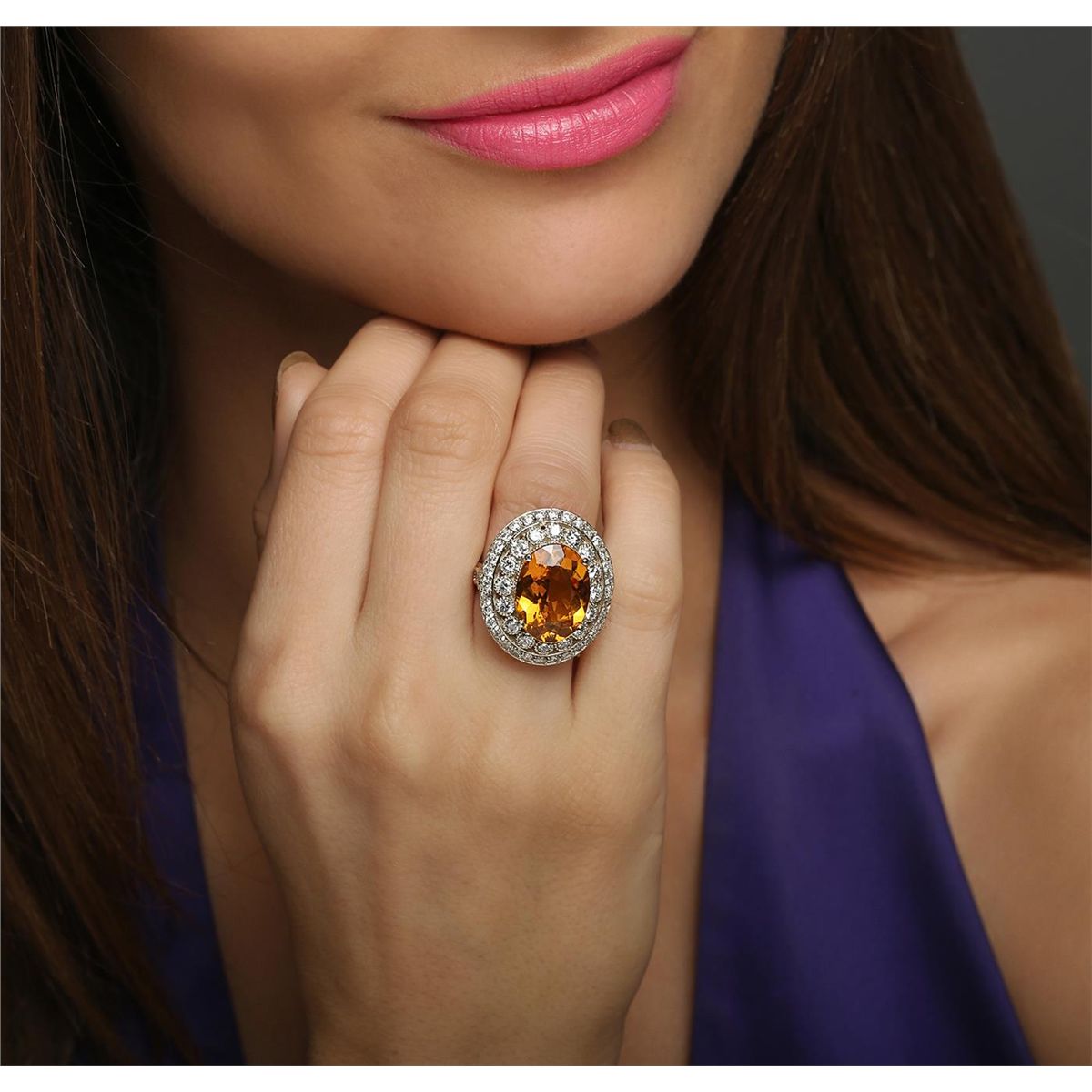 One electronically tested 14KT white gold ladies combination cast & assembled engagement ring with a bright polish finish. Identified with markings of "14K". Condition is new. Containing: One prong set oval modified brilliant cut natural citrine quartz, measuring 26.00 x 12.20 x 7.93mm, approximate weight of 15.39ct., clarity is eye clean, type I, medium light, brownish, orangy yellow color, (GIA oY 4/3), cut is good. Fifty prong set round brilliant cut diamonds, measuring 2.50 - 1.90 x 1.32mm (depth est.) approximate total weight of 50 Stones = 1.95ct. Clarity: SI-2 to I-1. Color: I - J, Cut is Good. Colored gemstones are presumed to have been subjected to commonly used enhancement processes. All diamonds and colored gemstones are graded in the mounting, unless otherwise stated. Total Weight of Colored Stones 15.39ct. Total Weight of Diamonds 1.95ct. Total Weight of Ring 12.00 grams. GGL Appraised at $7,970.00.