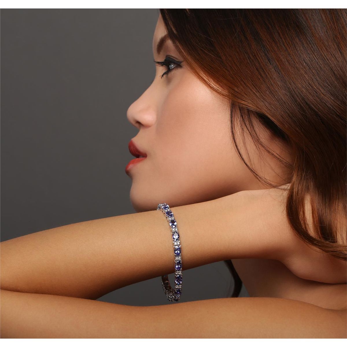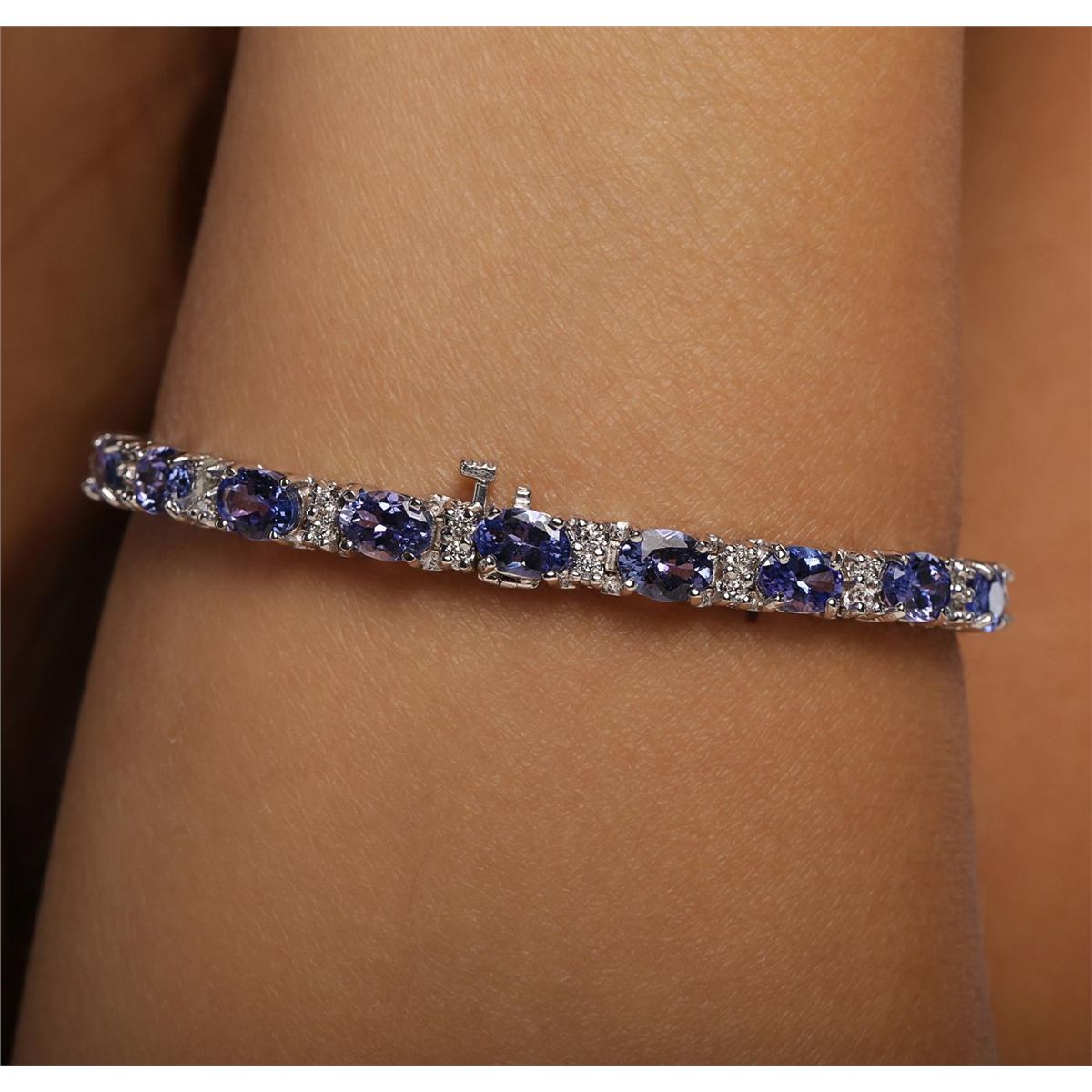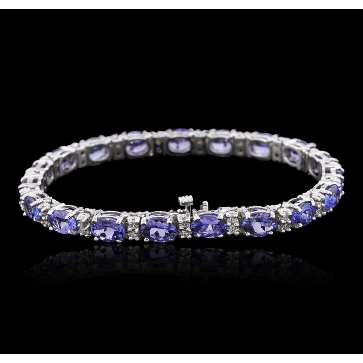 One electronically tested 14KT white gold ladies combination cast & assembled tanzanite and diamond bracelet with a hidden box clasp with a bright polish finish. Measurements: 7" in length. Identified with markings of "14K". Condition is new. Containing: Nineteen prong set oval modified brilliant cut natural tanzanites, measuring 7.00 x 4.90 x 3.43mm, approximate total weight of 15.39ct., clarity is eye clean, type I, medium, moderately strong, violet color, (GIA V 5/4), cut is good. Thirty-Eight prong set round brilliant cut diamonds, measuring 1.60 - 1.60 x 0.96mm (depth est.) approximate total weight of 38 Stones = 0.57ct. Clarity: SI-2 to I-1. Color: I - J, Cut is Good. Colored gemstones are presumed to have been subjected to commonly used enhancement processes. All diamonds and colored gemstones are graded in the mounting, unless otherwise stated. Total Weight of Colored Stones 15.39ct. Total Weight of Diamonds 0.57ct. Total Weight of Bracelet 21.50 grams. GGL Appraised at $14,530.00.